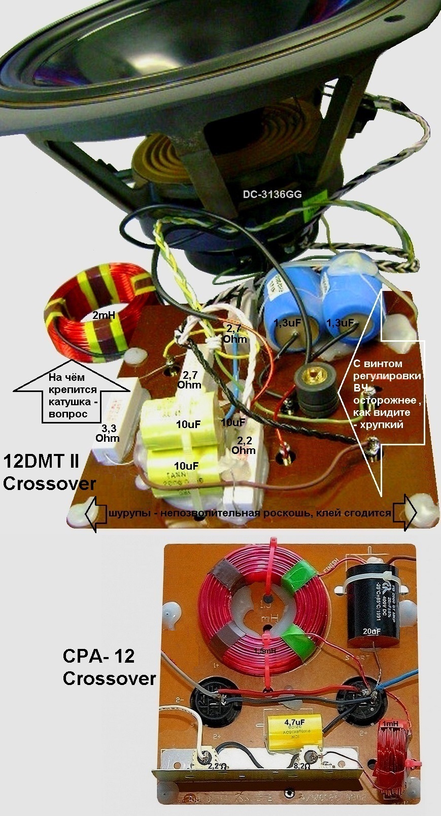 Так что, обладателям любой модификации 12DMT, не подверженным синдрому распальцовки, я бы посоветовал, просто спаять кроссовер от СРА-12 (там и делать то нечего) и поставить взамен оригинального.Последний же вообще не трогать, пусть так и остаётся на своём месте. А вдруг, когда то захотите продать. А вам в качестве покупателя попадётся фирмопоклонник, которому главное чтоб АС были "некопанные", а звук - "фирменным" (!!!). Ибо, иных ориентиров "качества АС" у него нет, так как в музыке он ни в зуб ногой. Согласитесь, таких зомби много.