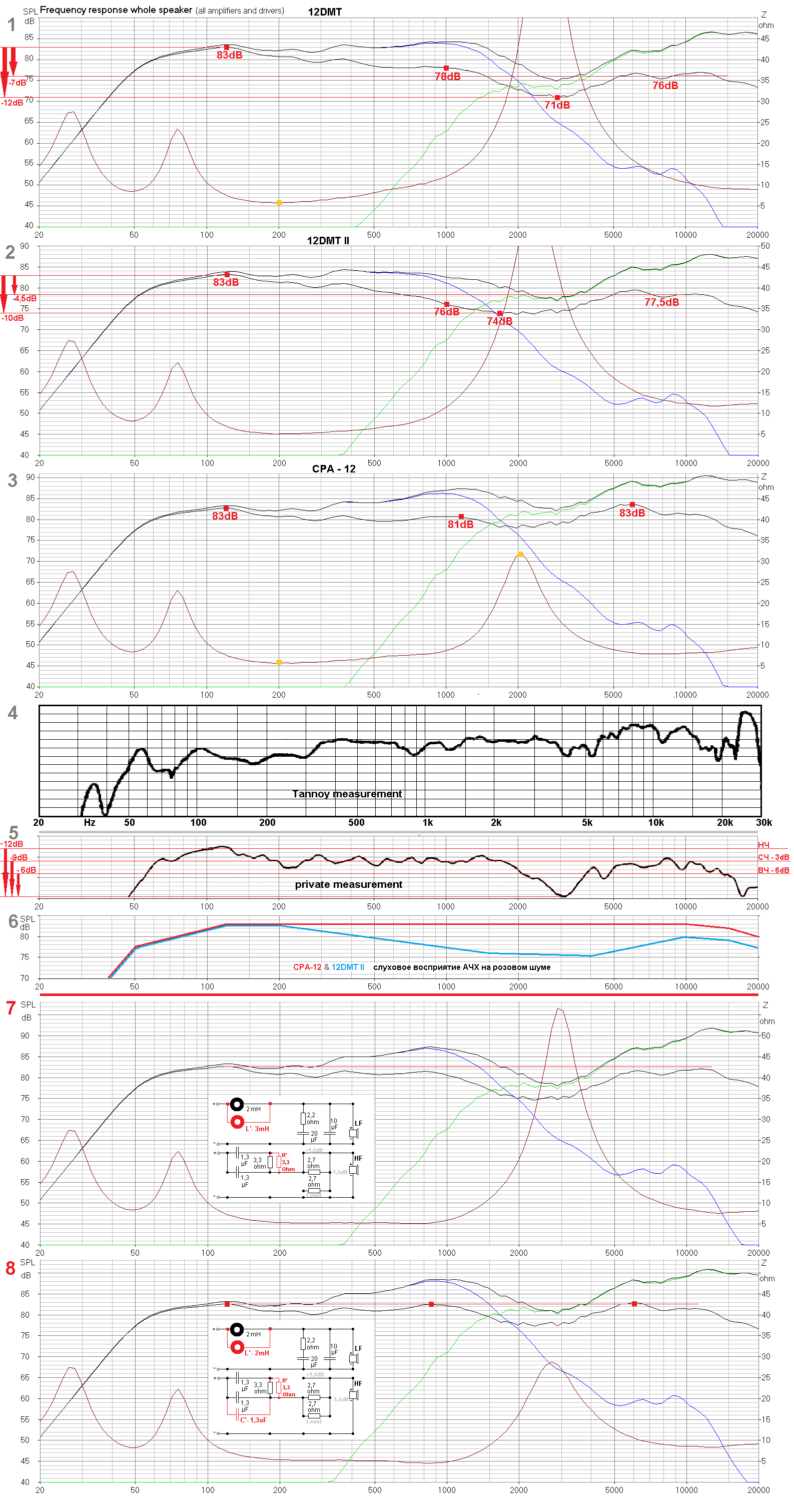 Ладно, предположим, мало ли что могла показать программа, тем более, что она написана не для коаксиального динамика. Лучше смотреть на реально измеренный график 12DMT mk2, ниже. Причем на фирменный, не имеющий ничего общего с реальностью(см.рис.III, график 4), внимания обращать, не стоит. Лучше уж частное измерение, на графике 5. А там ситуация у 12DMT мк2 не лучше. Если относительно НЧ, у СЧ и ВЧ уровень -3dB -6dB соответственно, то провал в районе 3KHz там на целых -12dB!