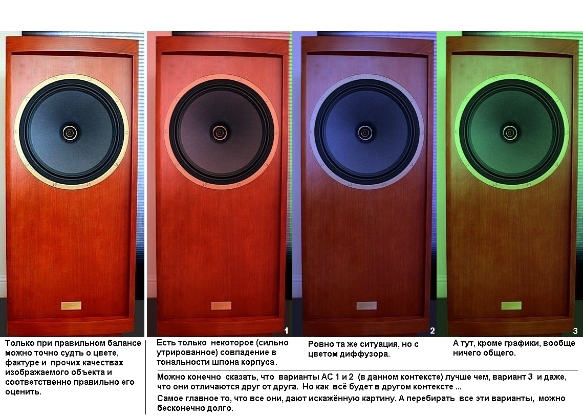 , в аудио (извините за каламбур) всё не столь очевидно. "Жанровость", во всём своём безобразном разнообразии (в виде, к примеру задранных НЧ и ВЧ) стала практически нормой и даже навязывается как несомненное достоинство. Но как не рекламируй, а со временем, любое нарушение баланса "достаёт" и начинается неизбежный поиск новых АС