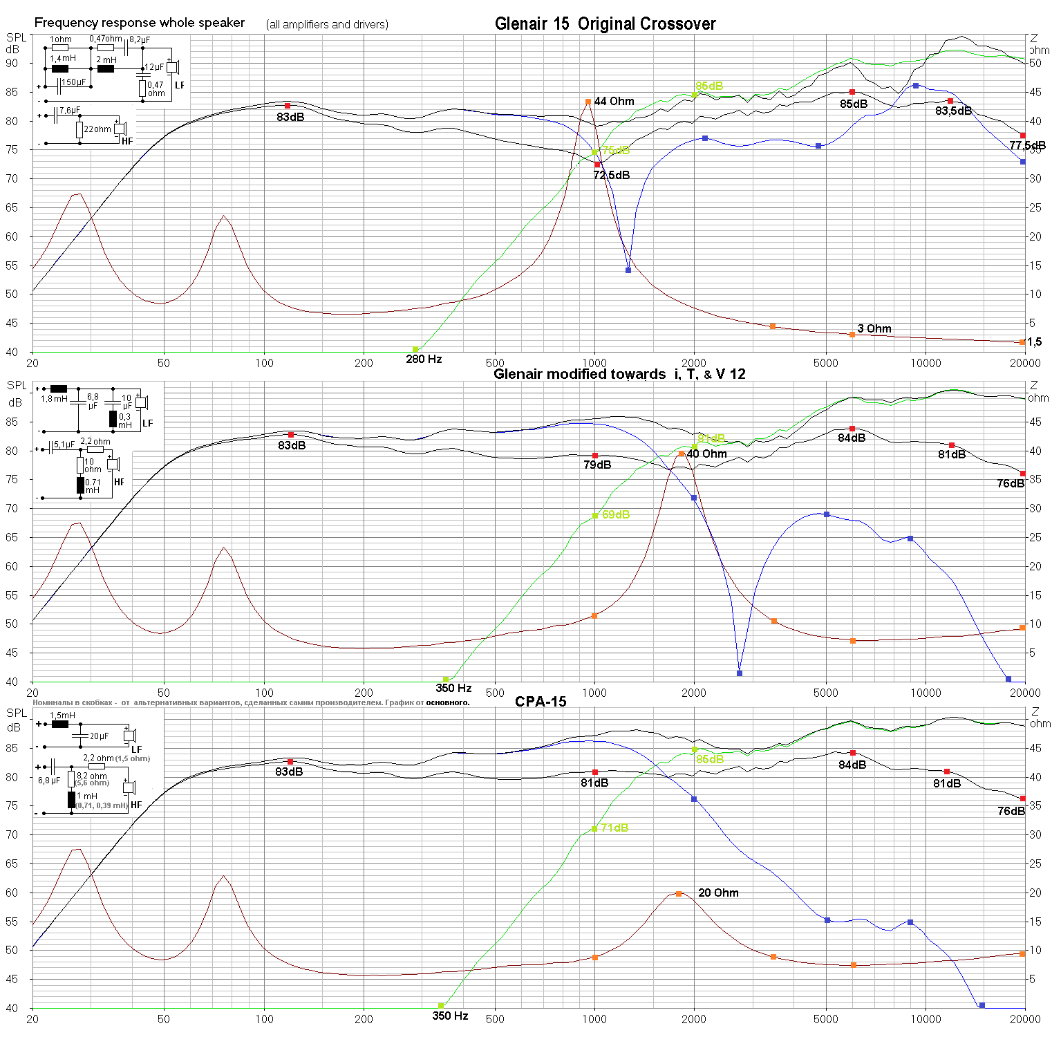 Что в принципе видно даже по графикам АЧХ, хоть на симуляторе, хоть на измеренном. как видите, там басовик (рис.I, синняя кривая) в отличии от Glenair 15, не лезет как очумелый "помогать" пищалке (зелёная кривая), в итоге, оказываясь почти на её уровне. Хотя относительно нормального спада у СРА-15, его активности в районе 5 - 10KHz, всё-же ненормальна.Нечего ему там резвиться. Вот никак не пойму смысла этой их, относительно новой извращенческой фишки, в виде 15" лопухов, исполняющих роль пищалок, которая в Glenair 15, доведена до абсурда.