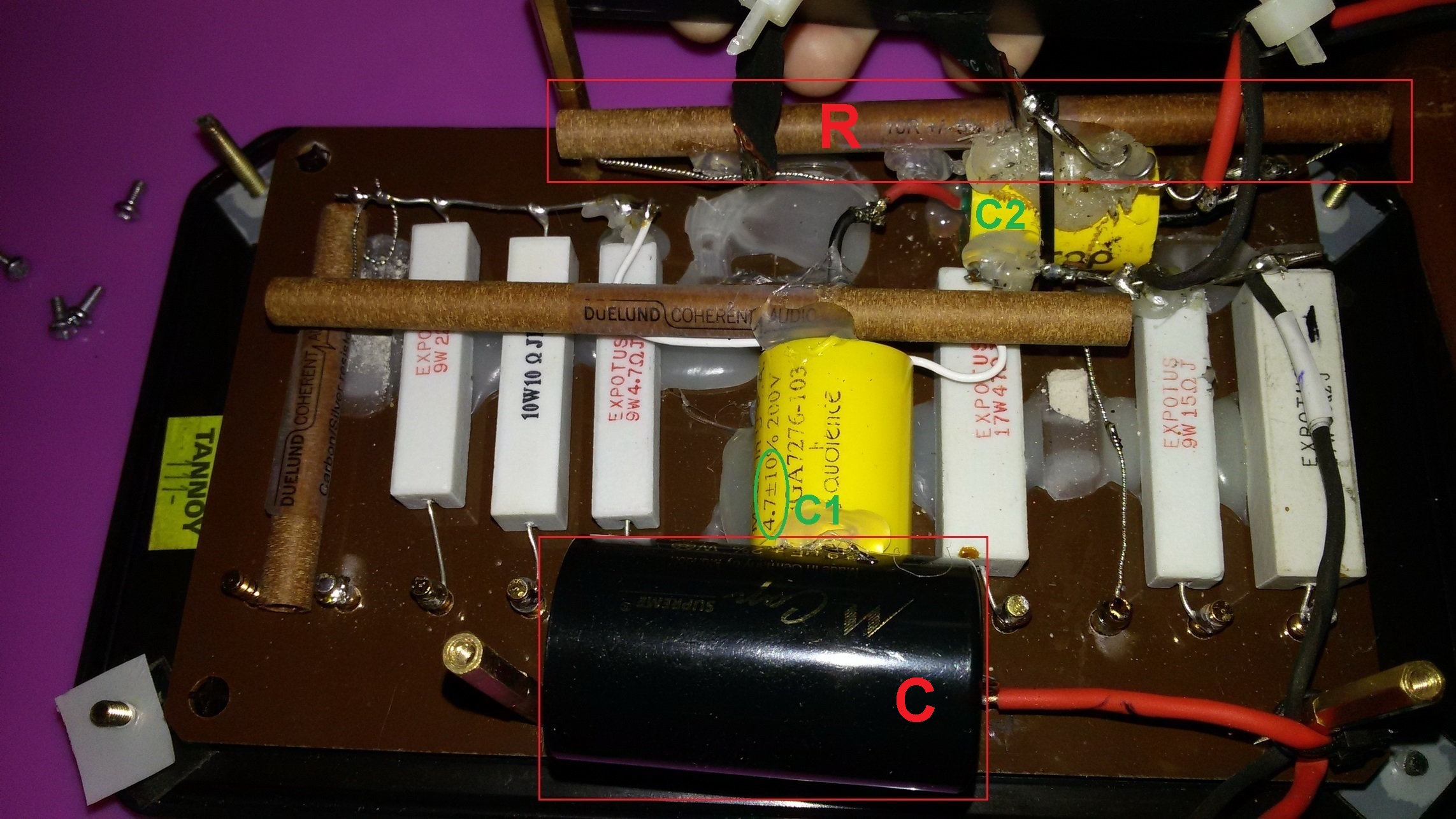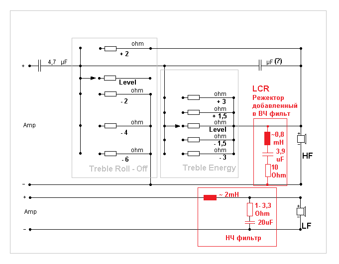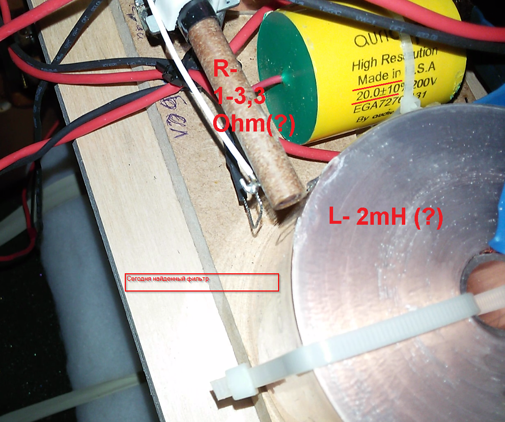 К сожалению, схемы (точной) от Edinburgh HE, у меня так и нет. Дело в том, что человеку их продали, с переделанными кроссоверами. И узнал он об этом, только недавно. Как видите, там полный бардак. Пара резисторов в фильтре ВЧ, просто вырвана "с мясом". А теперешний хозяин АС, в этом не силён. Кстати, судя по конденсатору С1 - 4,7uF в НЕ, против 3,9uF в TW, ВЧ фильтры всё же отличаются. А номинала С2 и вовсе не видно. Возможно он 3,9uF, а возможно 3,3uF, или меньше (видимо таким образом, в связи с изменение НЧ фильтра, меняли наклон АЧХ ВЧ. Да и номиналы резисторов (с той же целью)иные. Единственное что я могу предположить, так это - введение LCR режектора в ВЧ фильтр и замена катушки на "крутую" ленточную, с добавлением резистора (видать фирменного провала СЧ, показалось мало) в НЧ фильтр. И то и другое, как на фотографиях, так и на схеме выделил красным. Вот что за манера копать, готовое изделие. Хочешь что то сделать, так и делай отдельно свой кроссовер, от начала и до конца. Отключи оригинальный и подключи свой. Нет же, воткнул туда, эти долбанные дуелюнды. Ну не ахти звучал оригинальный кросс, но хотя бы аккуратно выглядел. А так и вид изгадил и звука не получил. Мало было фирменной тухлости звука, так он ещё режектор на ВЧ и фильтр с повышенным реактансом (резистор) на НЧ сделал. Видать всё по учебнику и наверняка измерял даже что то, но вряд ли то что надо. А в конце, убедившись на собственной шкуре, что не зная нюансов и тупо следуя поваренной книге, съедобного блюда не приготовить - продал всё это. Причём, с обманом!