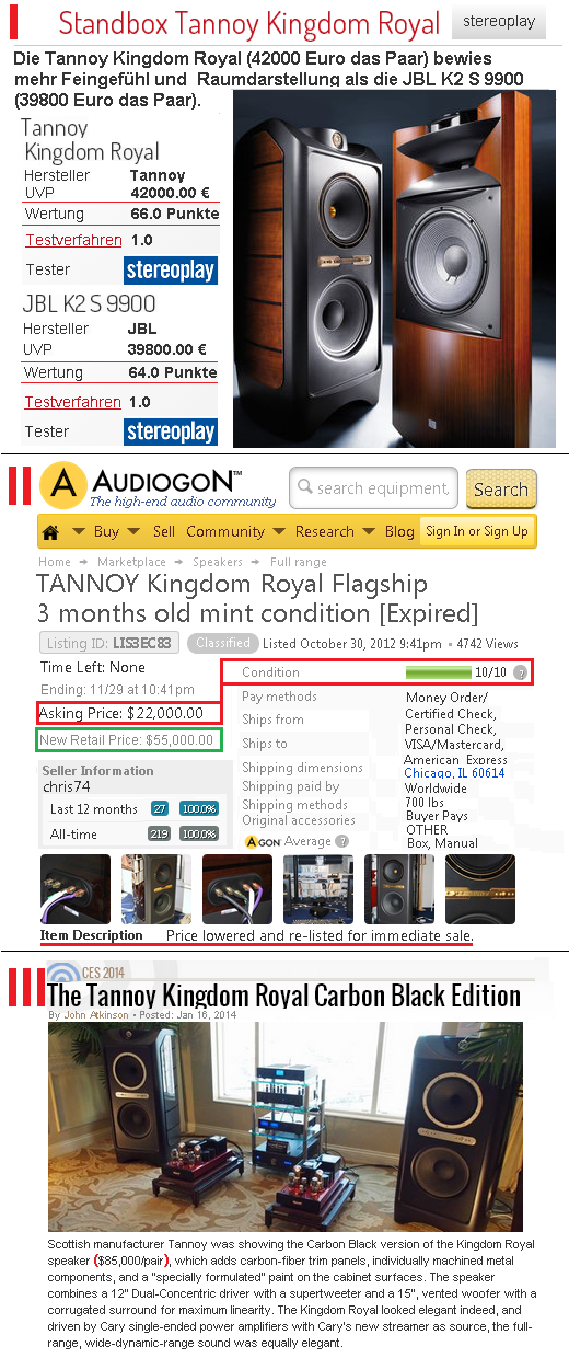 Начав в конце 2010 года с цены $55 000 за Kingdom Royal, к 2014 году, сделав сначала Red Edition, а потом и Black Edition, довели цену до $85 000. Отсюда возникает вопрос - вменяемые ли люди управляют бытовым сектором Tannoy? Я конечно понимаю, что вся эта муть хайэндовская, адресована исключительно нуворишам, которых грех не обобрать, деньги то у них ворованные. Но когда, даже представитель упомянутого сословия, всего через три месяца, выставляет её на продажу (ты гляди - меломаном оказался), меньше чем за пол цены, лишь-бы поскорее избавиться,