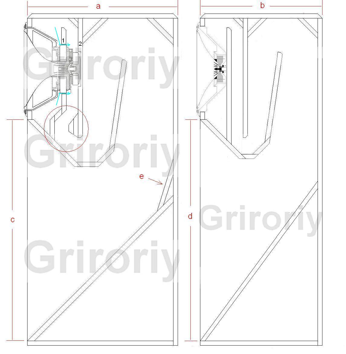 А если, в нормальный свёрнутый рупор, поставить ещё и нормальный динамик - Yadrena Romashka, то при неизменном размере устья ("c" и "d"), т.е. при неизменной частоте среза рупора, получим корпус АС, в 1,25 меньший по глубине ("а" и "в"), с гораздо меньшими ухищрениями и соответственно необходимыми для постройки АС, деталями. Не надо делать, здоровенных сквозных отверстий в панели №1 (чтоб не сифонило из предрупорной камеры в канал рупора, да и магнит не будет находится на пути волны сигнала, в канале рупора, тем самым, внося возмущения в её фронт), а также, углубления в панели №2 и дополнительного зеркала "е".