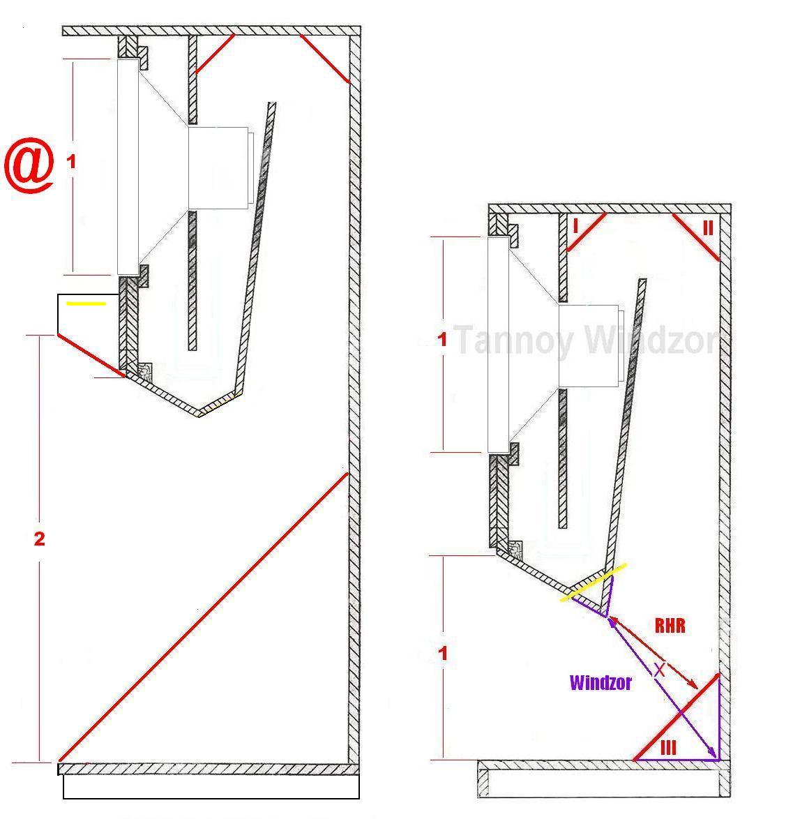 Вдобавок ко всему, в модели Windzor GRF, в отличии от RHR нет "зеркал № 1, 2 и 3. Видать им не положено, ведь они не "special limited", от наличия коего, у британцев, видать и законы физики меняются. Кроме того, вдобавок к кошмарному виду без декоративной решётки, в разных вариациях модели, динамик стоит то в центре, то нет. Не говоря уже о том кошмаре, что кроссовер и прочие причиндалы, расположены в самом рупоре. Ведь это, даже с точки зрения эстетики неприемлемо. Вот ведь кустарщина голимая!!! Но, даже в RHR, несмотря на его спейшал лимитность, эти умники, не дотумкали срезать (по указанной красным прямой) этот кошмарный выступ № 4, превращающий эти недорупоры, вообще чёрт знает во что.Ну и вдобавок ко всему, эти дегенераты, вместо того, чтоб сделать устье рупора максимально большего размера, ибо, чем оно больше, тем ниже частота среза рупора, сделали его раза в два меньше, чем могли бы, даже несмотря на то, что в в итоге, АС получились весьма приземистыми.