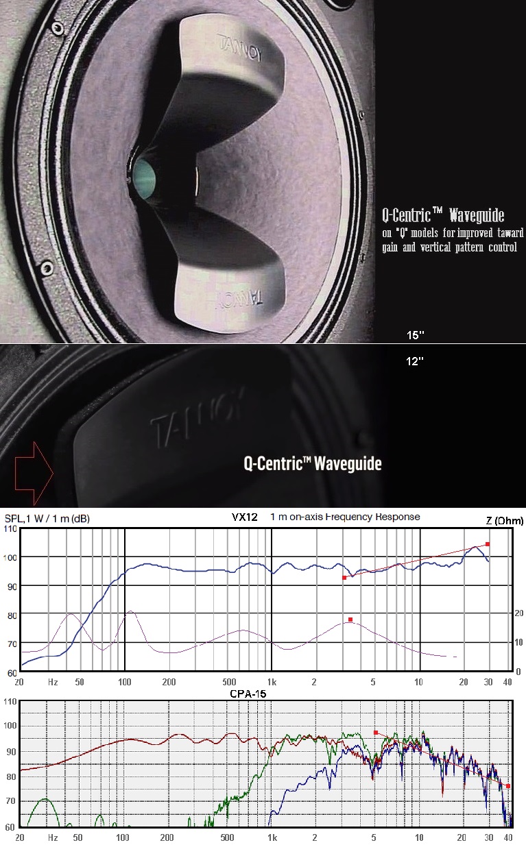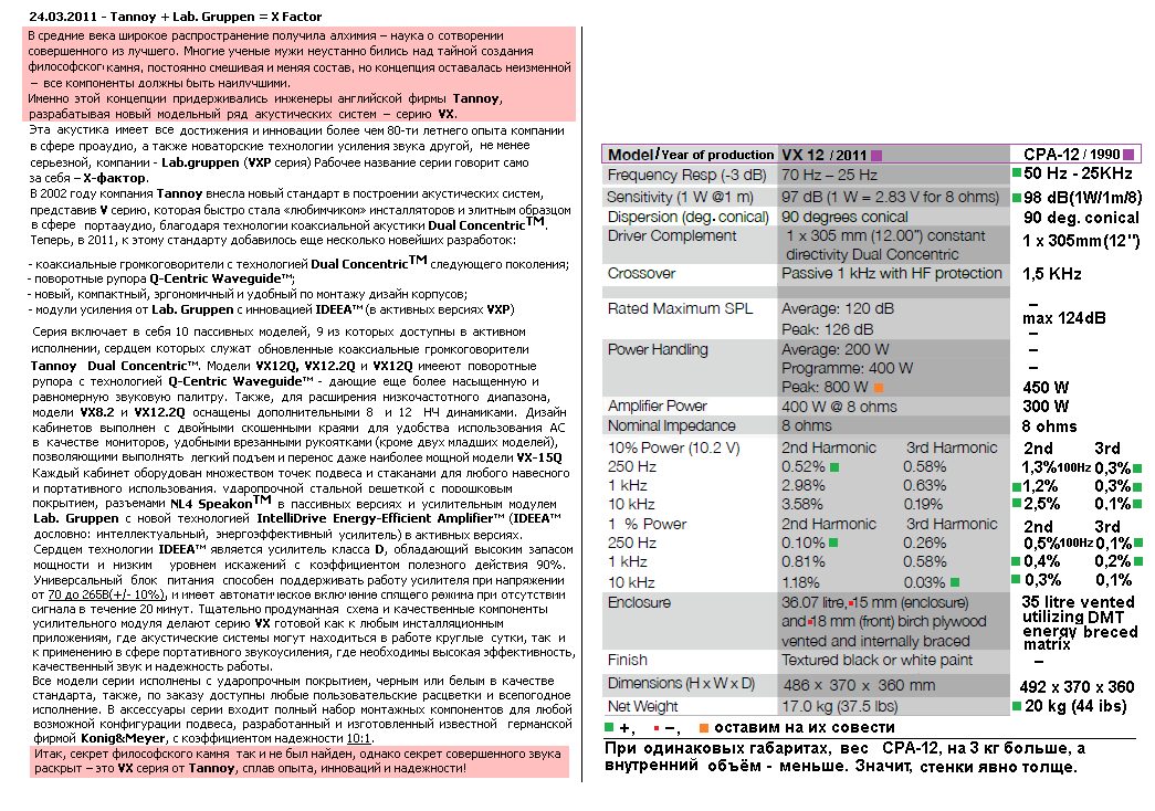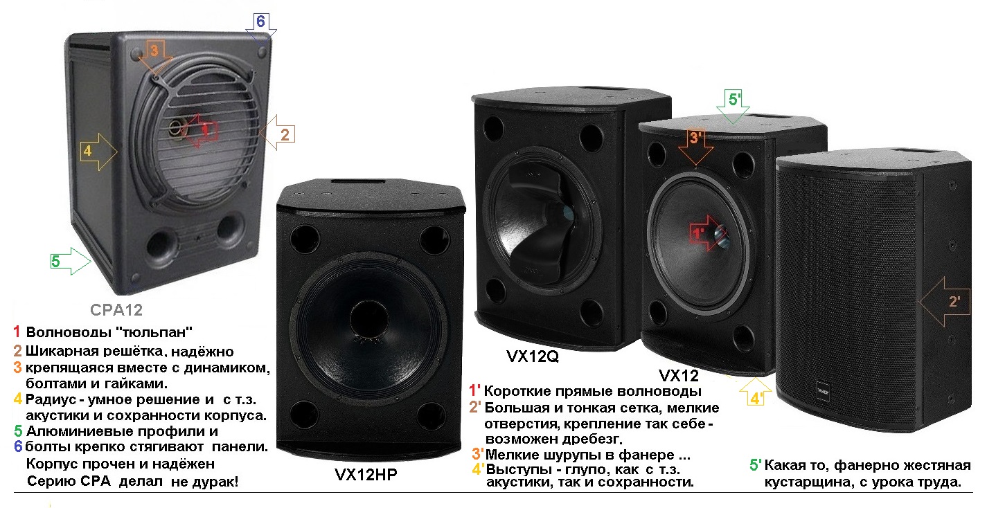 А теперь, после акта надругательства над собственным разумом, в виде прочтения этой мути, пестрящей дивными аббревиатурами типа "IDEEA", немного о том, есть ли у них на деле толковые идеи и что они там "нашли". В принципе, достаточно только сравнить, технические характеристики VX12, с СРА-12 в том же файле I, ниже, чтоб убедится в том, что текст выше, был именно словоблудием и ничем более. Ибо, выпущенная через двадцать один год после серии СРА, серия VX, уступает ей практически по всем пунктам. Так что, думаю стоит рассмотреть это чудо современной технической мысли горцев, немного подробнее.Но так как последняя комплектуется (в размерах динамиков 12" и 15" , которые сейчас и рассматриваются) как компрессионным, так и не, ВЧ звеном, то этот момент придётся рассматривать по-отдельности.