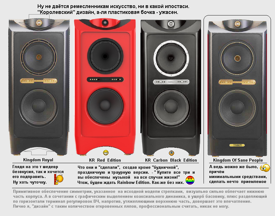 Я конечно понимаю, что в данном сегменте есть и такие АС, как TAD Reference One, с ценой почти $110 000, а по музыке ничуть не лучше KR. Но зачем же равняться на ещё более тяжёлые случаи. От которых, волей неволей, возникают ассоциации с известным анекдотом девяностых годов - как двое "новых русских", выехав в Европу отоваривались.