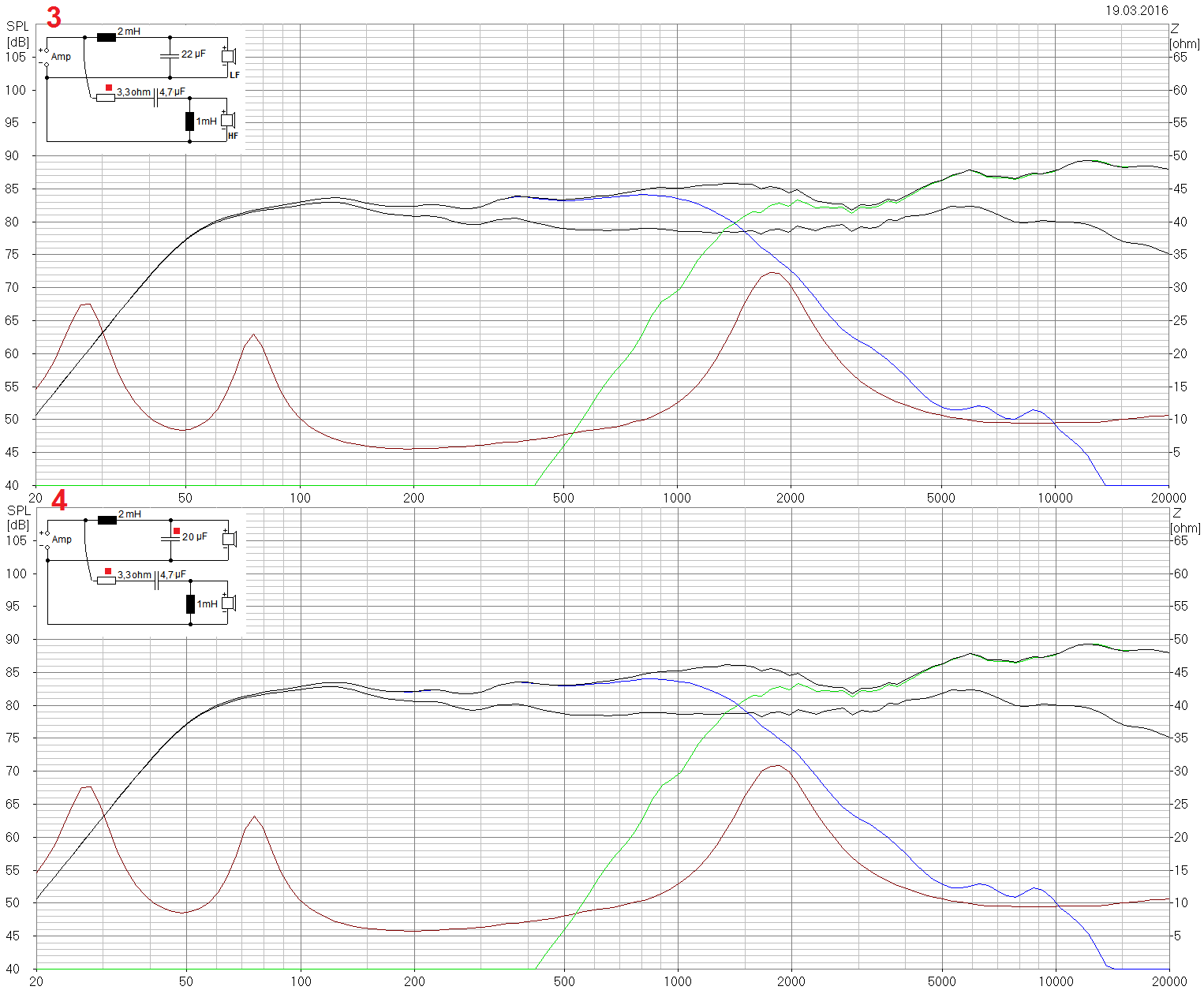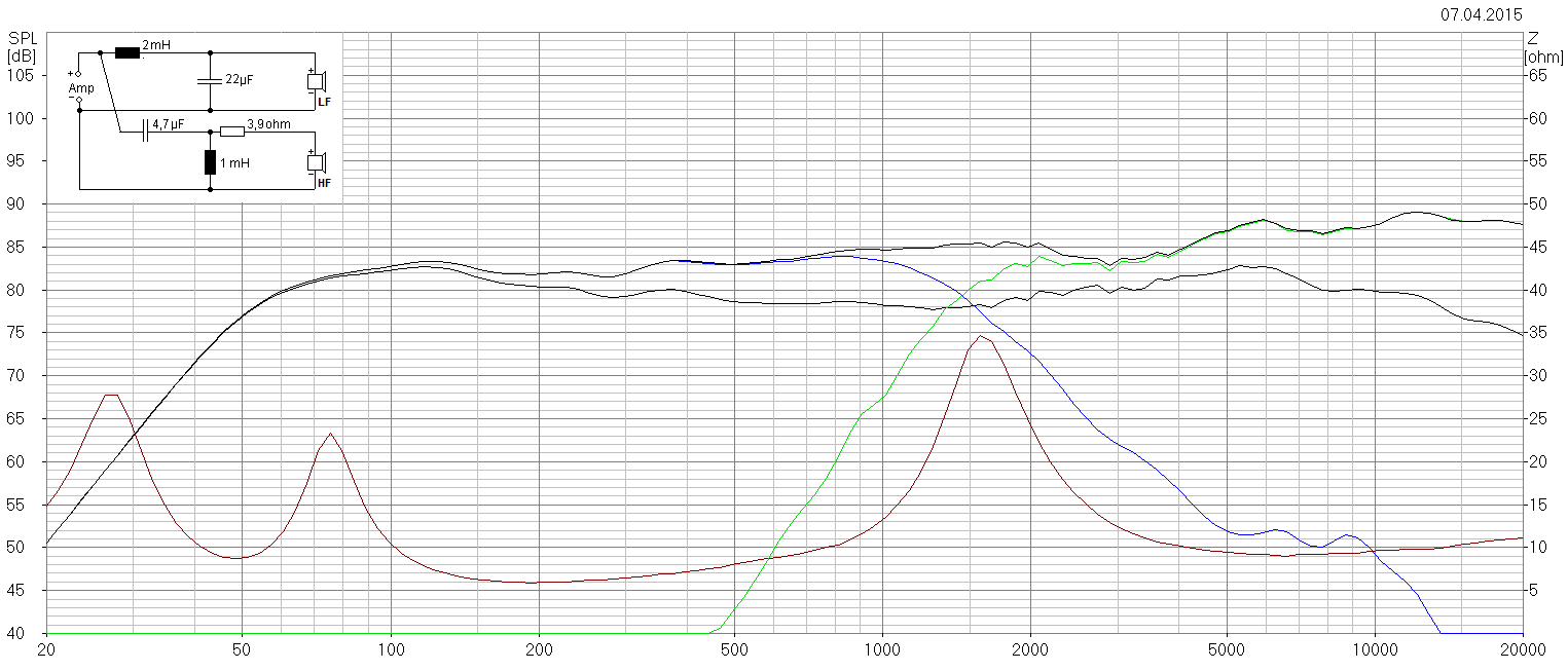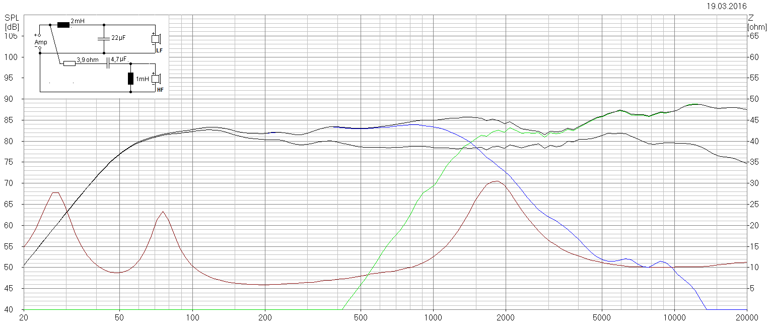 Спасибо за фотографии. Кстати, можно сделать и так, используя имеющийся в кроссовере резистор 3,3 Ohm. Но тогда, возможно понадобится, уменьшить номинал конденсатора с 22uF, до 20uF. Как видите, на графике, даже ровнее получается.