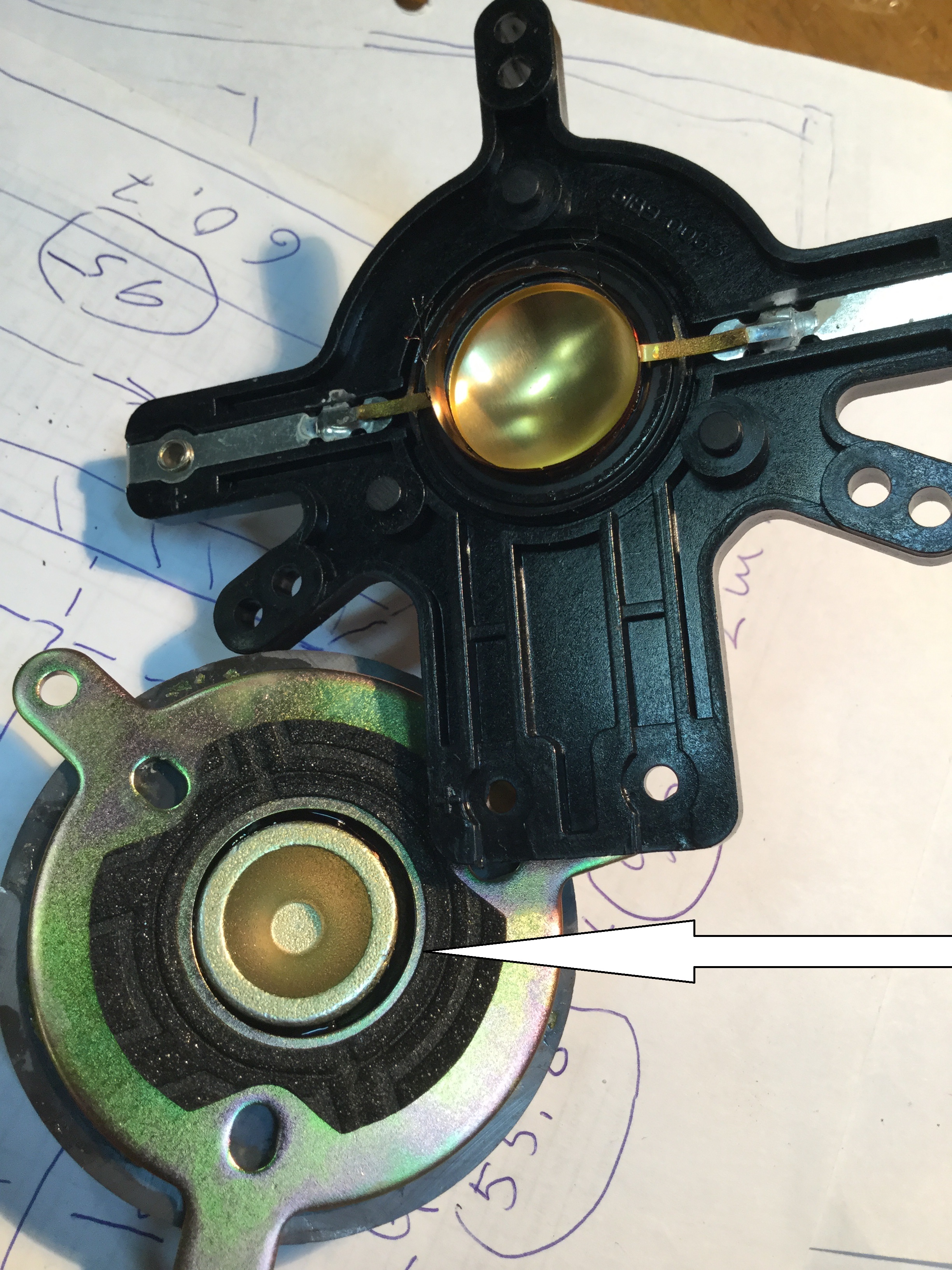 Сам ремонт. Аккуратно разъедините площадку от магнита , не допускайте ударения шайбы о магнит , так как магнит этого не любит.Он от этого размагничивается и это влияет на воспроизведение частот с 10000 гц и выше. Зачищаем от старого клея поверхности склеиваемых деталей , я делал это стамеской.Хорошо обезжириванием и не толстым слоем мажем эпоксидным клеем. Соединяем шайбу с магнитом и центруем при помощи приготовленных проставок.Я их делал из пластиковых хомутов.После высыхания собираем ,не забываем долить охлаждающий-демпфирующий жидкость. Есть люди которые доказывают , что без нее пищалка лучше играет.Скоро проведу и этот опыт.