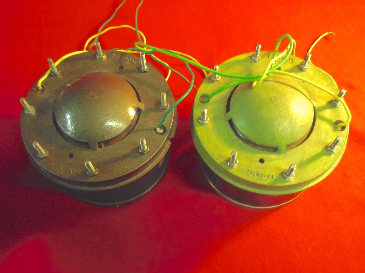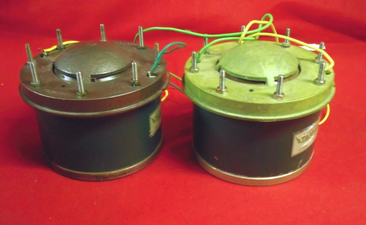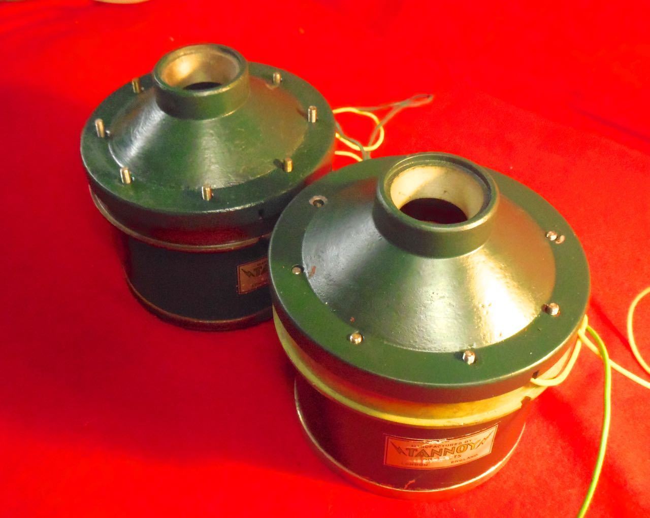 Пара старинных рогов Tannoy Т .... исключительно редко. Первоначально разработанный для зрительных залов, концертных залов или коммерческих приложений. (Вероятно, возвращаясь к середине 60-х ') Я использовал их в качестве рогов среднего диапазона. с точки зрения звука, который они показательны и подробный середине диапазона. Я пошлю их с роговой адаптерами, вы используете их так, как они есть, или вы можете использовать их выбрал ваш роговых линз. У меня было пару Altec multicel Хорн и они работали очень хорошо с ними. Один из диафрагмы крышки окрашены в разные цвета. Я изображая их с компрессионным драйвером Vitavox для того, чтобы дать вам представление о размере