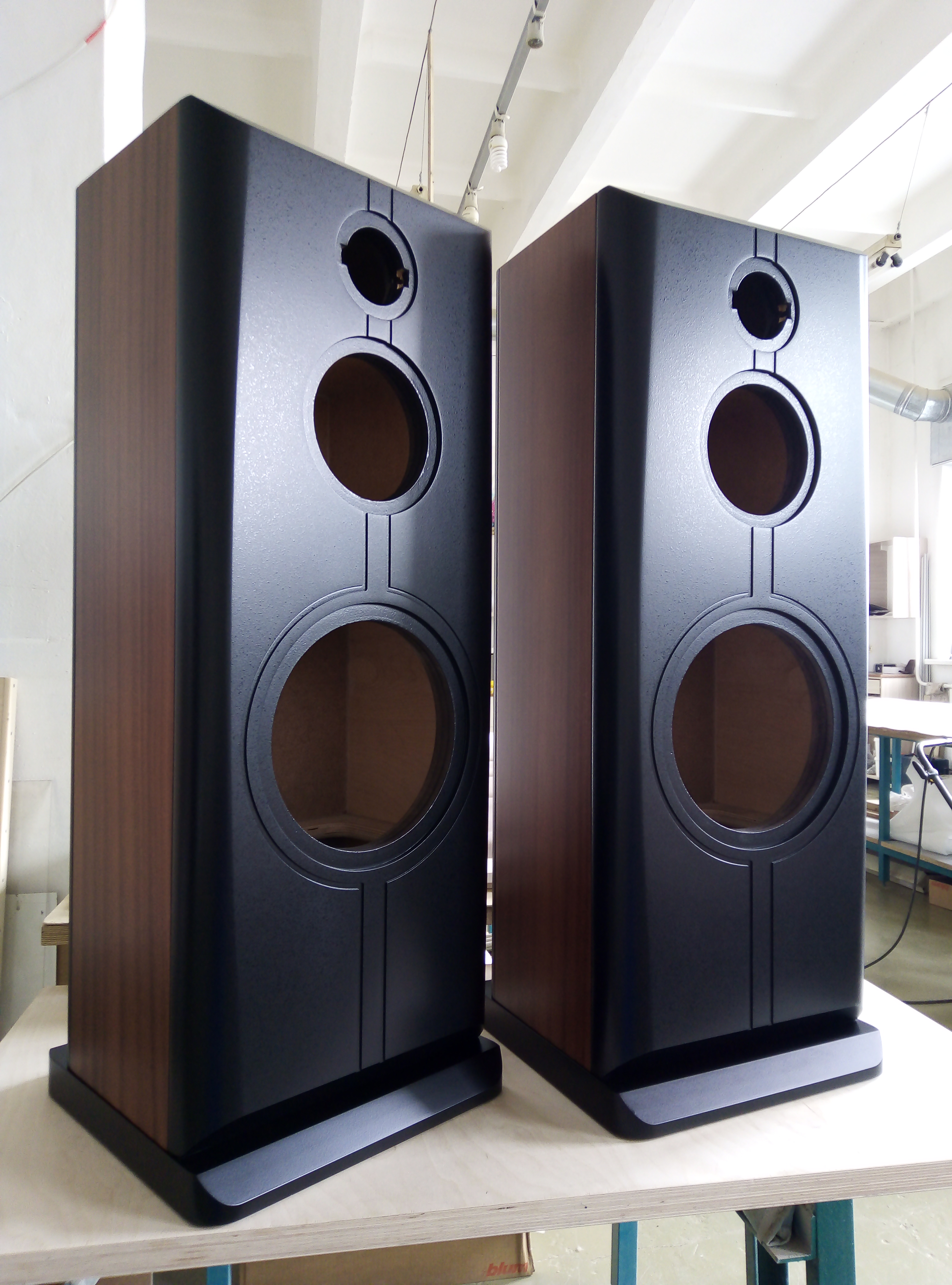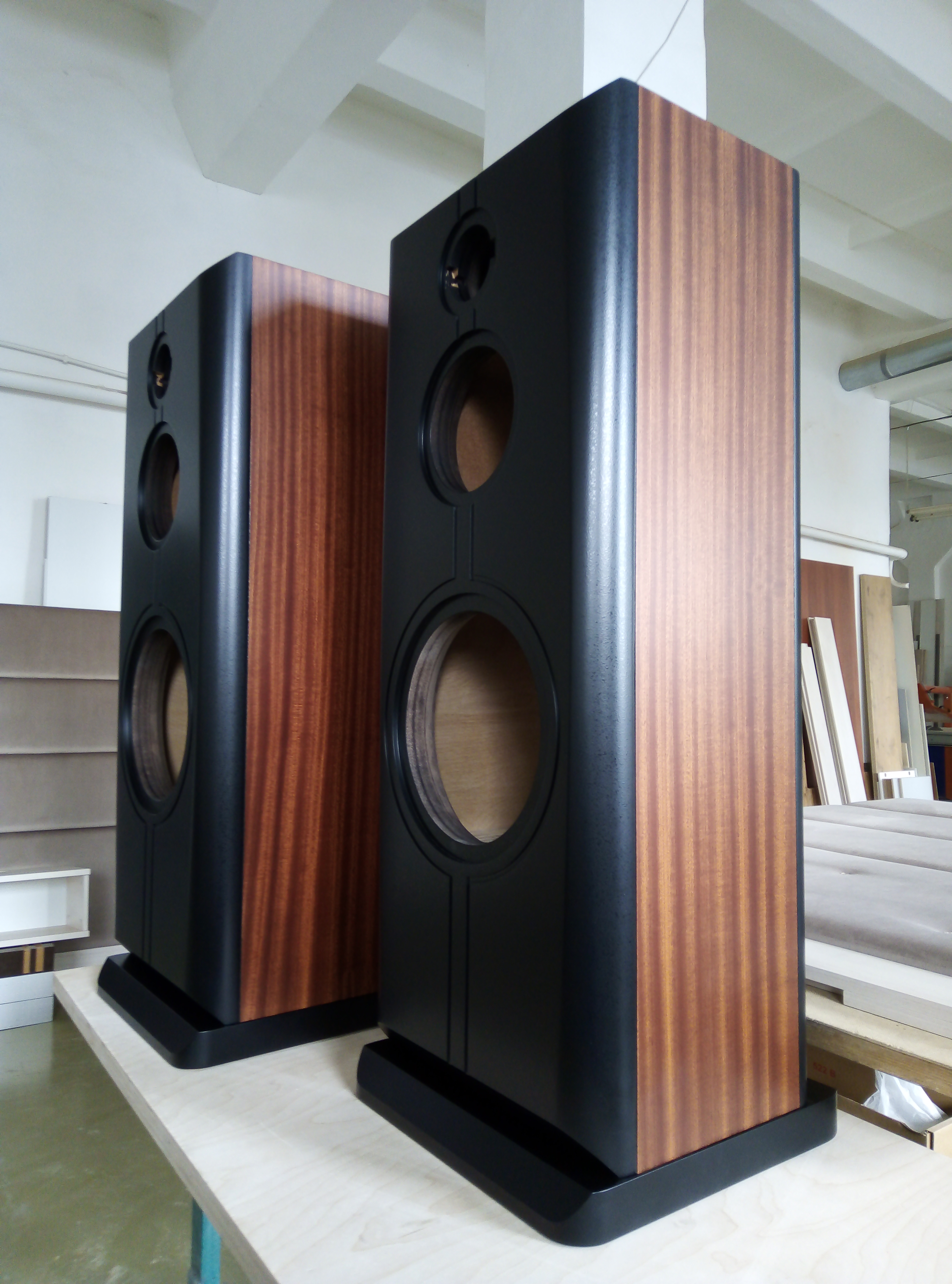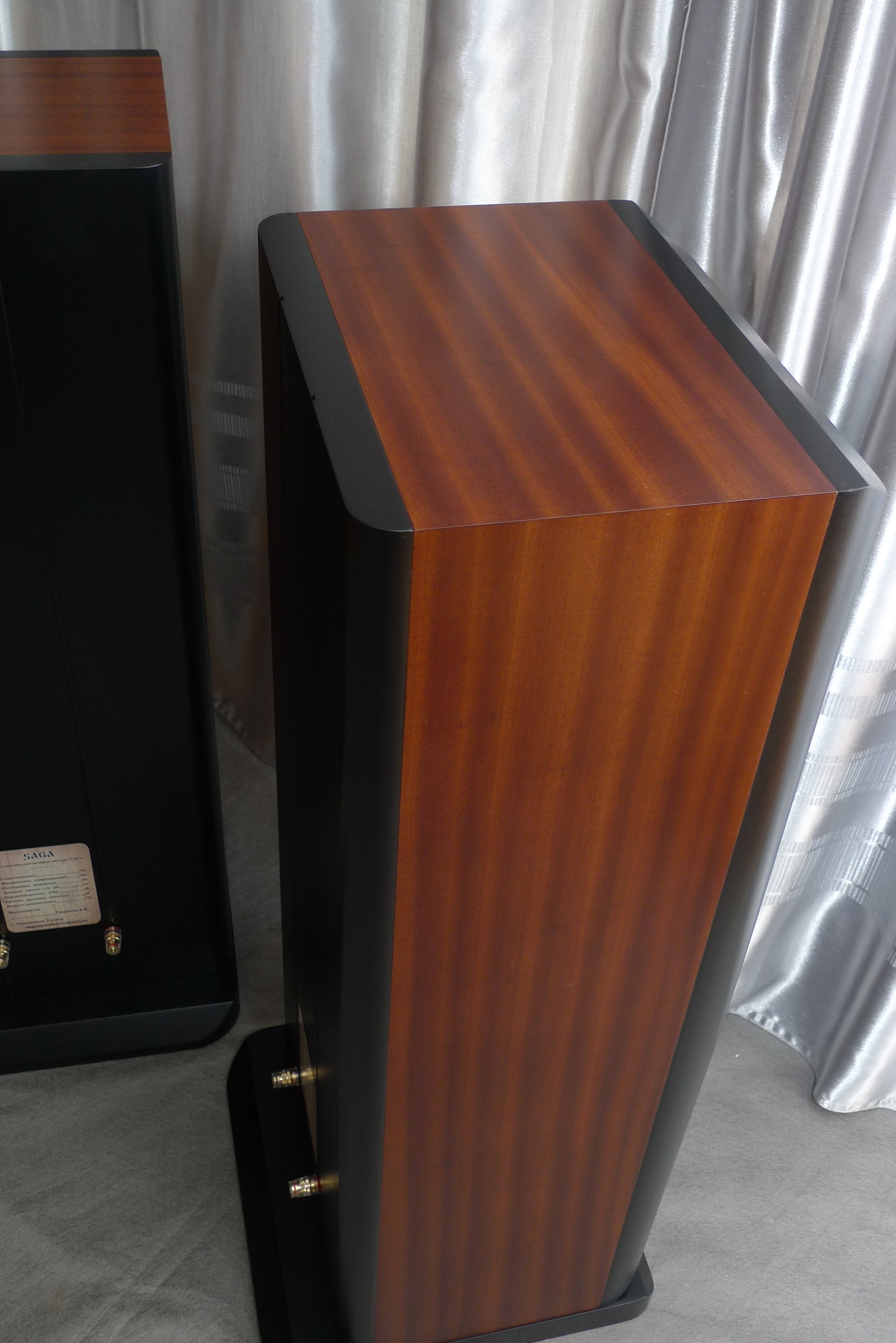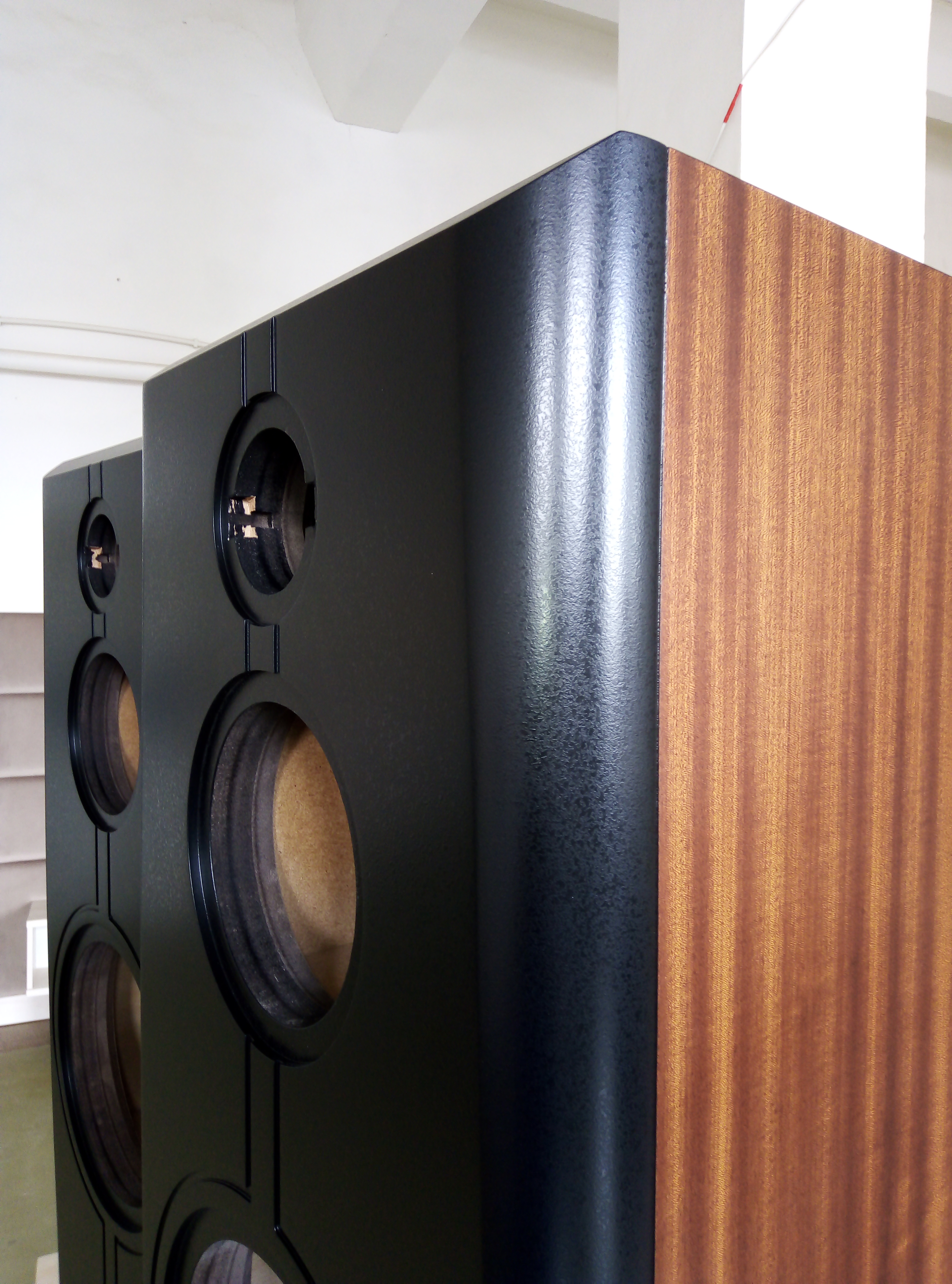 Корпус в 65 литров, закрытый ящик; наглухо, даже отверстие в сч-бокс от басового объема закупорено "саудалом". Передняя плита толщиной 54, в четыре слоя - три МДФ и внутренний - фанера, задняя плита чуть тоньше - 32 мм, основа - фанерный корпус из мебельной фанеры, 21 мм, и поверху крытый темным махагоном, на нем, в свою очередь, три слоя грунта (для выделения глубины рисунка) и жирный слой полиуретанового "Сайерлак". Передняя и задняя плиты обработаны отдельно - также в несколько слоев разноцветного грунта, поверху какая то хрень - среднее между антивандалкой и кожей. Смотрится интересно. Передняя-задняя плиты состыкованы с основным корпусом и вся готовая конструкция целиком, под занавес, облита еще одним слоем лака.