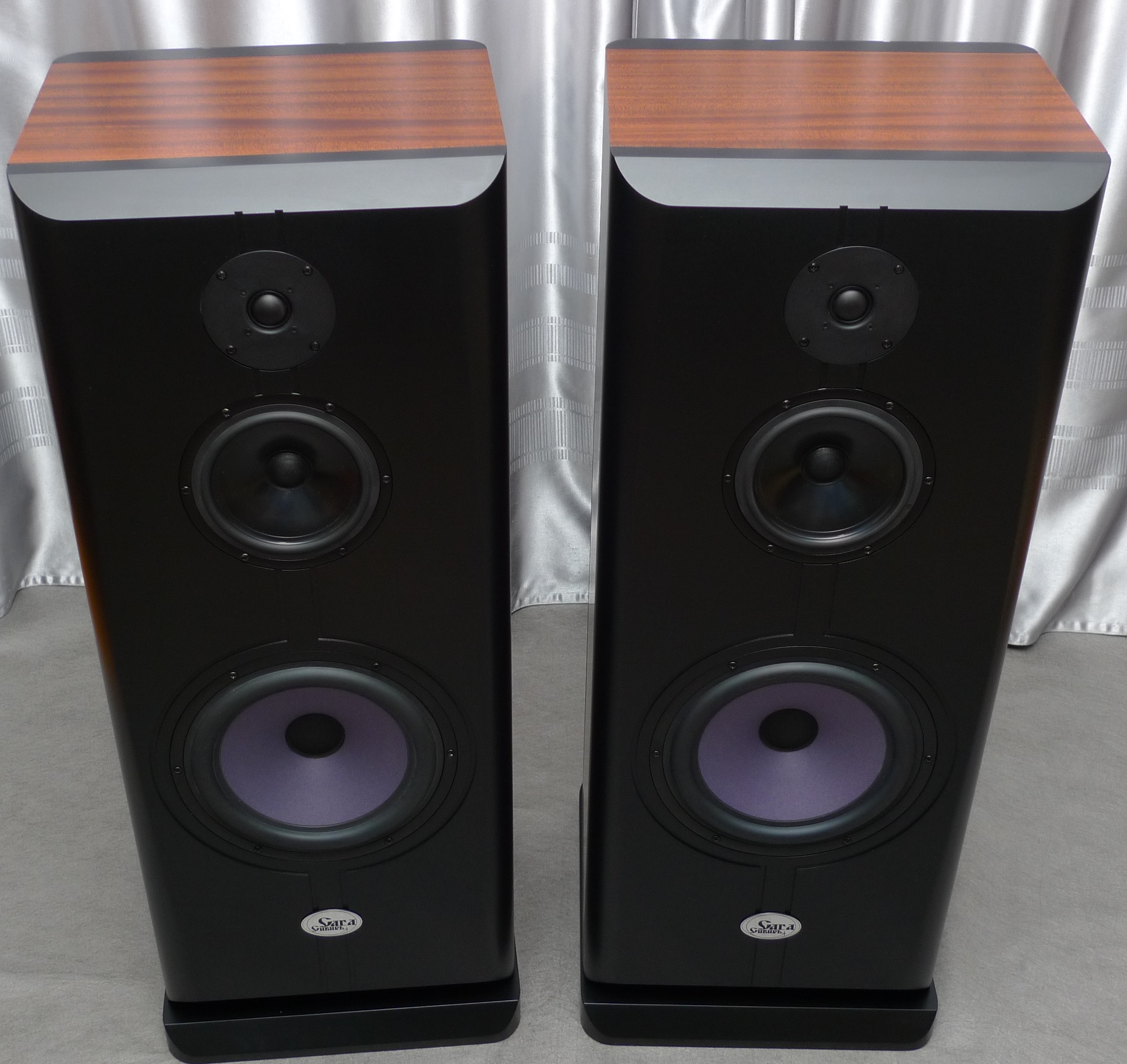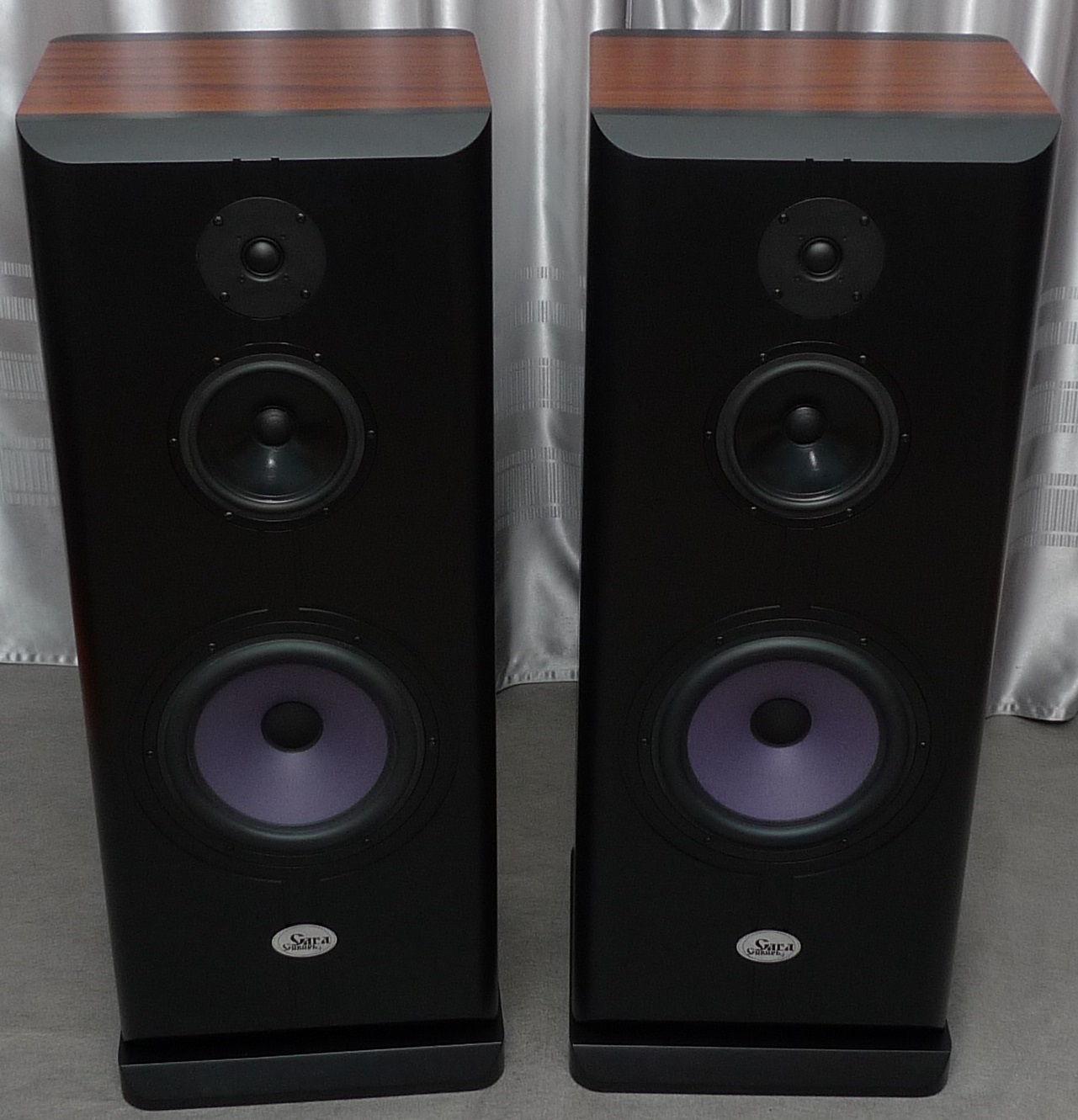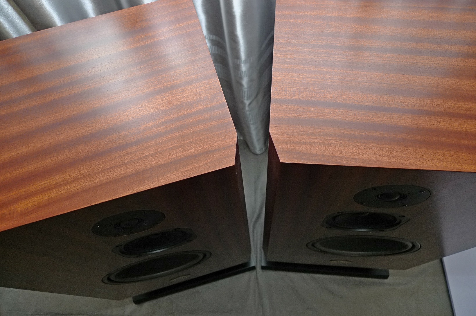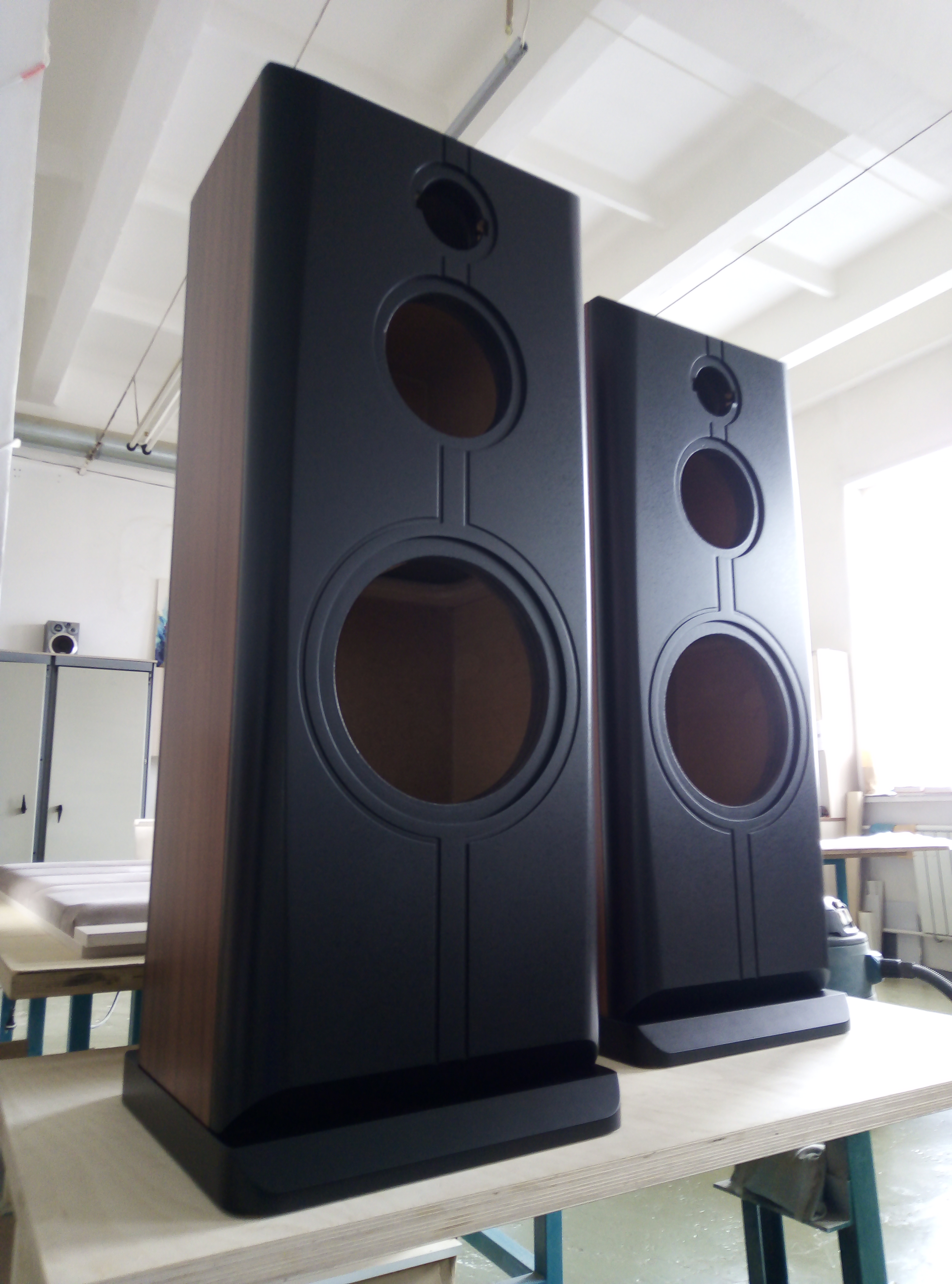 Корпус в 65 литров, закрытый ящик; наглухо, даже отверстие в сч-бокс от басового объема закупорено "саудалом". Передняя плита толщиной 54, в четыре слоя - три МДФ и внутренний - фанера, задняя плита чуть тоньше - 32 мм, основа - фанерный корпус из мебельной фанеры, 21 мм, и поверху крытый темным махагоном, на нем, в свою очередь, три слоя грунта (для выделения глубины рисунка) и жирный слой полиуретанового "Сайерлак". Передняя и задняя плиты обработаны отдельно - также в несколько слоев разноцветного грунта, поверху какая то хрень - среднее между антивандалкой и кожей. Смотрится интересно. Передняя-задняя плиты состыкованы с основным корпусом и вся готовая конструкция целиком, под занавес, облита еще одним слоем лака.