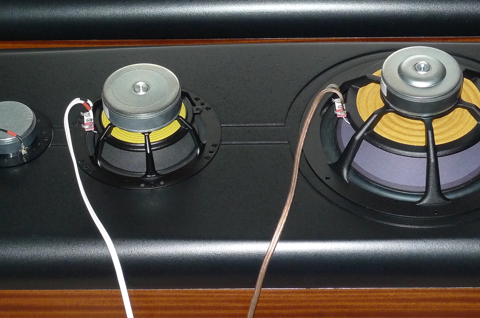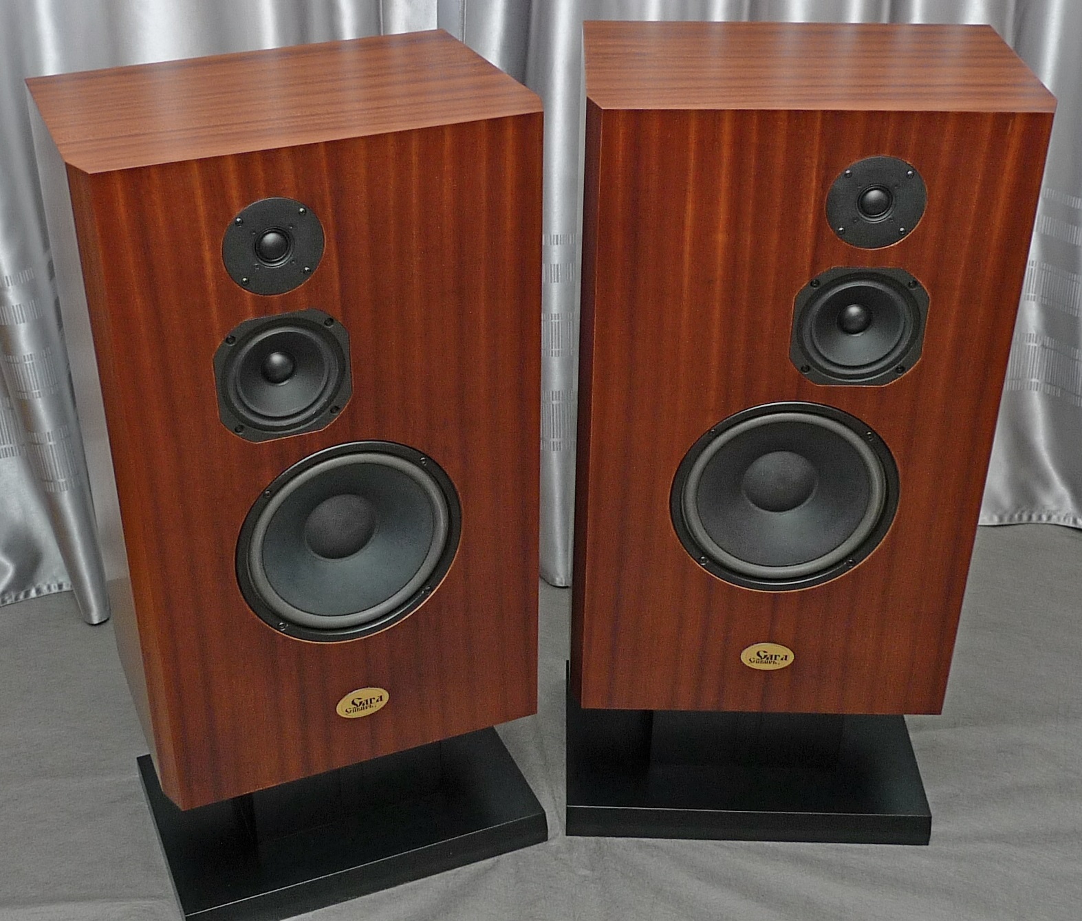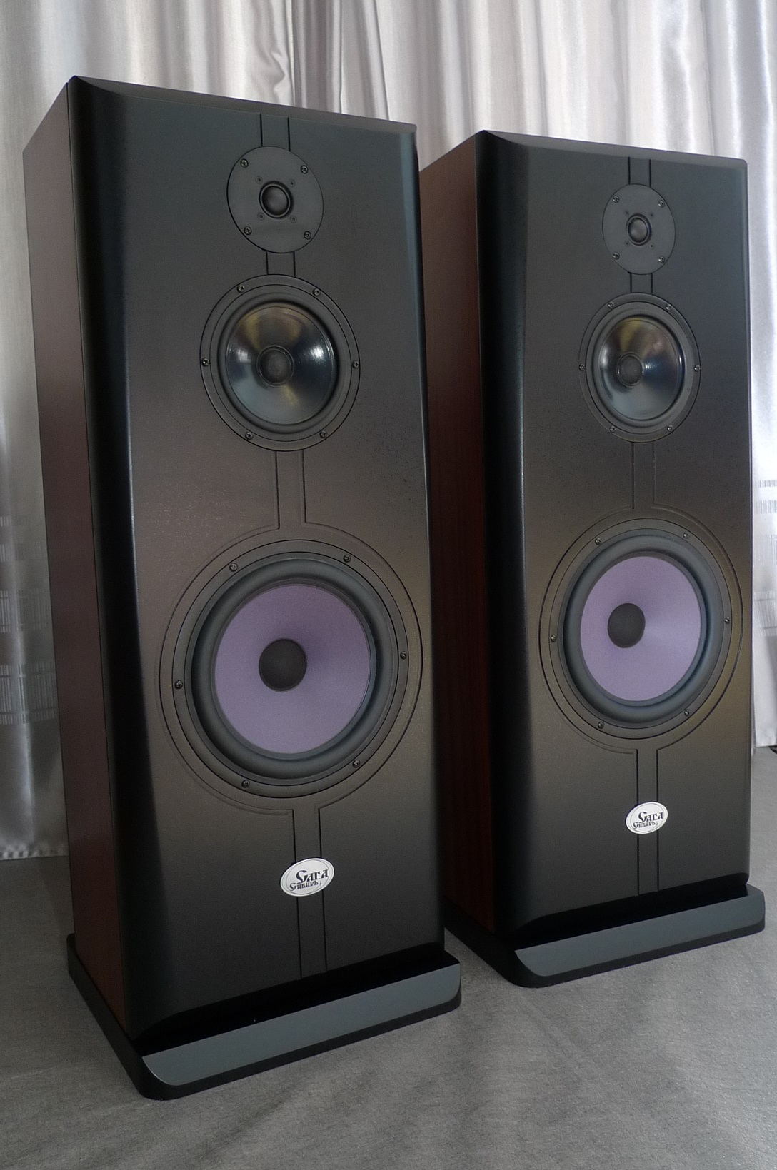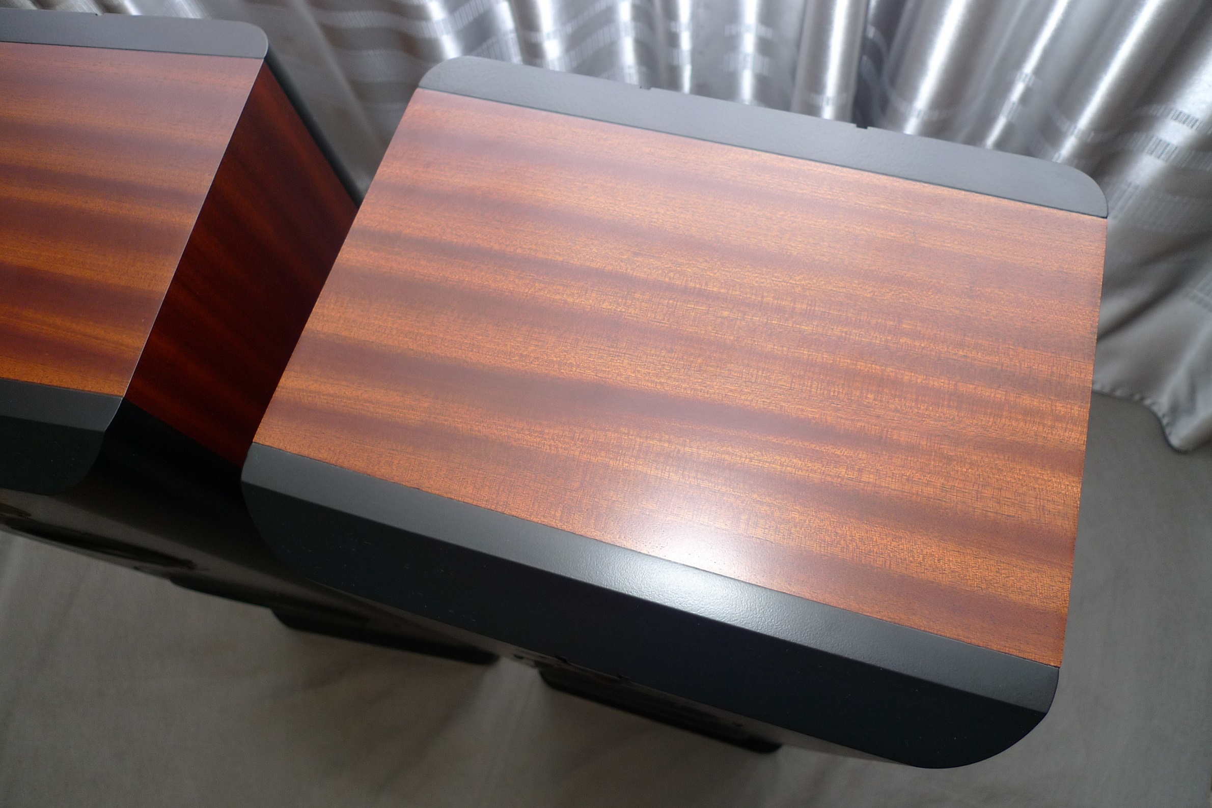 Корпус в 65 литров, закрытый ящик; наглухо, даже отверстие в сч-бокс от басового объема закупорено "саудалом". Передняя плита толщиной 54, в четыре слоя - три МДФ и внутренний - фанера, задняя плита чуть тоньше - 32 мм, основа - фанерный корпус из мебельной фанеры, 21 мм, и поверху крытый темным махагоном, на нем, в свою очередь, три слоя грунта (для выделения глубины рисунка) и жирный слой полиуретанового "Сайерлак". Передняя и задняя плиты обработаны отдельно - также в несколько слоев разноцветного грунта, поверху какая то хрень - среднее между антивандалкой и кожей. Смотрится интересно. Передняя-задняя плиты состыкованы с основным корпусом и вся готовая конструкция целиком, под занавес, облита еще одним слоем лака.