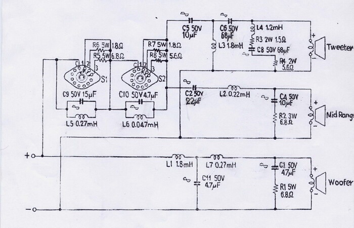 - вч-головка с коректирующей цепью и запускается 3м порядком, теоретически с 3.5 кГц, а по факту с 1500 Гц; - сч-головка запускается 1м порядком, а поверху валится 2м; - нч-головка идет 4м порядком. С11 её тянет за килогерц, а затем С1 резко валит отдачу к полутора кГц. L-pad на сч-вч, теоретически, т.к. у меня нет вч-головки, не только снижают отдачу головок, но и корректируют их АЧХ.