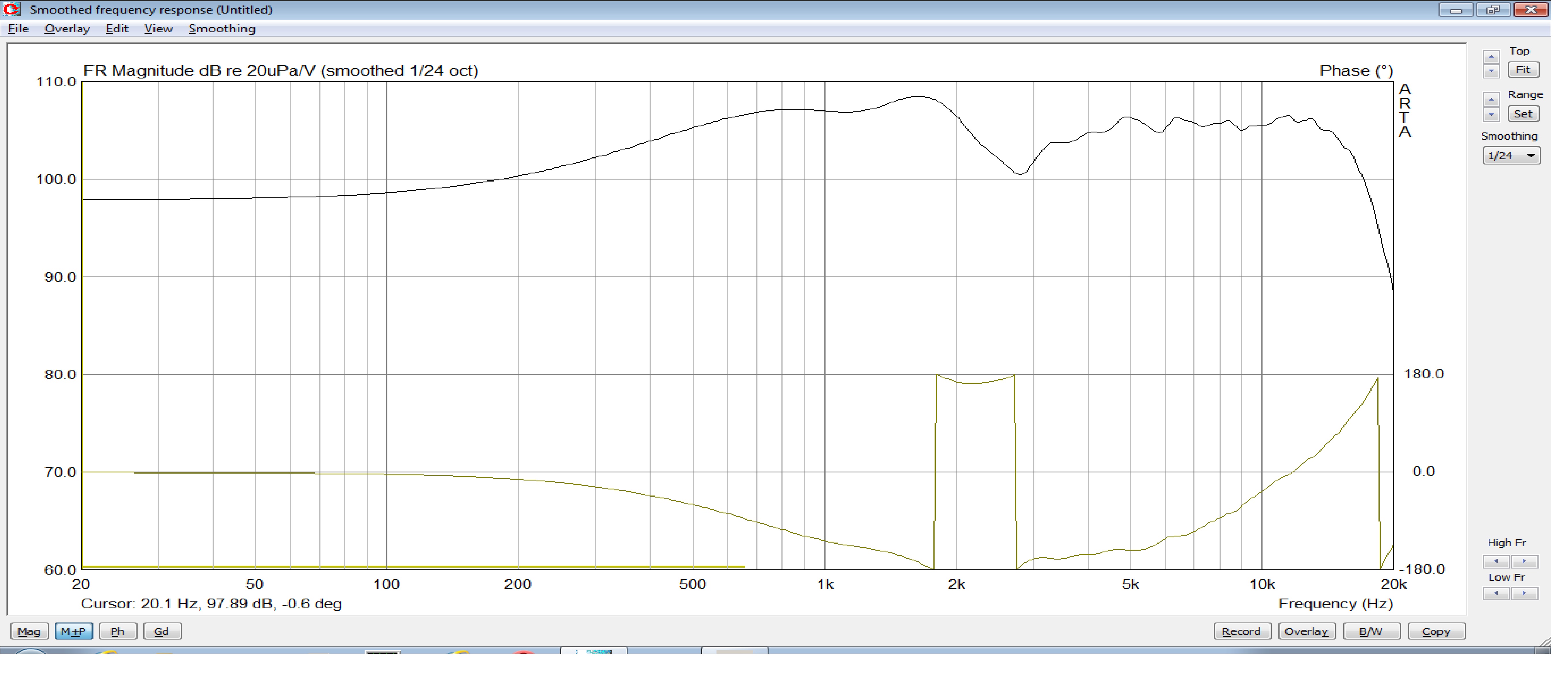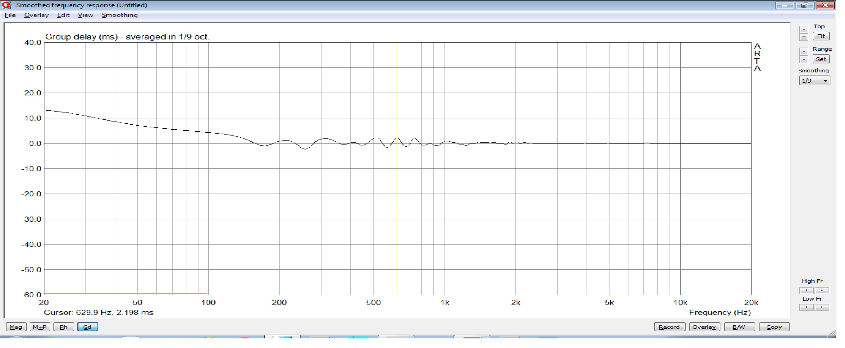 фазовую кривую ниже 300 Гц на обоих графикам ломает по причине отсутствия безэховой камеры, метров так от 7-8, - в обычной комнате замеры АЧХ я могу обмануть поглощающими панелями, но вот замеры фазовой кривой не получается. На моем фильтре, в районе 2.5 кГц ФЧХ не перекручивается с +180 на -180, а продолжает падать под своим углом - график то свернутый и если его продолжить вниз, то абсолютное падение фазовой кривой от 300 до 14 кГц составит 360 градусов. В 60-70х годах, прошлого века, предполагали, что акустическая ФЧХ, лежащая вдоль ноля графика, даст максимально качественное и достоверное воспроизведение, но более поздние исследования доказали, что тут важнее не угловое положение фазовой кривой, а её локальные колебания - вот они то, выходя на каком то участке диапазона за рамки дозволенного, в сочетании с неравномерностью АЧХ на этом же участке, дают рост группового времени задержки (ГВЗ), а оно четко было определено для диапазона нашей максимальной чувствительности ( от 400 до 4000 Гц) в 1-2 миллисекунды. Выше ГВЗ у АС может и к 0.5 мс снизиться, а вот в нижней части диапазона задержка сигнала иногда и под 10-15 мс подскочить. Вот, для примера, ГВЗ, посчитанное прогой из АЧХ-ФЧХ смакетированного ориг.фильтра, курсор на 630 Гц отмечает задержку в 2.2 мс, ниже идет рост. Т.е. ,проще говоря, не важен угол падения фазовой кривой, важна её ровная линия, которую запросто можно поломать неправильной сшивкой двух головок, типа как тут я зафильтровался :