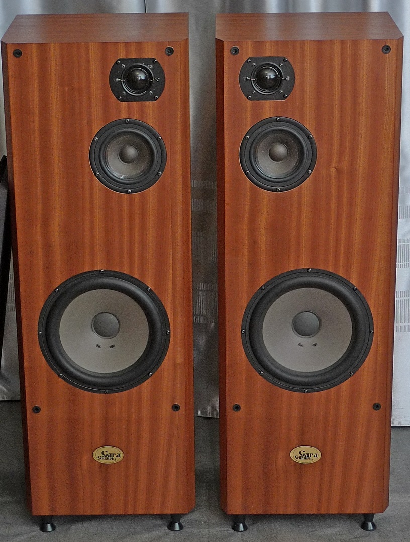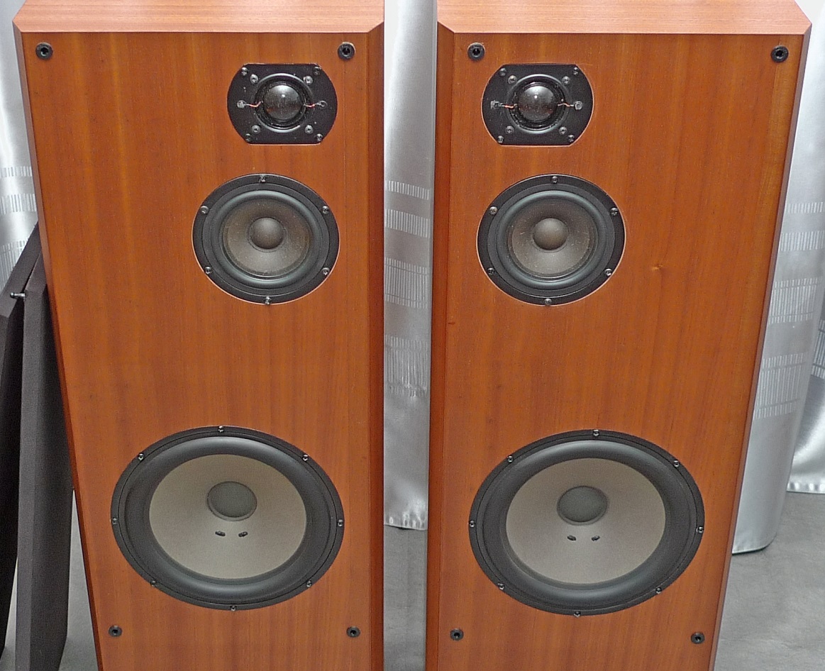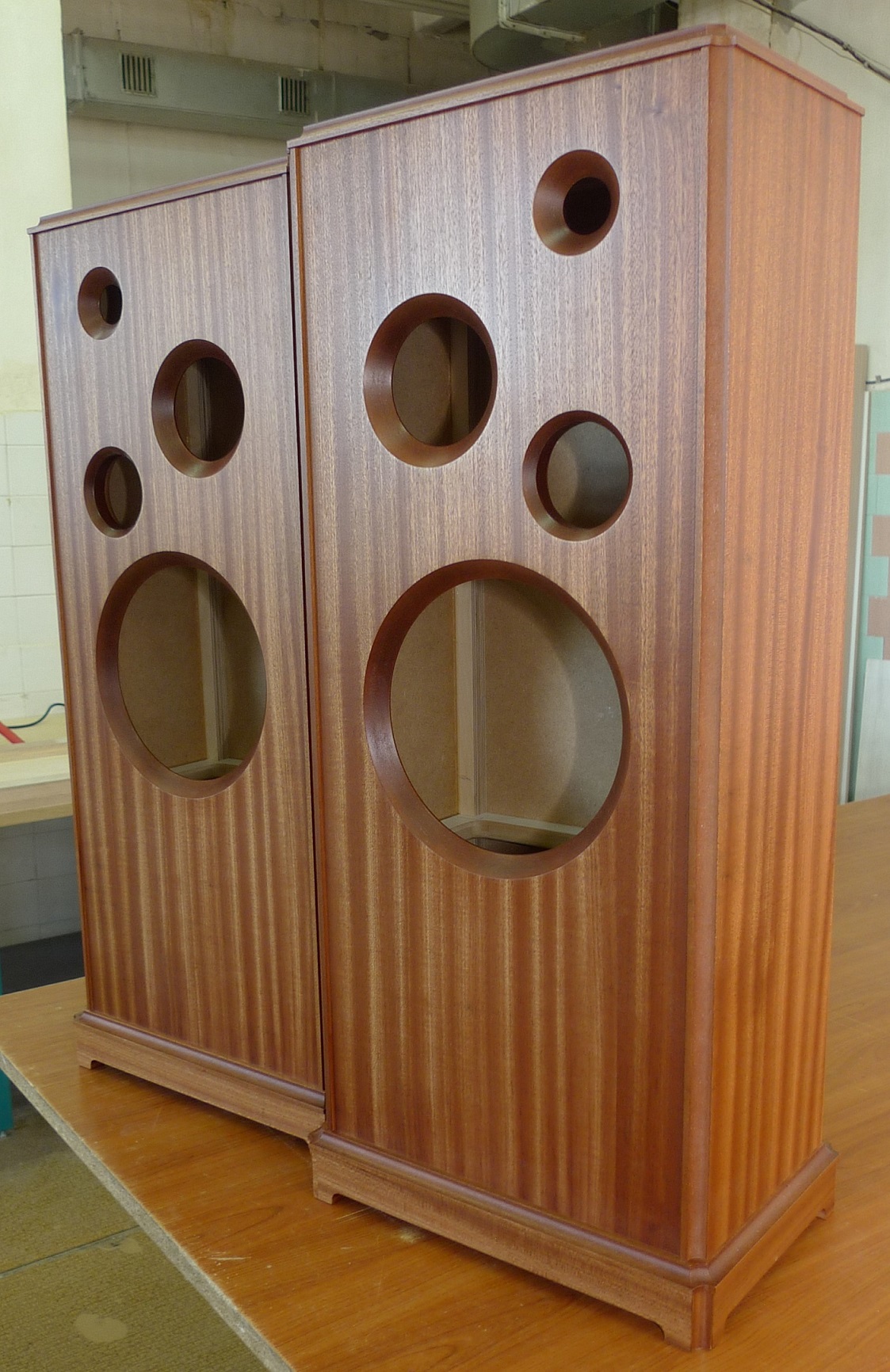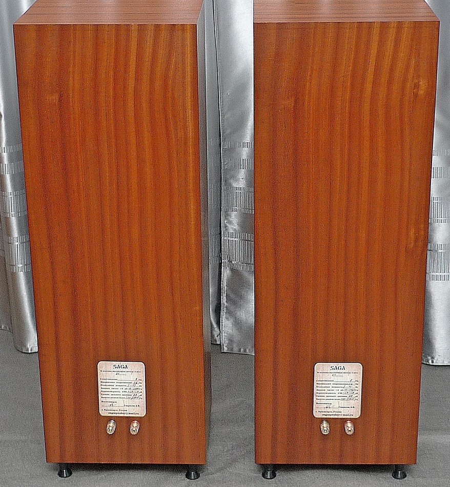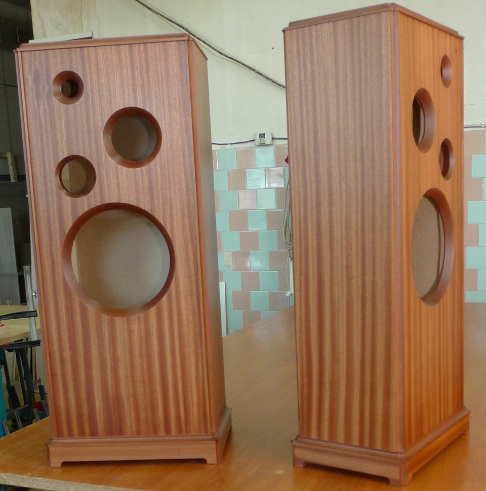сделаны мною на основе корпусов промышленного производства : МДФ - боковые стенки в 23 мм, передняя плита в 33 мм, шпон - африканский махагони, покрытие материалами "Сайер-лак", две усилительные брэйсы, отдельный сч-вч бокс , звукопоглотитель - синтетический войлок толщиной в 2 см, регулируемые ножки, съемные тканевые грили, оформление - закрытый ящик.