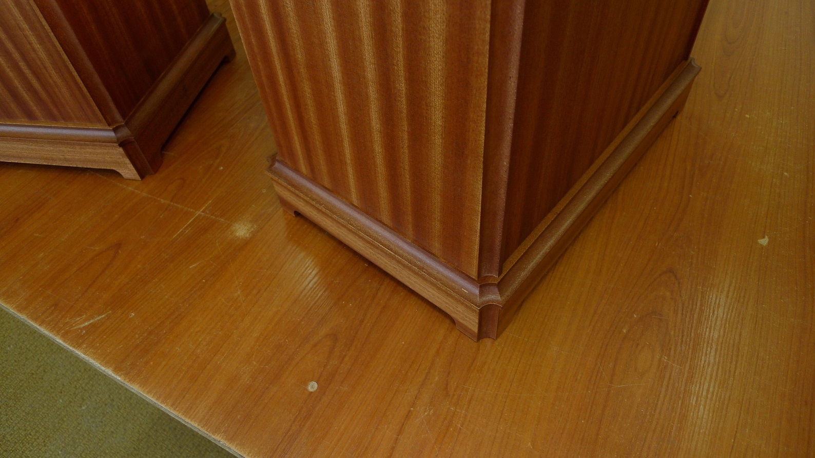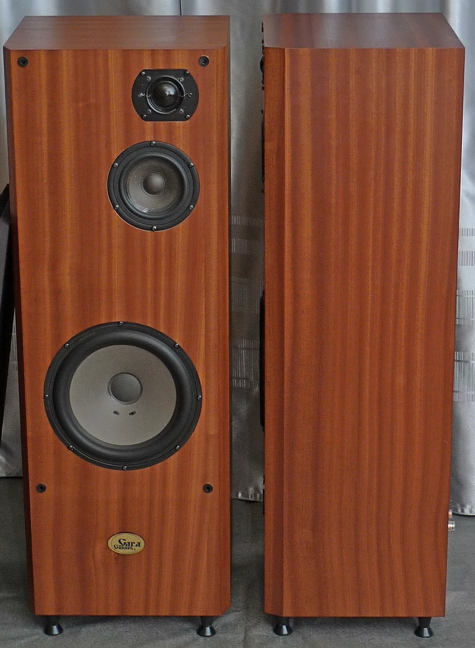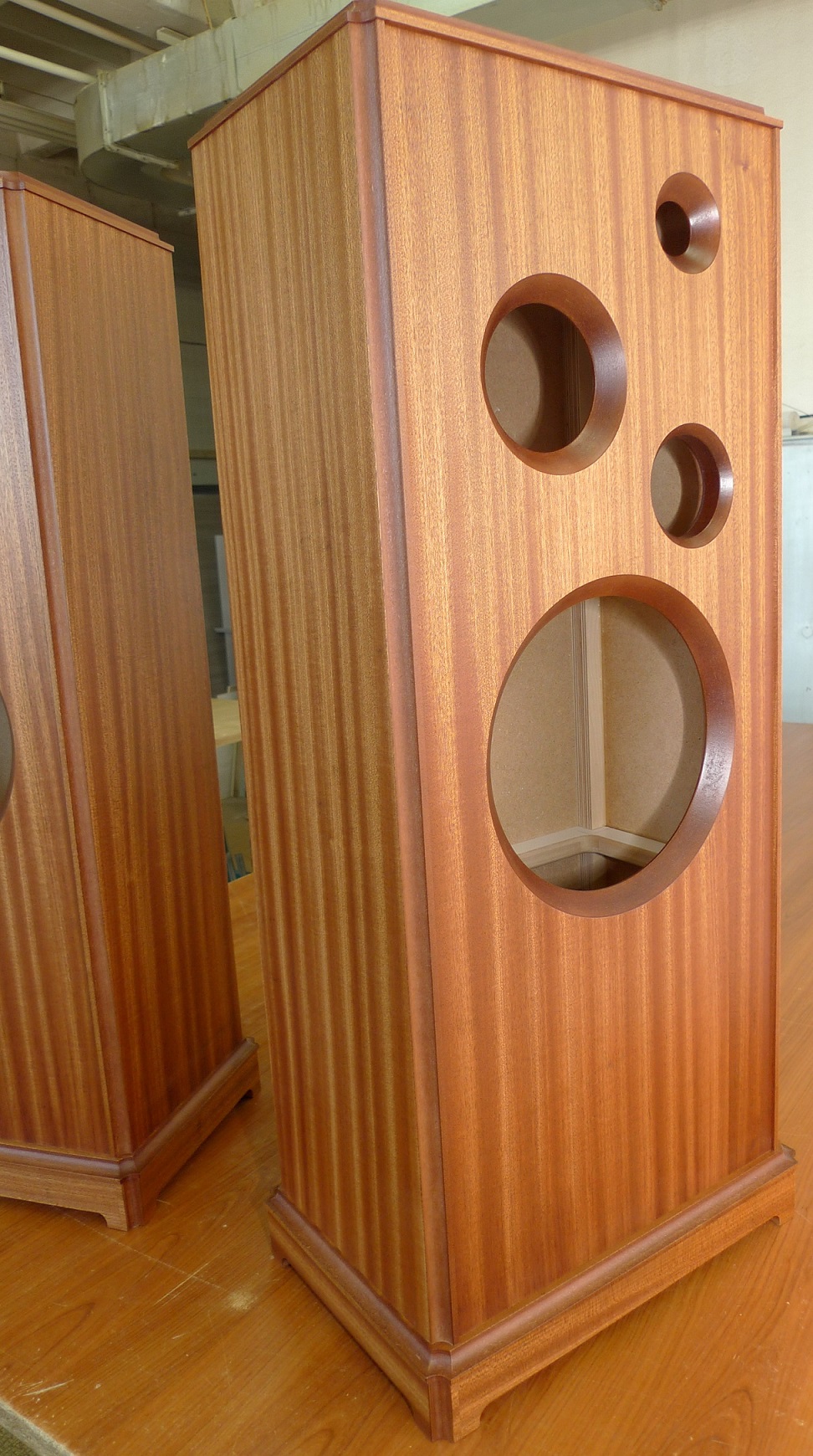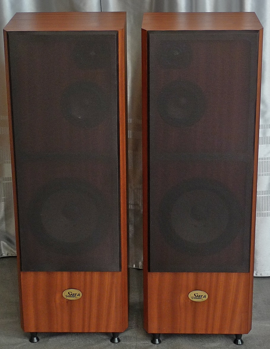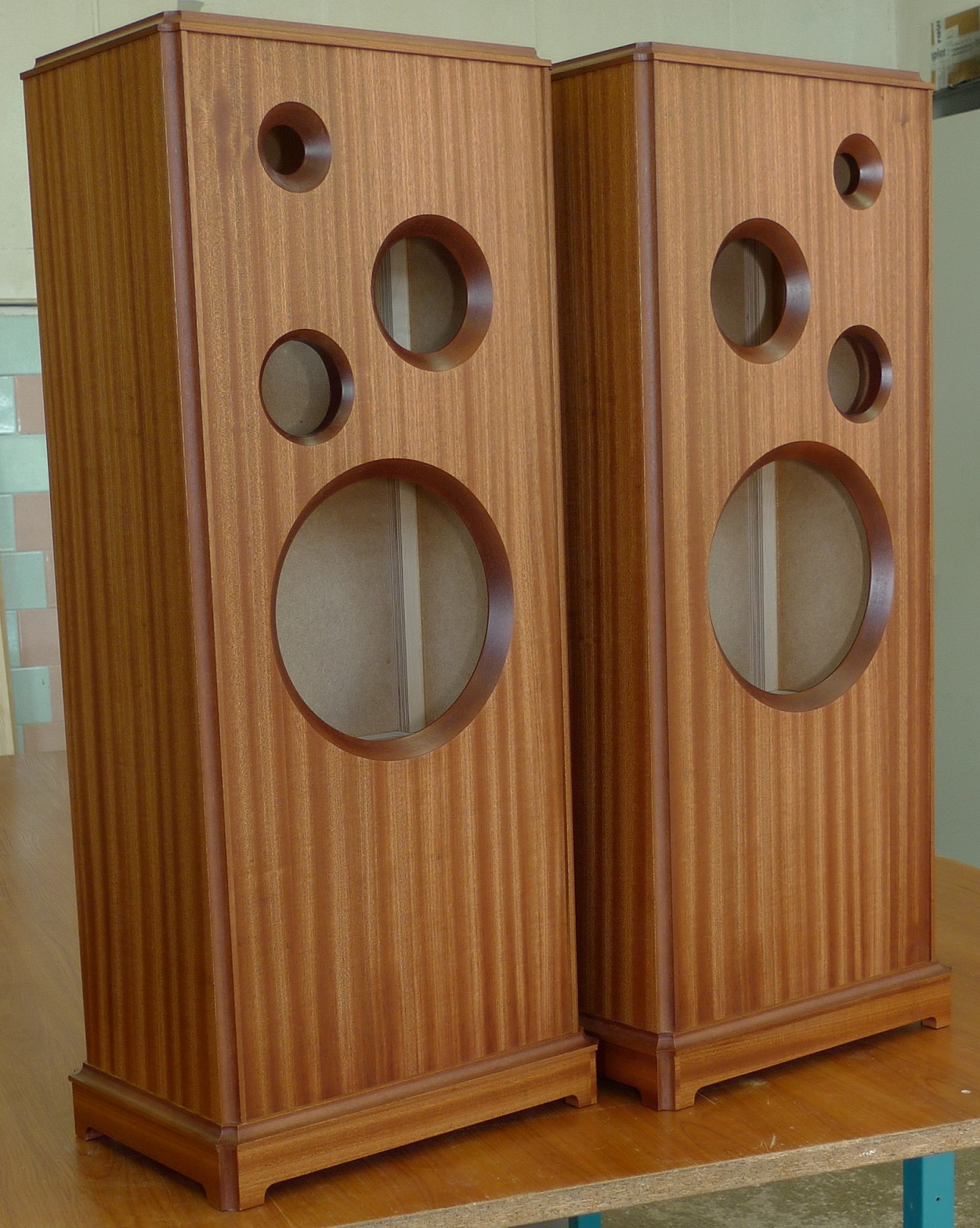 сделаны мною на основе корпусов промышленного производства : МДФ - боковые стенки в 23 мм, передняя плита в 33 мм, шпон - африканский махагони, покрытие материалами "Сайер-лак", две усилительные брэйсы, отдельный сч-вч бокс , звукопоглотитель - синтетический войлок толщиной в 2 см, регулируемые ножки, съемные тканевые грили, оформление - закрытый ящик.