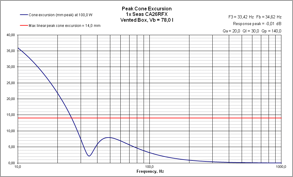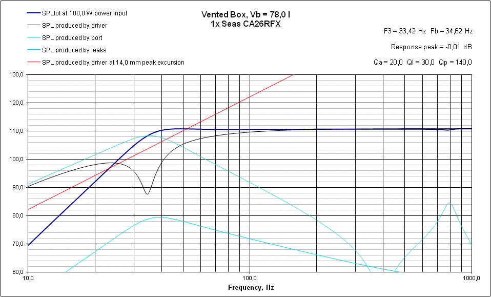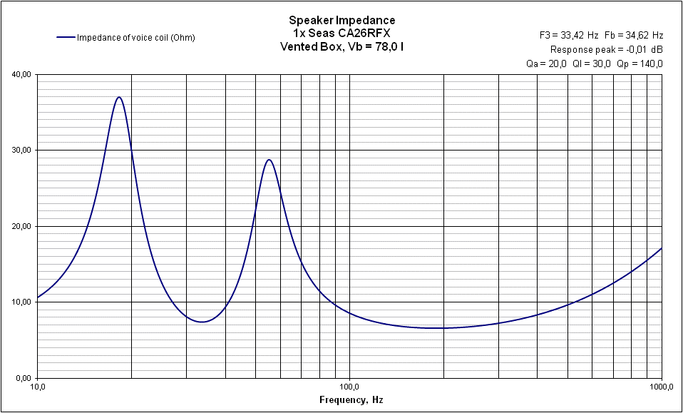 Но тему надо раскрывать, поэтому продолжаю продолжение : - в конце лета поступил входящий звонок из далекого города и вполне себе грамотный человек, владеющий кроме птичьего еще и другими языками, включая язык Белла и Герца, попросил за энную сумму спроектировать и построить 3х полосную АС, способную шириной диапазона уйти за горизонт, а размахом накрыть муравейник, этаже так в 8-10, короче - "Девятый вал", Иван Константиныча. Чтобы не искать на свою опу приключений, включил неплохо освоенный Юнибокс-407 и заглянул на сайт давно известного, и на мой взгляд - самого авторитетного производителя динамических головок - Seas. А дальше как обычно - подставляешь параметры в программу и уже вручную обрабатываешь более-менее подходящие под запрос предложения. Под мои запросы лучше всего подошел норвежский басовик Seas CA26RFX - классика викингов, по моим данным, выпускается с 2007 года, достаточно легкий бумажный диффузор с ручной, антирезонансной, пропиткой, катушка в 50 мм диаметром, выдерживающая большие нагрузки, отдача в 90.5 дБ на метре, сопротивление в 8 Ом и натуральный каучук на краевом подвесе.