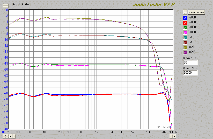 В первую очередь я проверяю именно генератором (Amber 3501) и точным вольтметром (HP3478A), контролируя форму и частоту осциллографом со встроенным частотомером (Тек 2465BCT). Но для удобства снятия кривых использую компьютер с профессиональной звуковой картой RME Digi 96/8 PAD и программу AudioTester. Отклонения от измерений вольтметром и генератором в целом невелики - доли дБ.