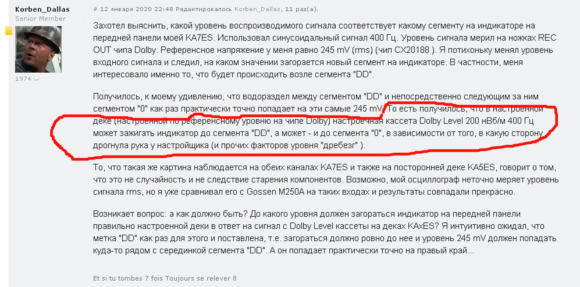Вот человек из Америки пишет неангажированный наверное, про практическую разницу Долби и 0дДИН. Т.е дрогнувшая рука настройщика, дребезг резистора или погрешность самой ленты могут дать почти одни и те же показания. Это не отменяет моего перфекционизма в 0,8-1дБ, и не отменяет математики 20log(250/225)=0,92дБ но тем не менее как информация: