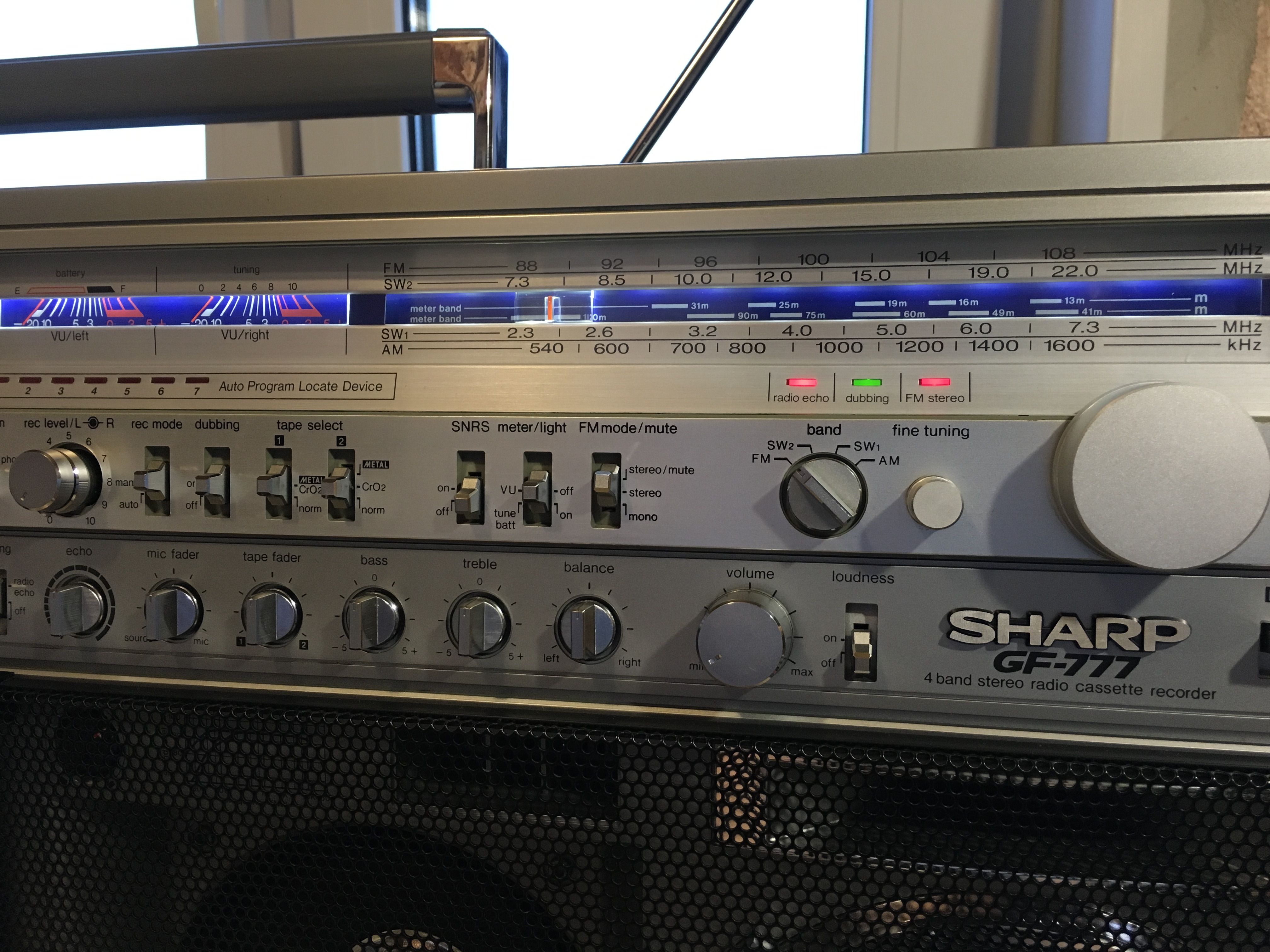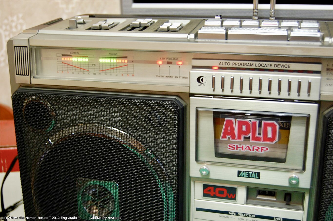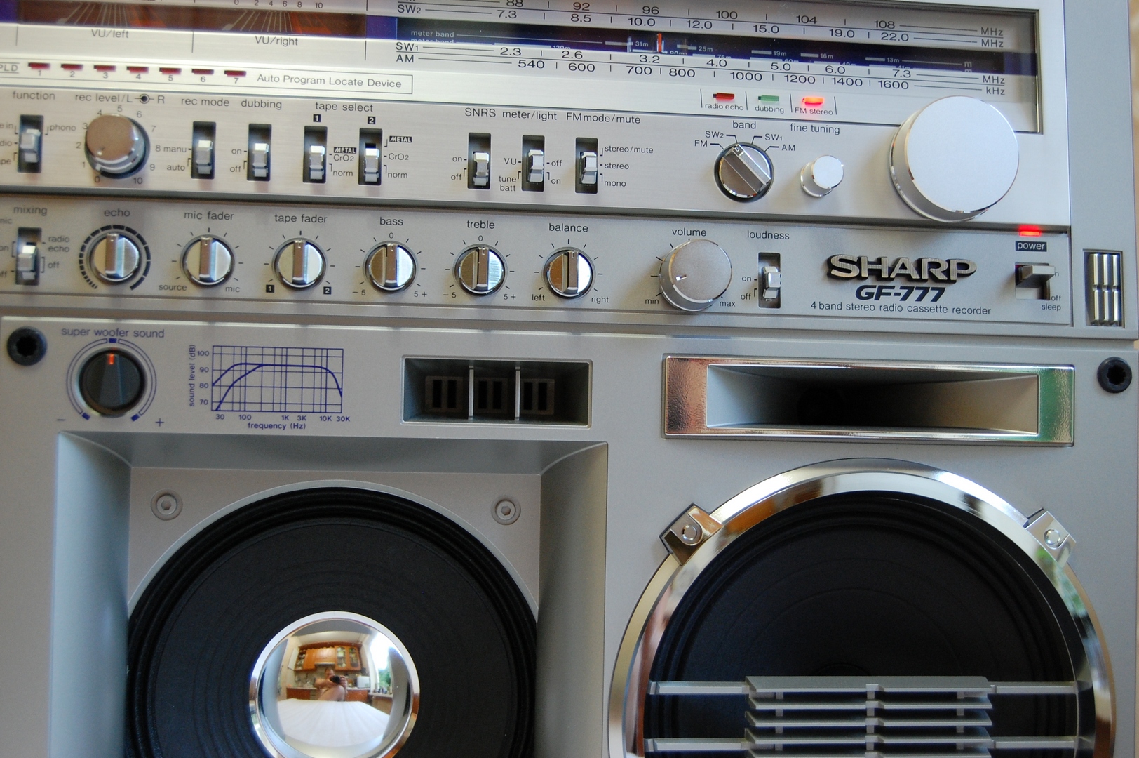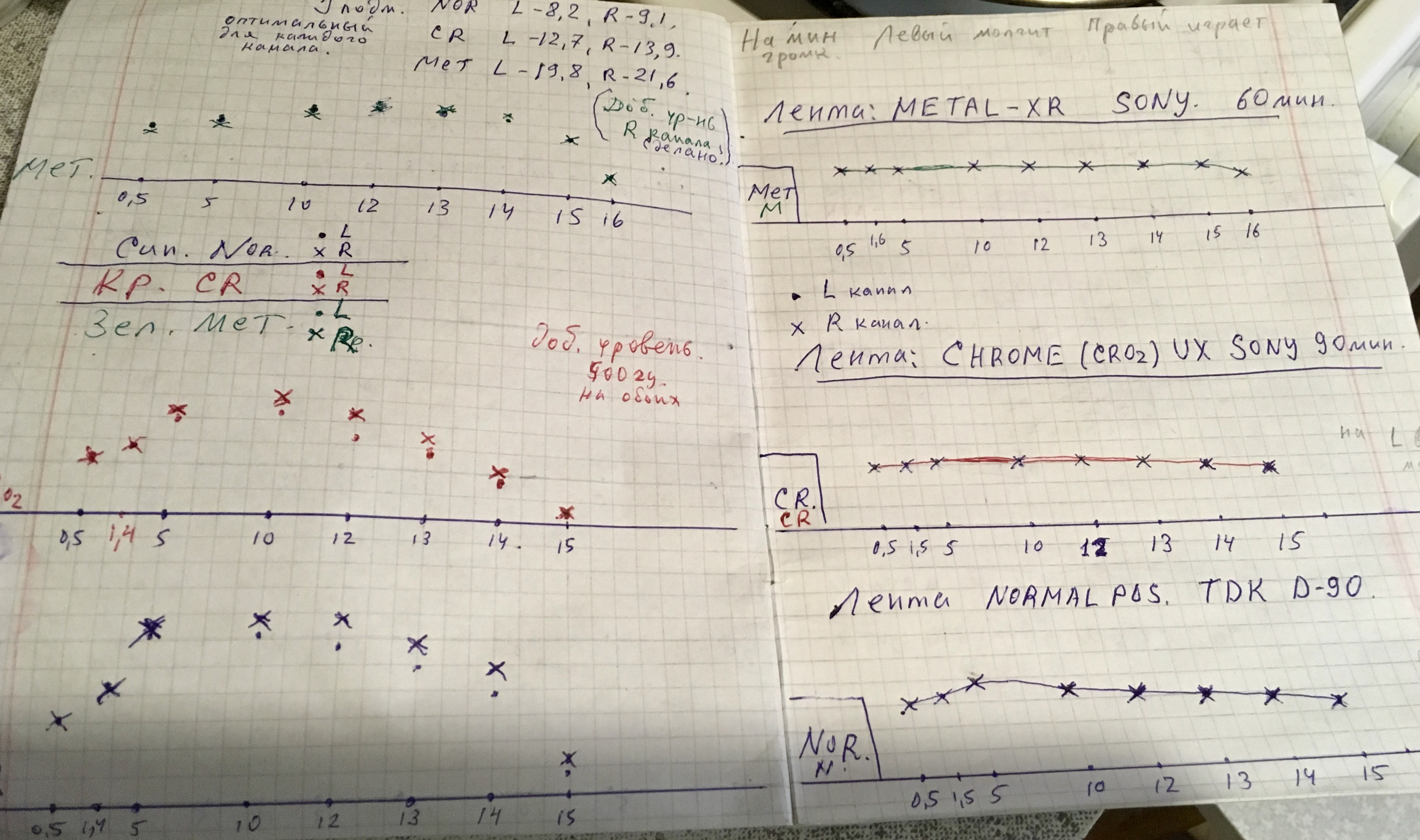 Крышки кассетоприемников в 777 требуют, как обычно 1) Снятия, разборки, мойки, 2) Полировки стекол 3) сборки 4) Восстановления 4х крепежных втулок, которые входят в оси каждой из них. Обыкновенно эти пластмассовые втулки стачиваются за 37 лет. В результате - крышки перекашиваются. Заедают при закрытии и не открываются. В тяжелых случаях повисают, перекошенные в пространстве-времени. Для ремонта требуется удалить старые, сточенные пластмассовые втулки из корпуса. Далее, с большой точностью установить новые, лучше всего металлические. Эта операция ювелирной точности, без права на ошибку. Четыре таких операции. По паре втулок на крышку. Далее, чтобы крышки открывались так, как на видео, они регулируются, с точностью до десятых долей миллиметра, и каждая в двух плоскостях. 5) И, наконец, разрезание демпферов для набития новой смазкой, как правильно написал Олег. Механизм этих редукторов плавного скольжения требует новой смазки, старая давно высохла или протекла. Для этого демпферы разрезаются, набиваются новой смазкой и пайкой герметично свариваются. С первого раза полная герметичность не всегда получается. Только после этих операций, обычно на день - два работы, достигается синхронность и плавность открытия обеих крышек кассетоприемников, при одинаковом их положении в корпусе, и без перекосов. Это одна из самых несложных операций в Шарпе 777, требует только внимательности и терпения. Обычное количество дефектов у Sharp GF-777, начинается от 30-35 после нормальной диагностики. Остальные сложнее - регулировка БГ, подбор строго нужных по размеру и качеству роликов и их установка, шлифовка головок или установка новых, последнее осложняется нюансами (требуют соблюдения именно в этой модели Шарп). Шлифовка или замена идлеров, наладка точности и правильности следования ленты в тракте. Немало времени отъедает разборка всего аппарата, полная мойка, и полировка стекол. Ремонт регулятора громкости, для чего аппарат разбирается, выпаивается потенциометр и далее с ним происходят специальные работы на день - два. В случаях, когда мне требуется совершенная идентичность увеличения громкости по ЛК и ПК одновременно, а у шарпов она разная, как правило, требуется ювелирная операция с разборкой и подгонкой регулятора. Легко можно запороть при ошибке вовсе. Ремонту подвергается весь аппарат - от входов-выходов до настройки АЧХ каналов воспроизведения- записи на трех типах лент. Последнее для большей точности нередко требует тонкой подстройки и изменения схемы в УЗ. Не раз попадались аппараты с очень небольшим пробегом, но с заводскими дефектами в УЗ, с кривой записью, при этом с оригинальными, не спиленными головками. Их настройка изначально не щеголяла точностью. Приходилось рассчитывать и внедрять изменения в схему. Тогда эффективность записи у семёрок становится на уровне дек начальной-средней ценовой категории, только налаженных, как положено. Требуют доводки пищалки, обычно они забудевают, в звуковых платах сохнут конденсаторы, которые также требуют замены, и много чего ещё. Сильное влияние на звук оказывает состояние родных динамиков. Обычно они изношены и выцвели, нередко хрипят или вовсе в обрыве. После месяца плотных занятий с аппаратом, он оживает и дает вживую такое звучание, что многим и не снилось. Слева на графике - оригинальная АЧХ каналов записи-