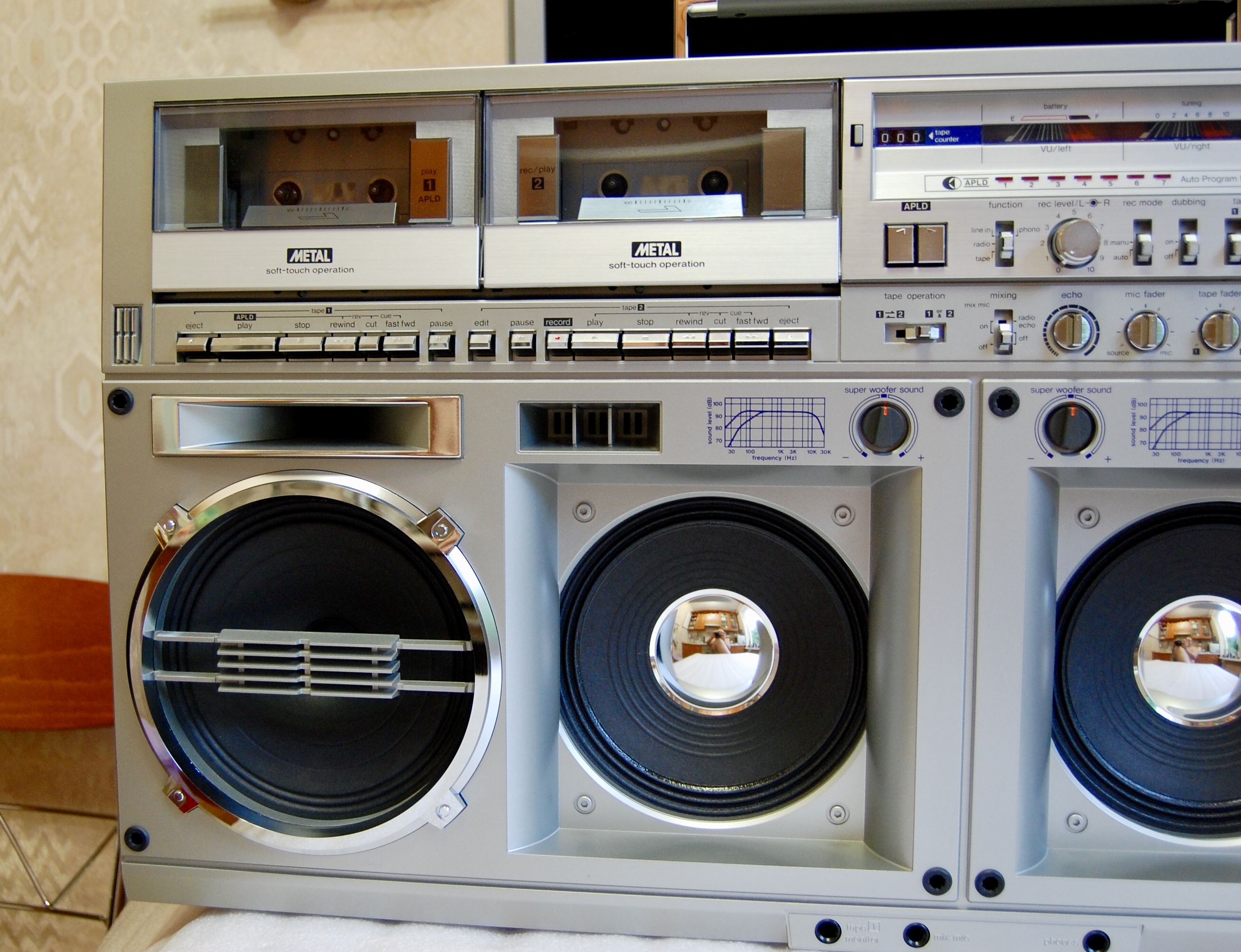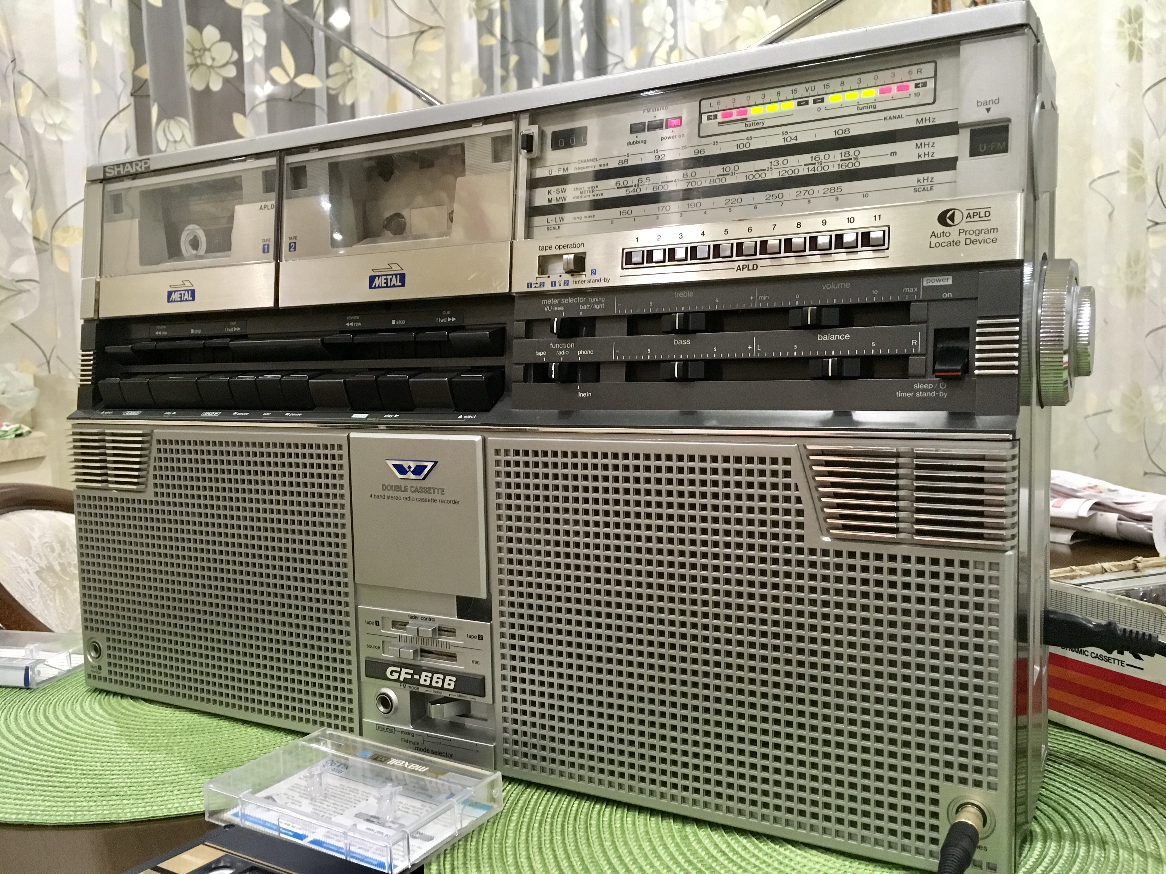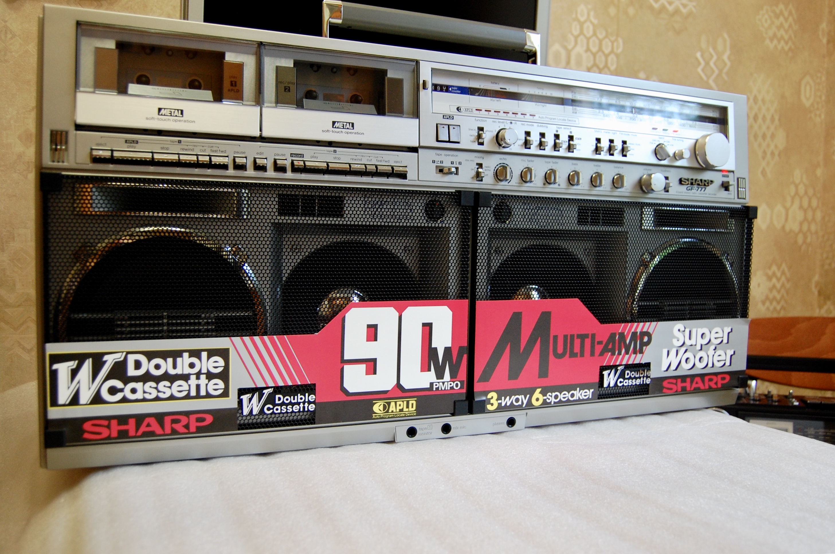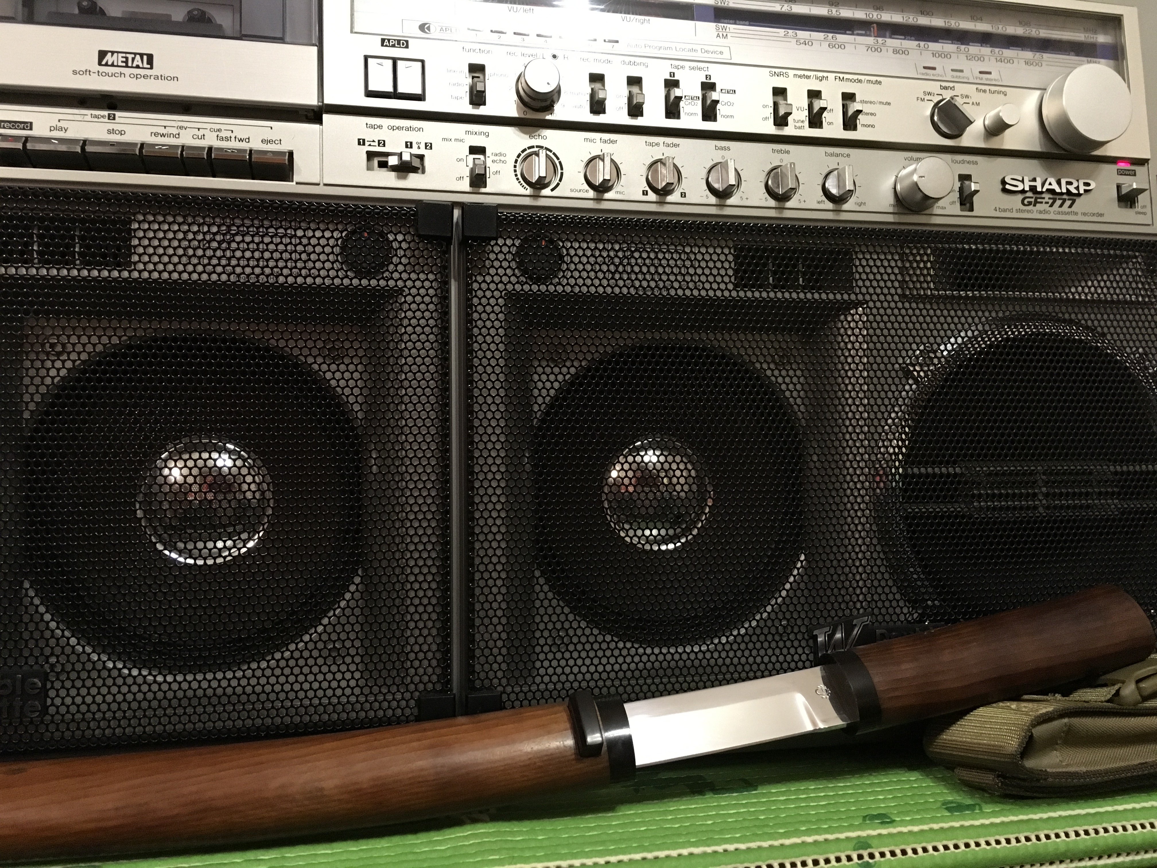 Крышки кассетоприемников в 777 требуют, как обычно 1) Снятия, разборки, мойки, 2) Полировки стекол 3) сборки 4) Восстановления 4х крепежных втулок, которые входят в оси каждой из них. Обыкновенно эти пластмассовые втулки стачиваются за 37 лет. В результате - крышки перекашиваются. Заедают при закрытии и не открываются. В тяжелых случаях повисают, перекошенные в пространстве-времени. Для ремонта требуется удалить старые, сточенные пластмассовые втулки из корпуса. Далее, с большой точностью установить новые, лучше всего металлические. Эта операция ювелирной точности, без права на ошибку. Четыре таких операции. По паре втулок на крышку. Далее, чтобы крышки открывались так, как на видео, они регулируются, с точностью до десятых долей миллиметра, и каждая в двух плоскостях. 5) И, наконец, разрезание демпферов для набития новой смазкой, как правильно написал Олег. Механизм этих редукторов плавного скольжения требует новой смазки, старая давно высохла или протекла. Для этого демпферы разрезаются, набиваются новой смазкой и пайкой герметично свариваются. С первого раза полная герметичность не всегда получается. Только после этих операций, обычно на день - два работы, достигается синхронность и плавность открытия обеих крышек кассетоприемников, при одинаковом их положении в корпусе, и без перекосов. Это одна из самых несложных операций в Шарпе 777, требует только внимательности и терпения. Обычное количество дефектов у Sharp GF-777, начинается от 30-35 после нормальной диагностики. Остальные сложнее - регулировка БГ, подбор строго нужных по размеру и качеству роликов и их установка, шлифовка головок или установка новых, последнее осложняется нюансами (требуют соблюдения именно в этой модели Шарп). Шлифовка или замена идлеров, наладка точности и правильности следования ленты в тракте. Немало времени отъедает разборка всего аппарата, полная мойка, и полировка стекол. Ремонт регулятора громкости, для чего аппарат разбирается, выпаивается потенциометр и далее с ним происходят специальные работы на день - два. В случаях, когда мне требуется совершенная идентичность увеличения громкости по ЛК и ПК одновременно, а у шарпов она разная, как правило, требуется ювелирная операция с разборкой и подгонкой регулятора. Легко можно запороть при ошибке вовсе. Ремонту подвергается весь аппарат - от входов-выходов до настройки АЧХ каналов воспроизведения- записи на трех типах лент. Последнее для большей точности нередко требует тонкой подстройки и изменения схемы в УЗ. Не раз попадались аппараты с очень небольшим пробегом, но с заводскими дефектами в УЗ, с кривой записью, при этом с оригинальными, не спиленными головками. Их настройка изначально не щеголяла точностью. Приходилось рассчитывать и внедрять изменения в схему. Тогда эффективность записи у семёрок становится на уровне дек начальной-средней ценовой категории, только налаженных, как положено. Требуют доводки пищалки, обычно они забудевают, в звуковых платах сохнут конденсаторы, которые также требуют замены, и много чего ещё. Сильное влияние на звук оказывает состояние родных динамиков. Обычно они изношены и выцвели, нередко хрипят или вовсе в обрыве. После месяца плотных занятий с аппаратом, он оживает и дает вживую такое звучание, что многим и не снилось. Слева на графике - оригинальная АЧХ каналов записи-