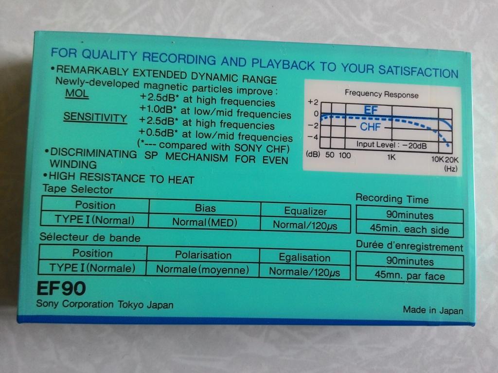 Имел возможность протестить их, тогда еще особой ценности этой кассеты не знал и благополучно поменял ее на новенькую UX-90 1992 К сожалению CHF (metallic) была не особо по кондиции, спасибо предыдущему владельцу/цам, так при калибровке на 990ES она была ощутимо лучше, чем обычная CHF, и примерное на одном уровне с первой EF. Почти тоже самое "сказали" уши при записи)) Основное, что заметил - шум и небольшой "провал" уровня записи. Старая шумит больше. ЗЫ: как я понял, CHF metallic стала первой EF, которую мы знаем "доимпрувед" Хотя, тут могу ошибаться...