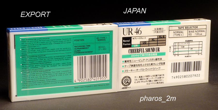 9-и рублевая классика - maxell UR 88-89-го года модели (правда их в совке не было в 80-х по 9 руб.) - были всеми любимые голубые по макселовски ароматные LN, как по мне, так самая лучшая кассета из второй половины 80-х за 9 руб (от 11 до 25 с рук ) Но вернемся к UR 88-89-го Кассета с фирменным овалом - прозрачная, но на фото у японской внешняя окантовка матовая, вторая на экспорт - целиком прозрачная, но если мне не изменяет память - первые экспортные по краям тоже были матовые... Но так или иначе качество корпуса и пленки ( = 9 руб.) было на высоте |