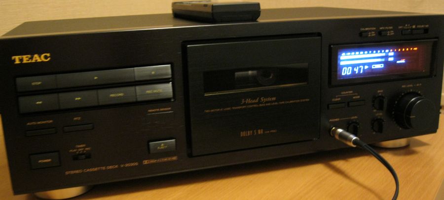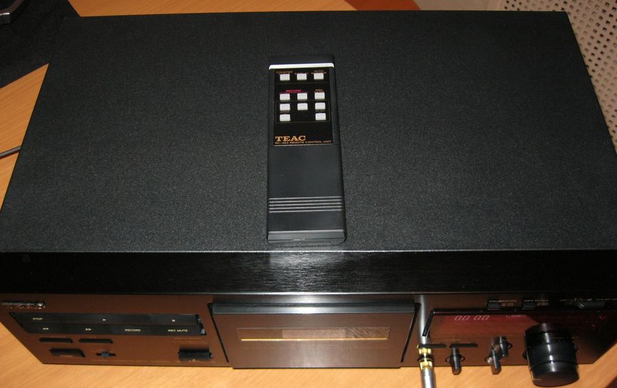 Кассетник в комплекте с абсолютно не пользованным пультом ДУ, был отмыт и очищен от пыли, ревизированна протяга (пассик и прижимной ролик) и проверена работоспособность. После осмотра остались следующие впечатления: уже заметны следы экономии во всём – маленький маховичек, протягу к передней панели фиксирует только один шуруп, нет никаких шумопоглотителей, и как результат – очень шумная работа моторов и механизма. Сам механизм замечательный, резины нет, идлер – шестерёнка, моторы мощные, резинки качественные, смазки достаточно. Всё сохранилось очень хорошо, пластик беленький, выглядит как новый, в том числе и головки с заводскими настройками – никто не ковырял, что уже хорошо. Работает безупречно, ничего не тянет, не заедает, ленты все определяются, юстировка головок не нарушена. Внешний вид деки и механизма ощените сами, я лишь скажу, что не нашел ни одной царапинки и субъективно оцениваю внешний вид на 5+ из пяти.