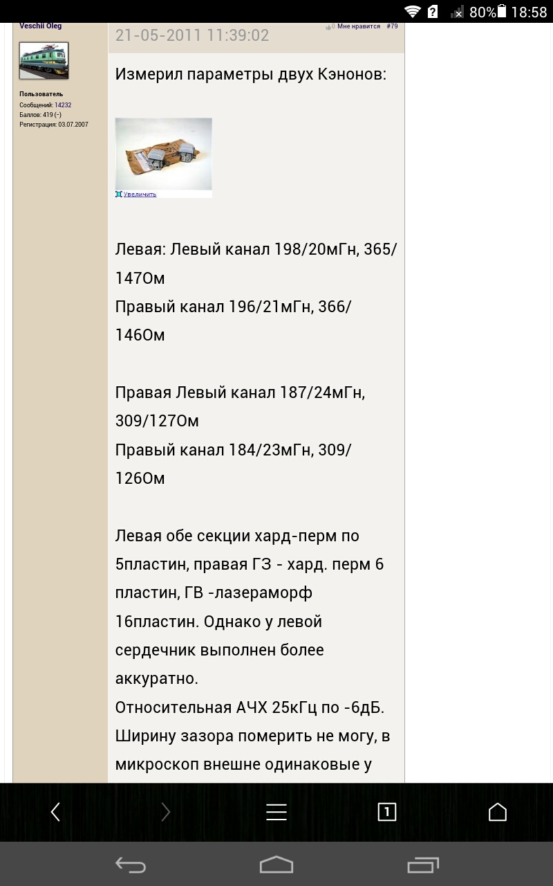 В диапазоне 30Гц - 16Кгц в полдецибелла уложился (отн уровня -20дБ, 0дБ=250нВб), на 18К -2(-2.5)дБ. По результатам измерений с 3ЛИМ и ТЕАС МТТ-256 (120мкс) и ТЕАС МТТ-356 (70мкс), ТИКи до 14К. Но у меня потери - запорол два ЛИМа , а вот емкости у головы оставил родные 150р.Итак, рассказываю: Началось все с того, что я стал настраивать эквализацию УВ строго по СМ. В СМ сказано: "поставить кассету 333Гц 0дБ, настроить уровень на вых. 0 дБ", дальше "поставить кассету 6,3КГц -10дб, переключить переключатель на Ф-Хр и настроить подстроечниками, чтобы было -16дБ, потом переключить в положение нормал и другими подстроечниками настроить на выходе -11.5 дб" , дальше, "поставить кассету -10дБ 10КГц и убедиться, что на выходе -9,5 - (-13,5дБ), если чо не так, повторить процедуру. У меня отдельной кассеты 6,3К -10дБ нет, поэтомку решил настроить с ЛИМом.. Т.е. засек уровень на 315ГЦ, на 6,3К выставил -16дБ для хрома и -11,5дБ для нормала отн. уровня 315Гц, проверил уровень на 10К, он оказался прогнозируемо равным -11,5 дБ, что укладываеися в СМ (-9,5-(-13,5)), ну и решил проверить по ЛИМу частотку дальше, получил на 18КГц уровень -4,5дБ отн. 315Гц. (а на левом, аж -5дБ). "Чо-то как-то много просаживается", подумал я, (вспоминая пост Никитина)" И нет бы, чтобы задуматься, а какого рожна СМ рекомендует "в положение нормал на 6,3КГц настроить на выходе -11.5 дб", для чего они так просаживают АЧХ на середине на 1,5дБ? Я давай емкости подбирать у головы, чтобы подзадрать на самом верхнем краю. И тут происходит одна "маленькая неприятность", которую я не сразу заметил. Оказывается при увеличении емкости, параллельной голове, даже ненамного (достаточно на 200р), головка из воспроизводящей превращается в универсальную.... и начинает подтирать (совсем чуть-чуть) ленту. При воспроизведении появляется сначала слегка заметный, но с каждым проигрыванием все более ощутимый шум. Верхи подтираются, падают, я их задираю все увеличивая емкость, потом верхи все равно падают продолжая с каждым проигрыванием затираться, сум уже конкретно слышно и видно на осц. я соображаю, в чем дело, емкости ставлю старые, частотка с ЛИМа уже на 10КГц -5дБ Вот так.
