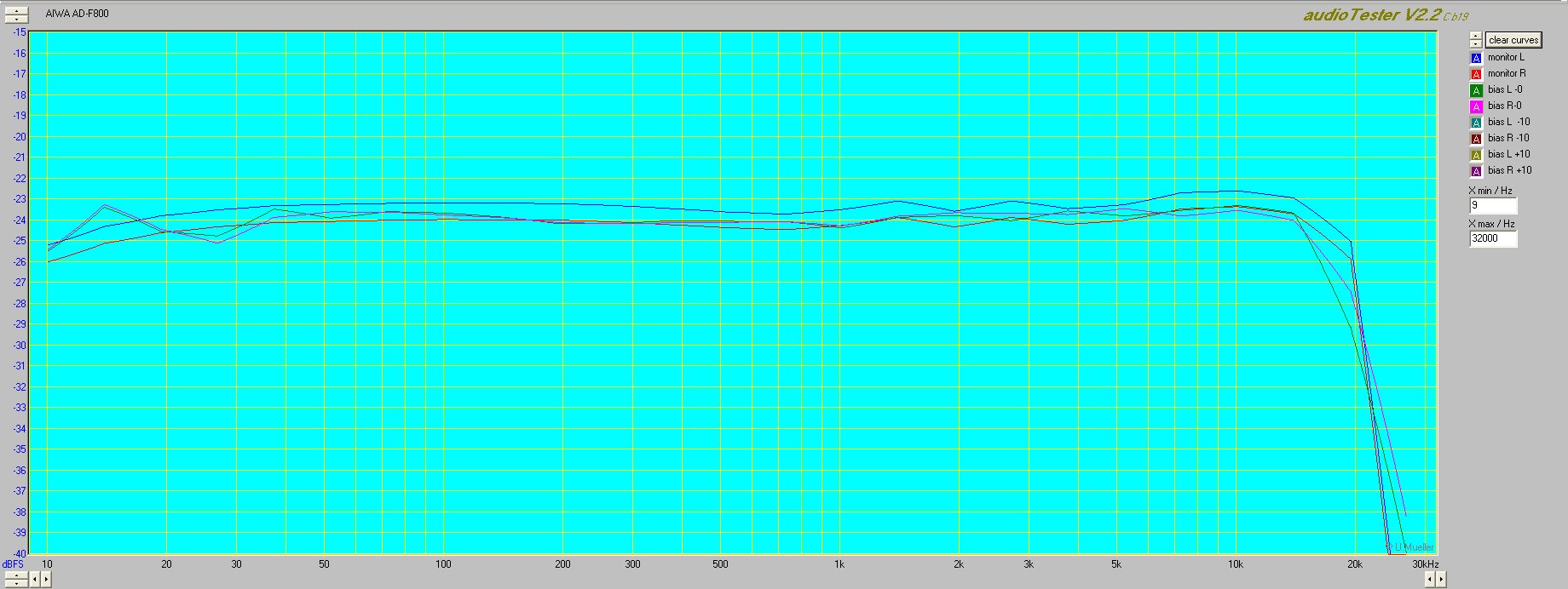 Пришла тут мне AIWA AD-F800/. Померял на свип-тоне. кассета TDK D90 б/ушная.Bias на 0. Вопрос. Почему в режиме монитора такой быстрый завал по краям-это от звуковой карты (Creativ audiga2)или в мафоне кривизна? Как правильно настроить программу Audiotester.
