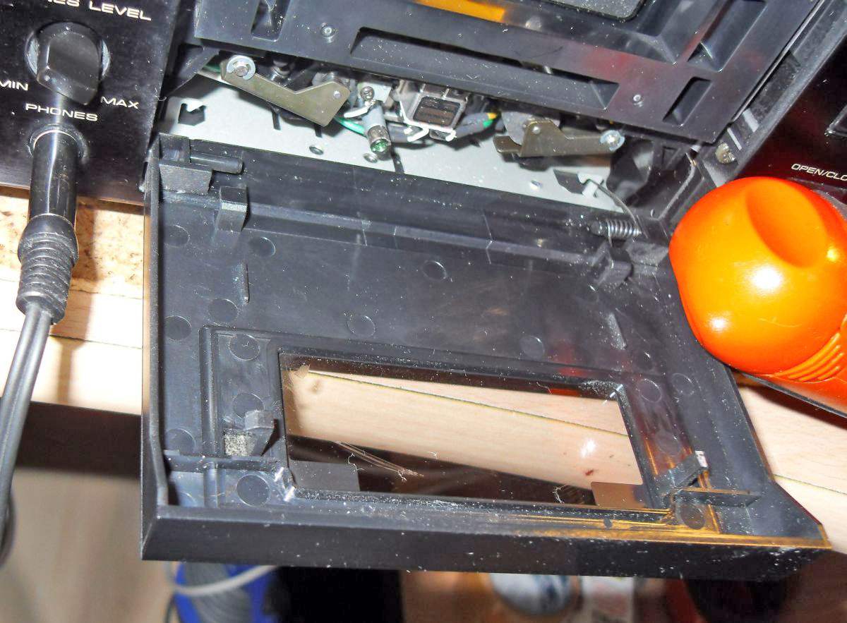 До головок добираются следующим образом - у крышки вверху справа и слева пластмассовые крючки-защёлки которые входят в кассетоприёмник. Кроме того крышка прижимается к кассетоприёмнику пружинками. На крючки надо осторожно нажать справа и слева по направлению друг к другу и, отстегнув, просто откинуть крышку на пружинках. Не смотря на то, что всё знал, крючок справа отломил. Трудно дозировать усилие, да и пластмасса за 20 лет хрупкой стала. Фото прилагаю. Перед фотосессией протёр кассетник микрофазерной тряпкой, и всё равно вспышка высветила пыль. Это неправда, на самом деле он чистый. |
