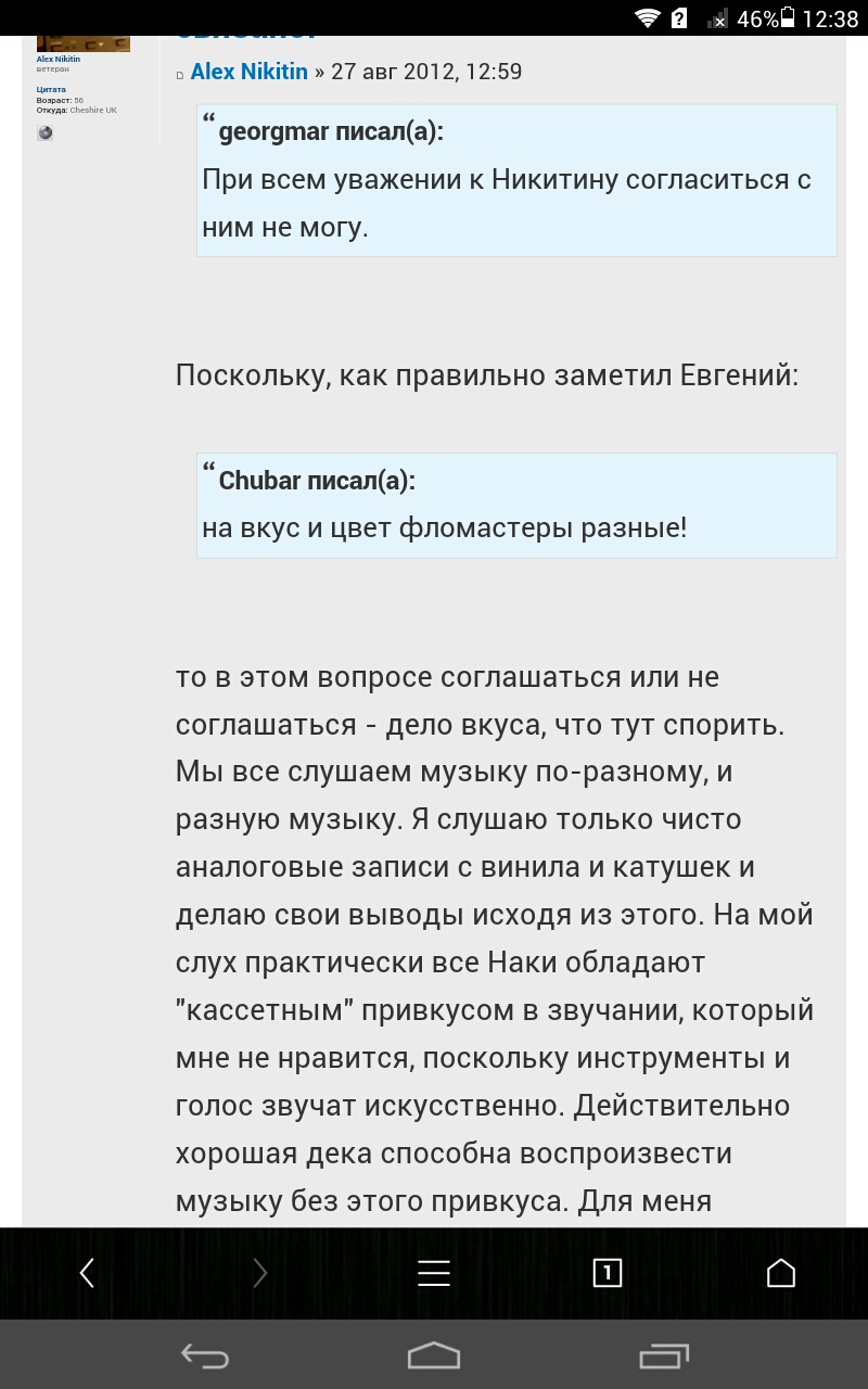 . Да, на фотках выглядит не очень понтово, но я и не просто так тупо собираю впихивая в это огромные бабки, а стараюсь настроить технику и выжать из неё максимум возможностей в паре с помещением)))). И результат так же налицо. Когда прослушивали 681, вот там был ламповый усилок, акустика Lo-d, но ни эквалайзеров, ни обработки помещения не было. Одна и та же кассета. Так вот, у меня звучит данная запись лучше, в плане того что чище, разборчивей, натуральнее.