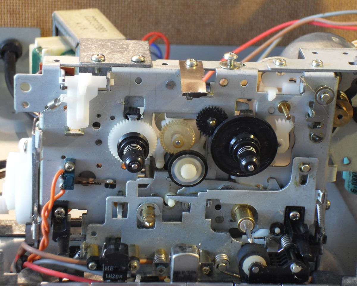 Нашёл случайно в чулане эту Тошибу. Ещё бы знать, как она туда попала. Разобрал, заменил пассики. Играет. Громкий шум в механике, особенно в начале кассеты. Внимательное разглядывание выявило причину. Подматывающий узел довольно тугой, идлер его не осиляет проворачивать и привод идлера - жёлтая шестерёнка в центре - скребёт по идлеру и визжит. Если идлер прижать пальцем плотнее к приводу и подматывающему узлу - всё работает как надо.