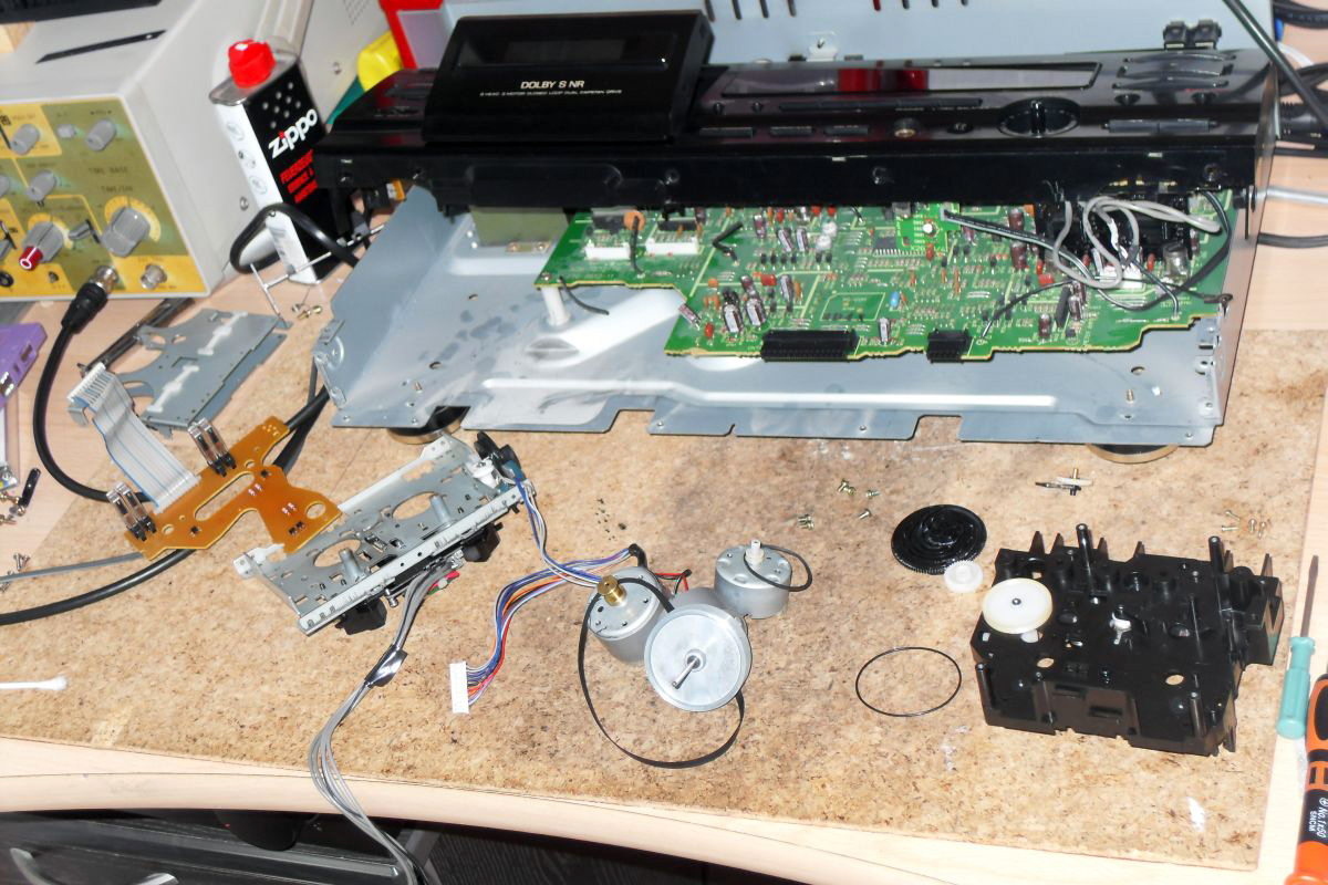 Совсем кратко - не работает подмотка. Если подробнее - у всех трёх дек проблема с средним мотором. Слева мотор на тонвал, справа - на управляющее колесо которое поднимает головки и на котором с противоположной стороны налеплены блестящие полоски. Перекрывая два окна с сенсорами эти полоски показывают, в каком режиме находится транспорт. Средний мотор делает три дела - в режиме "стоп" открывает-закрывает кассетоприёмник, в режиме "перемотка" - мотает, а в режиме "запись-воспроизведение" подматывает. Так вот, первую и вторую функции мотор выполняет исправно, третью - не желает. Почему - не пойму, жду подсказки.