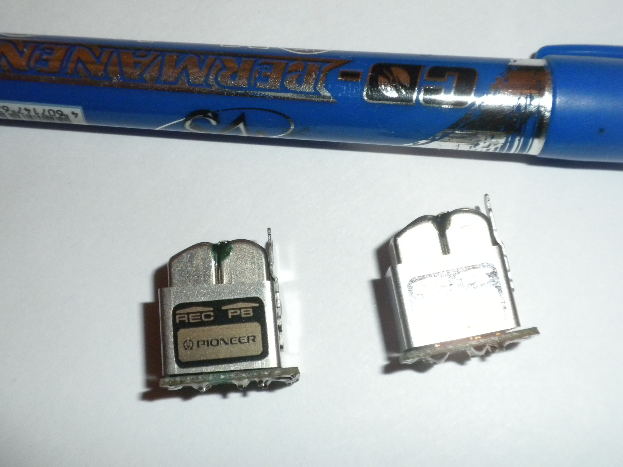 наблюдениям)Все головки - обычные металлические имеют какую то но выработку т.е пропил а настройки азимута у всех аппаратов разные и подогнать настройку голов под один аппарат невозможно хотя бы по правому каналу-будет провал на 1-3 Дб даже по индикатору не говоря уже по приборам.На фото срубленные головы с 737 у одной ногтем можно почувствовать у другой практически нет-но с ними идеально не настраивалось.На другом фото(простите за качество но поверьте)головка стекло на глаз идеальная но убитая напрочь -это на счет вечного стекла под 100000 часов. На последнем фото синий маркер если закрасит зазоры головок Пионера а потом промыть спиртом-зазоры станут зелеными и похожими на сендаст. Опять же делюсь своим опытом может и не правильным в глазах Гуру но что имею! |