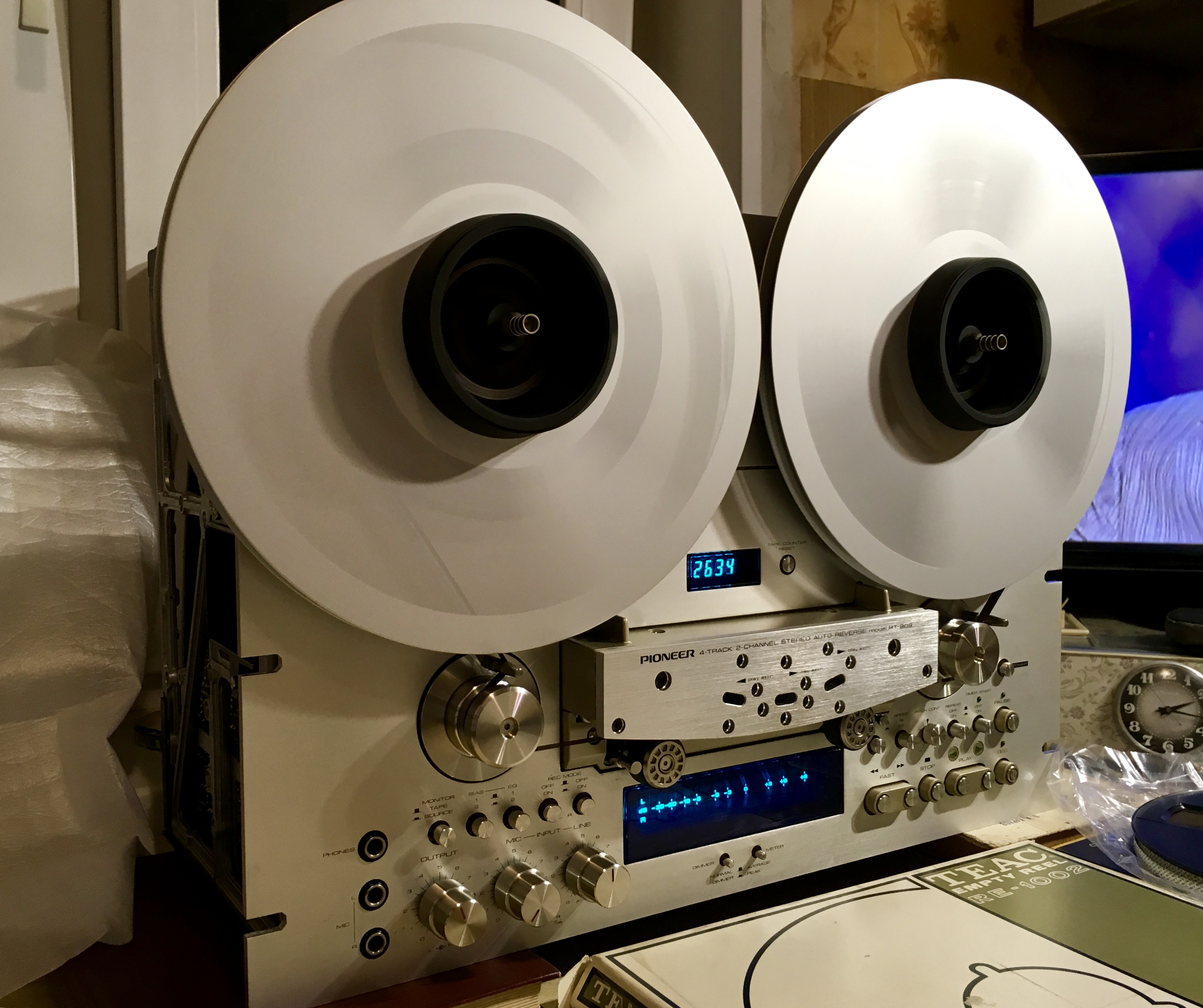 Наладка нового Пионера из заводской упаковки подошла к концу. Вот краткий перечень основных произведённых необходимых с ним операций и резюме на данный момент. 1. Точная настройка блока головок по СМ (указаны допуски в мкм следования ленты по МГ). Была с завода не точная. Хотя, можно подумать, что кто то когда-то чуть покрутил: на шлицах настроечных винтов есть следы. Возможно, все таки заводские. Т к очень вероятно, что распечатан он был все таки первый раз, мной. Далее, косяки фирмы стопудово: 2. Неточная настройка уровня 250 нВб (+3дБ по СМ), настроено по верной 100% тестовой ленте, проверенной неоднократно. И берегущейся как зеница ока. АЧХ по ней воспроизводится на этом Пионере так, будто на нём отстроенном и записана. Вообще без малейшего завала по всем частотам. 3. Точная настройка записи по Maxell UD, на обеих скоростях 9 и 19, была кривая и по ачх и по каналам с завода. (Конденсаторы проверены - отличные.) Пишет изумительно, неотличимо от оригинала, полностью выдает паспортные данные с запасом. При максимальном подмагничивании - один в один, и снаружи есть внешняя регулировка подмагничивания и эквализации. Можно добавить ещё до +6 дБ по ВЧ. Тогда частотка сместится c 25 до 35 кГц на UD. 4. Это первое что сделано: полная точная наладка ЛПМ, силы подмотки, торможения и пр. Было настроено опять так себе на заводе. 5. Установлены новые пассик и ролики. Резина прибывшая из США, пассик отличный, ролики пришлось долго скрупулезно устанавливать, находя наилучшее положение на втулках, т к они неидеальные и немного «били», но удалось посадить их (на керосин) так, что встали как влитые и не бьют почти. На КД это не влияет, два вала к тому же. Аппарат высококлассный. Детали все превосходного качества, исключаяя резиновые ролики и пассик. Внутри очень хорошо сделан, все на высшем уровне. Необычные закрытые настроечные резисторы. К сожалению, не видно в каком положении они, когда крутишь. Шикарные головки. Грамотная система двух валов - не тянет пленку со зверской силой, как, например, в Teac 2000. Вполне нормально. Пассик тоже не болтается при переключении реверса. Система натяжения ленты, естественно, хуже чем в Revox A700 и иже с ним. Но работает. Очень нестандартный БГ. Головки крепятся к его лицевой части, нельзя аппарат класть на морду или как то её задевать (чем устройство блока головок совершенно отличается от других аппаратов. У Ревокса, опять же, есть внешний защитный кожух. Сами головки острые, высококачественные. После ювелирной настройки АЧХ абсолютно одинаково читается как в прямом направлении, так и в реверсе. Аппарат сделан качественно и на совесть. А вот настраивать всё как следует, это большой труд. На заводе им не занимались.