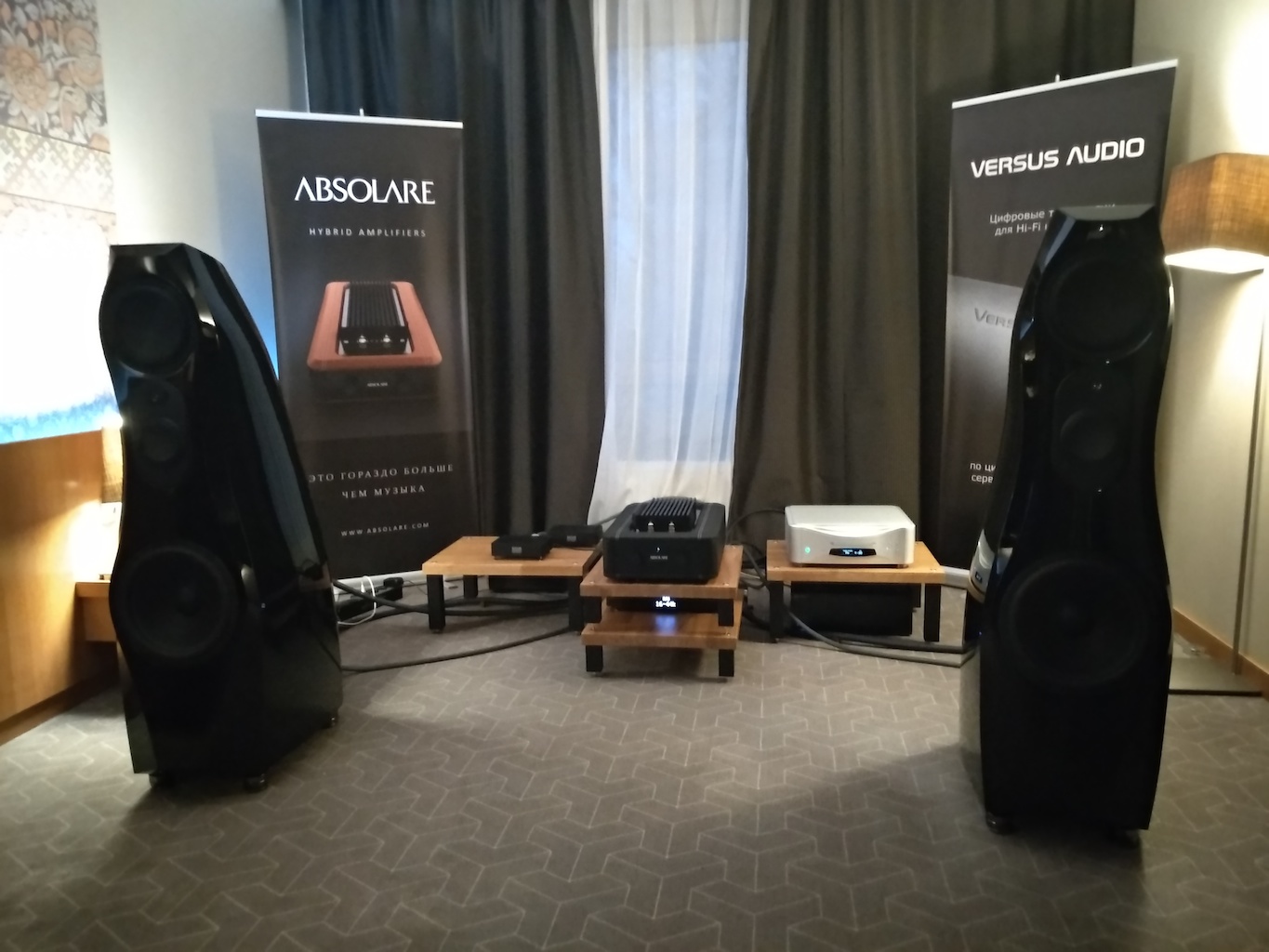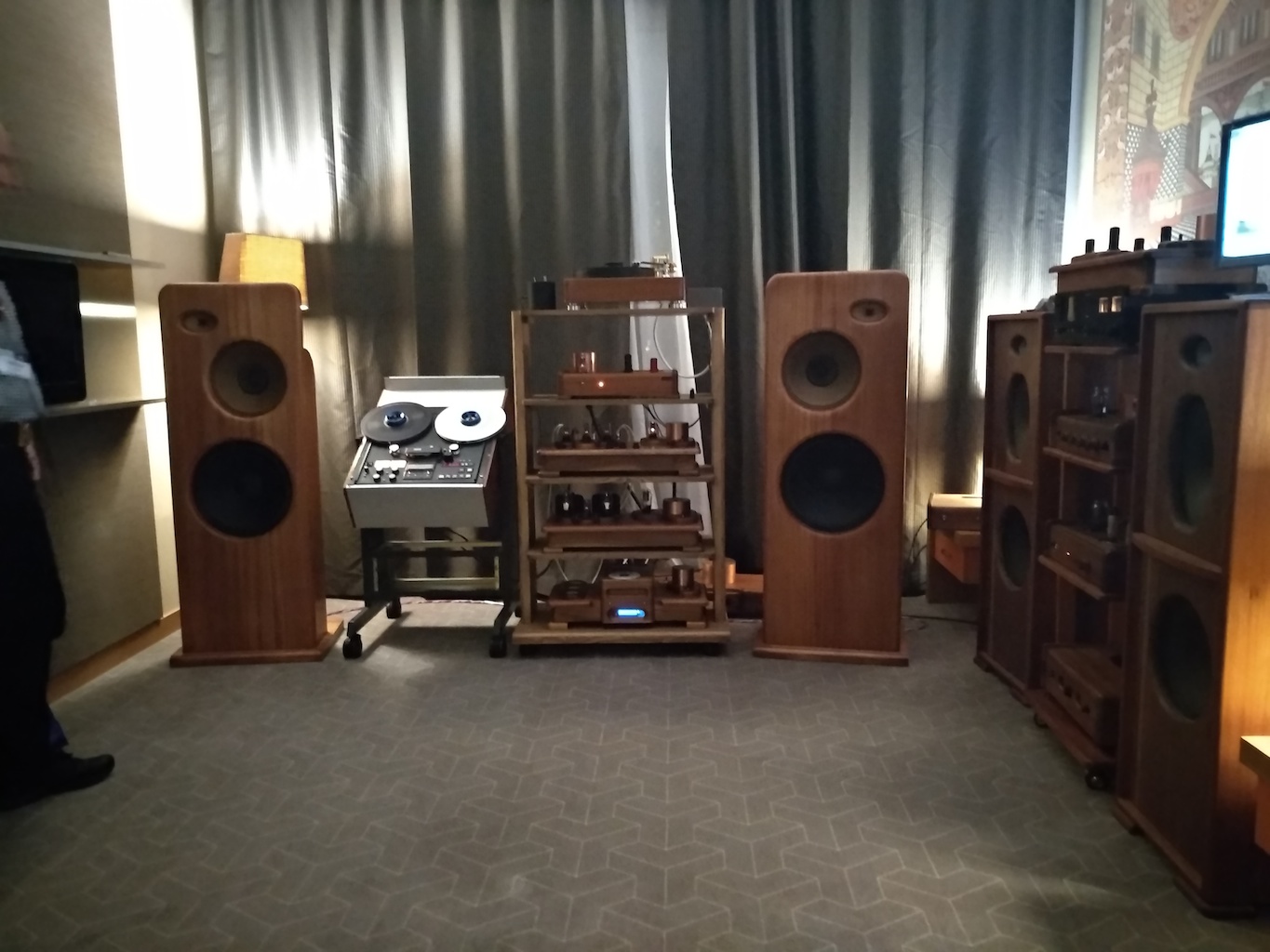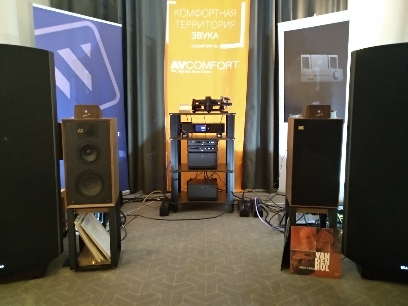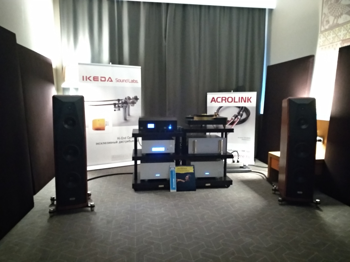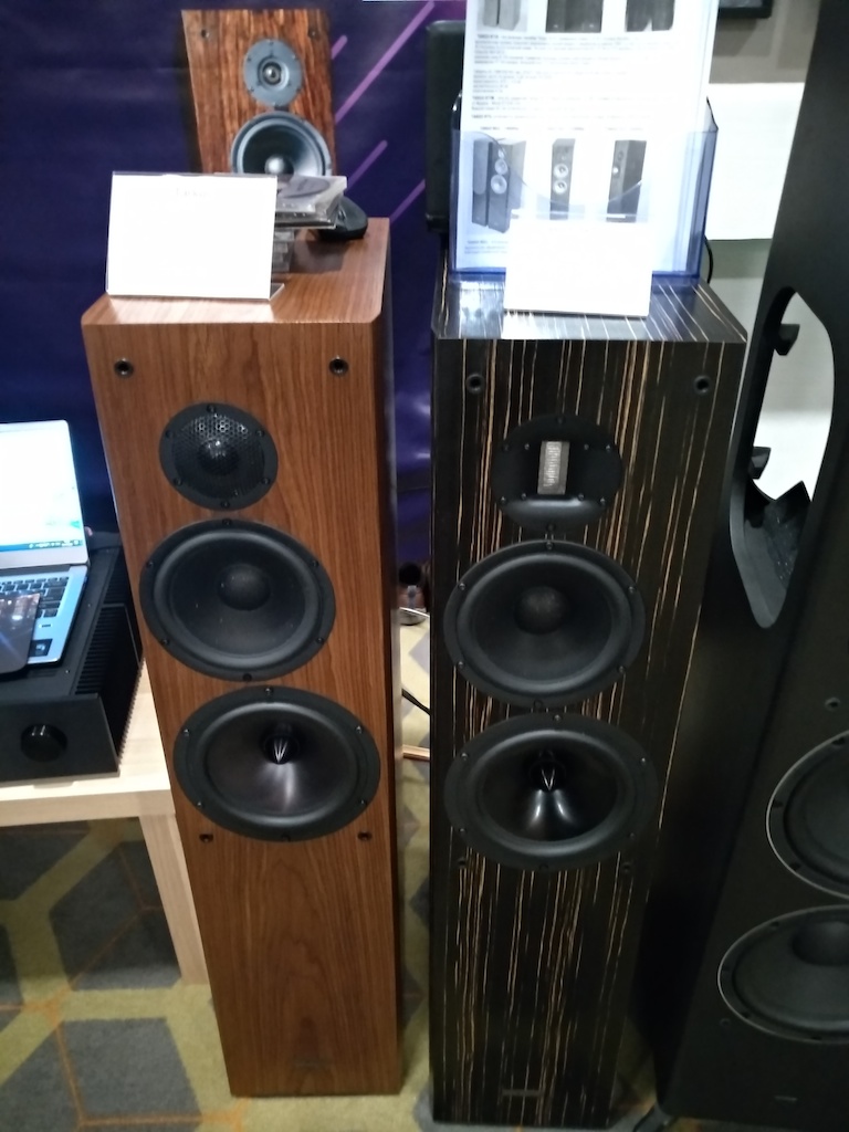 И еще одни (тоже не дешевые) АС с подходящим для меня звуком (но не ценой) - Sonus Victor на фото ниже, здоровые трехполосные полочники, к сожалению не влезли в кадр, сидел на первом ряду.