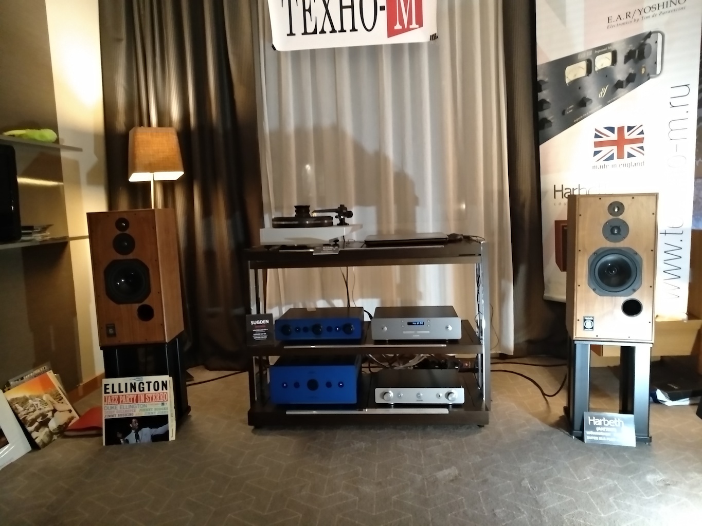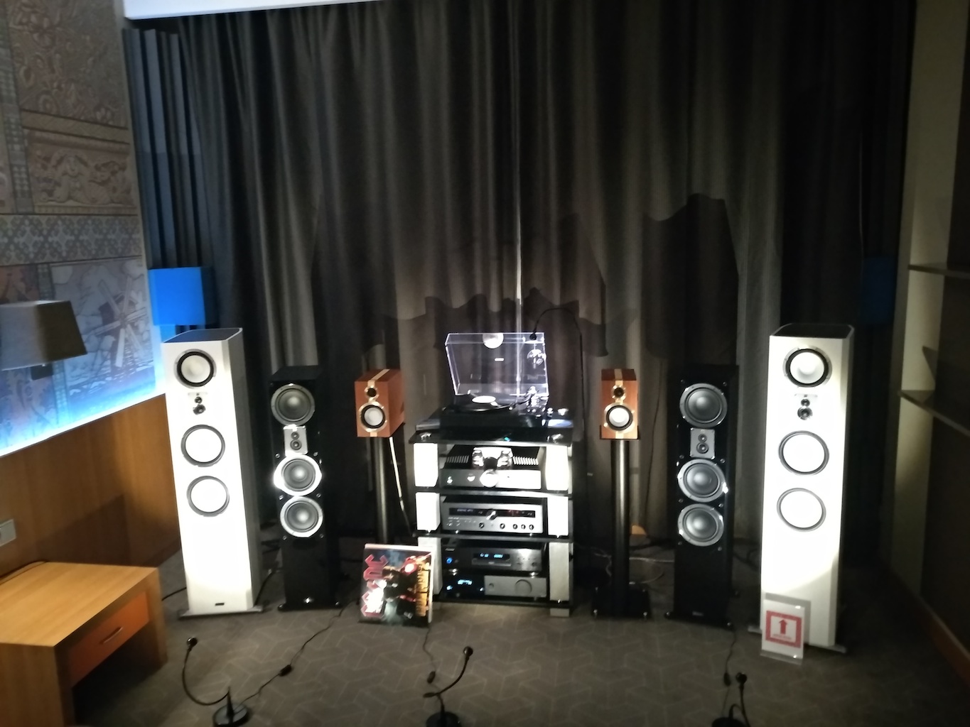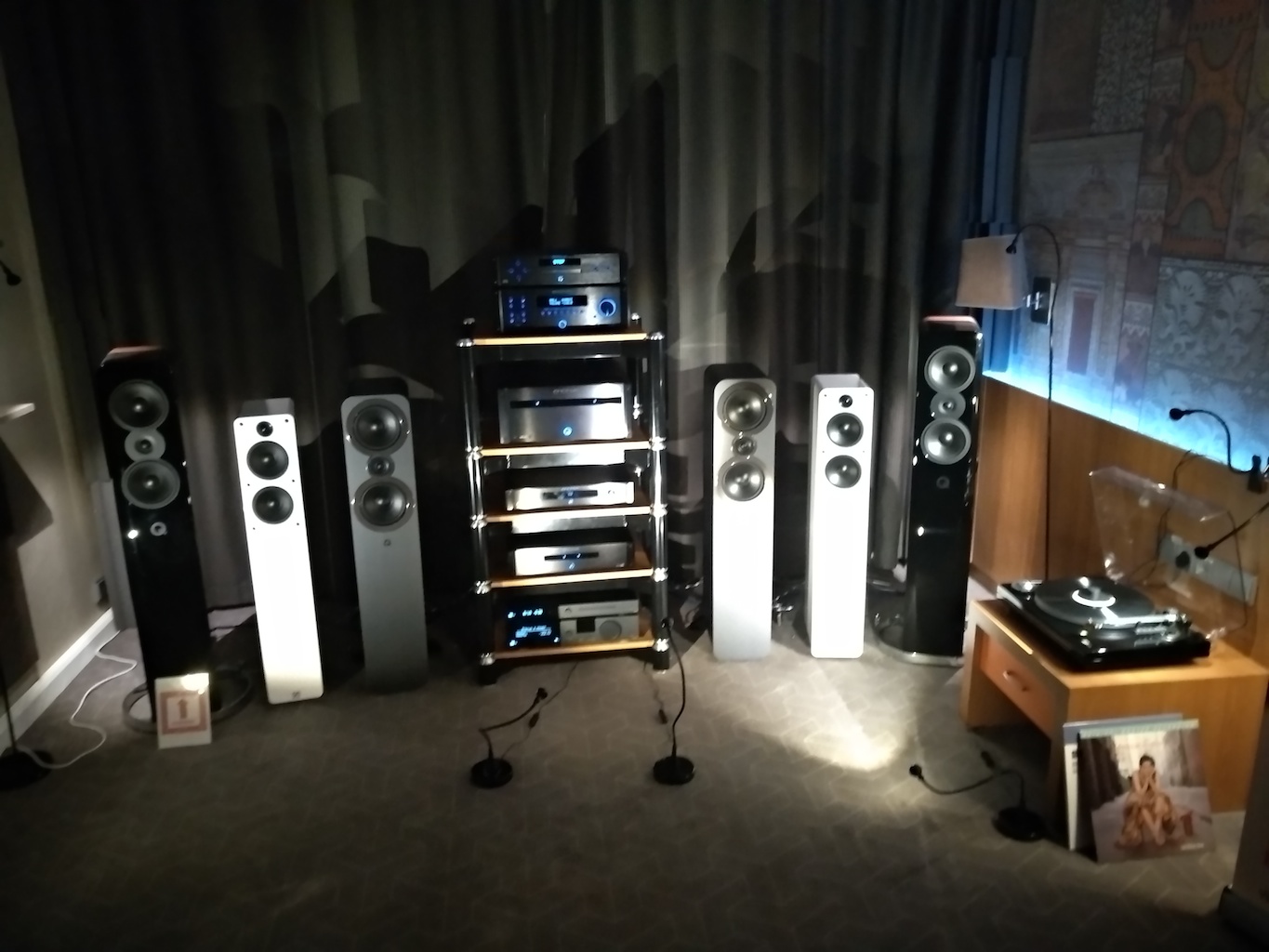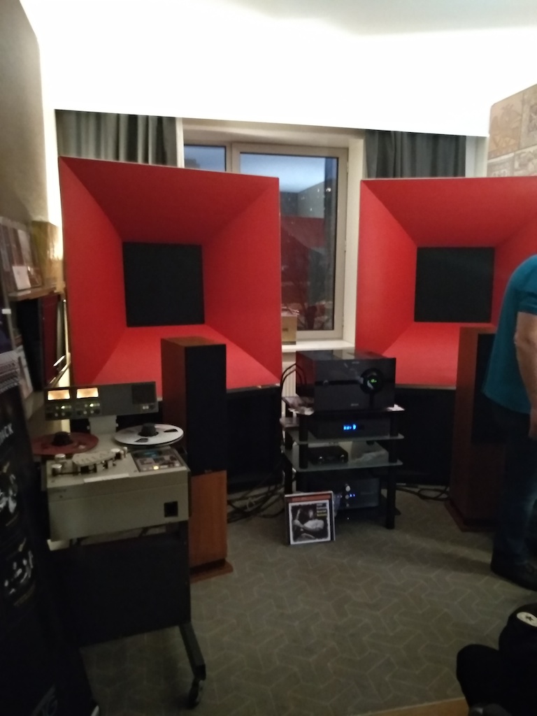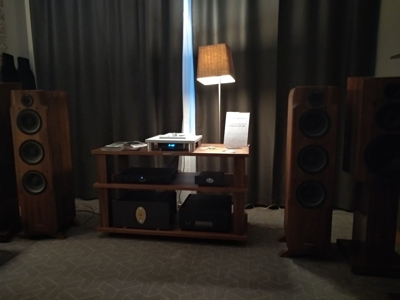 И еще одни (тоже не дешевые) АС с подходящим для меня звуком (но не ценой) - Sonus Victor на фото ниже, здоровые трехполосные полочники, к сожалению не влезли в кадр, сидел на первом ряду.