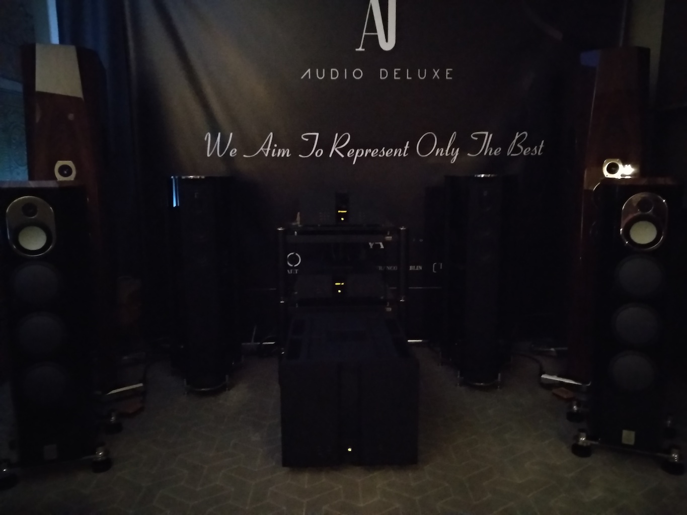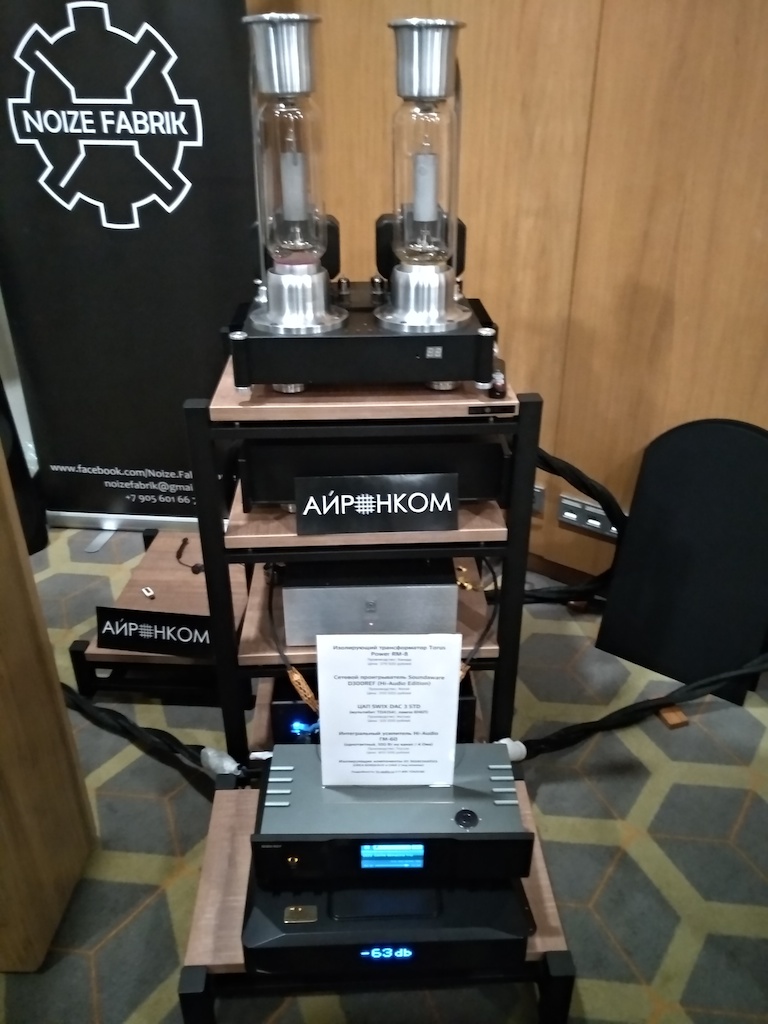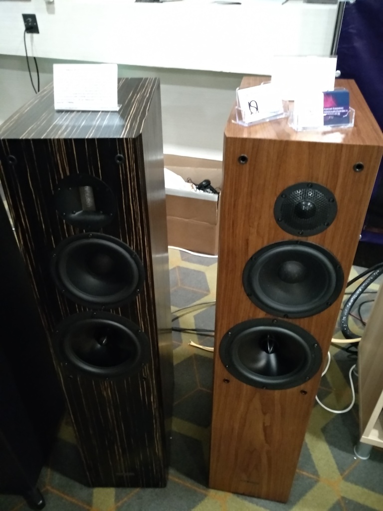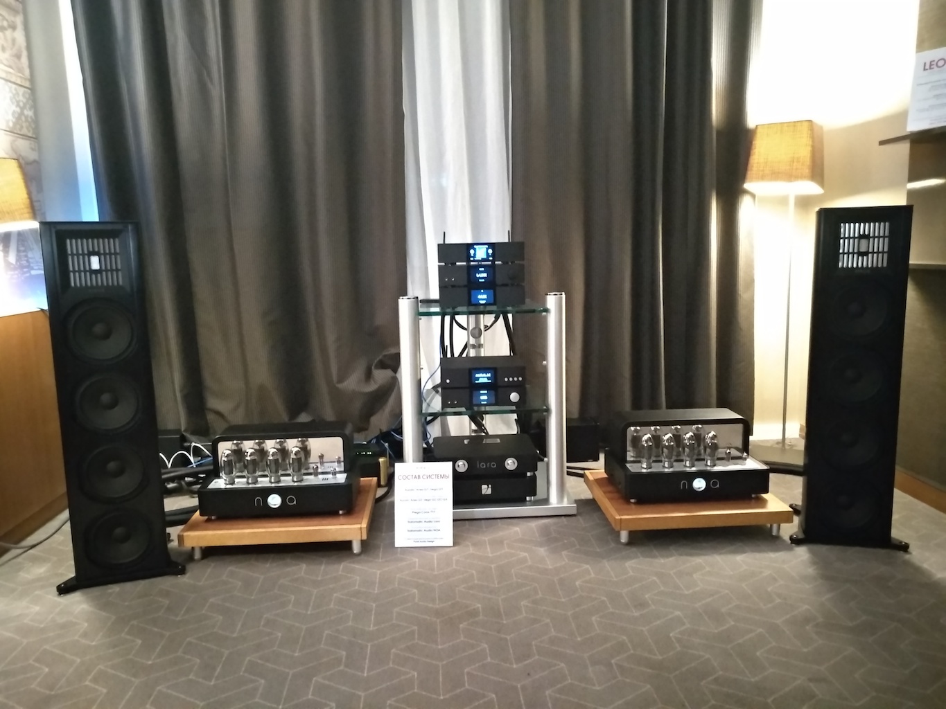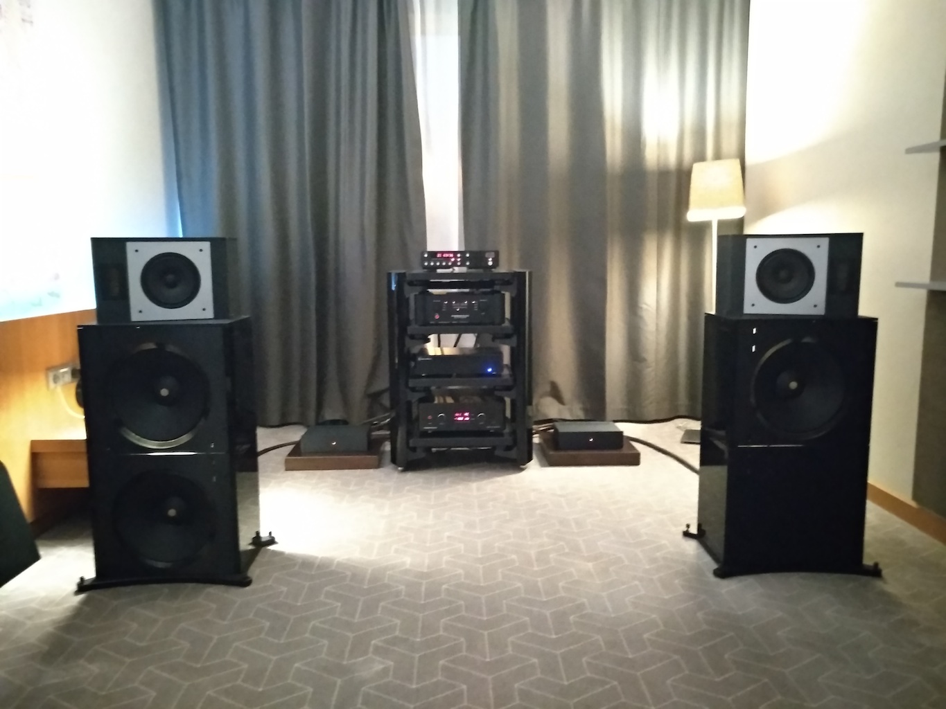 И еще одни (тоже не дешевые) АС с подходящим для меня звуком (но не ценой) - Sonus Victor на фото ниже, здоровые трехполосные полочники, к сожалению не влезли в кадр, сидел на первом ряду.