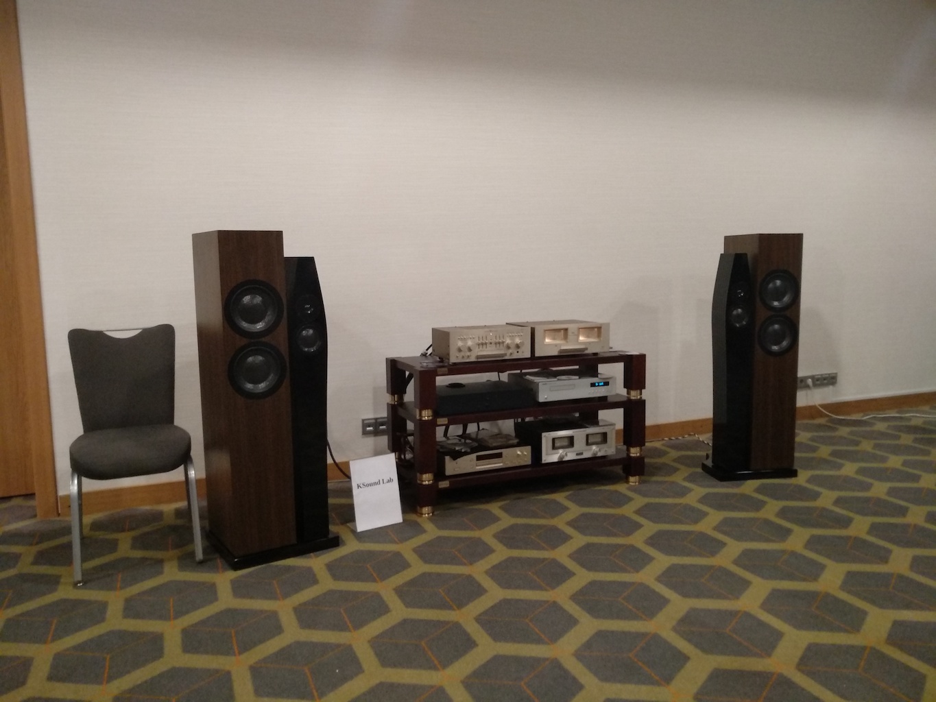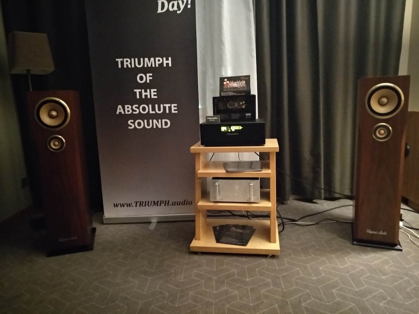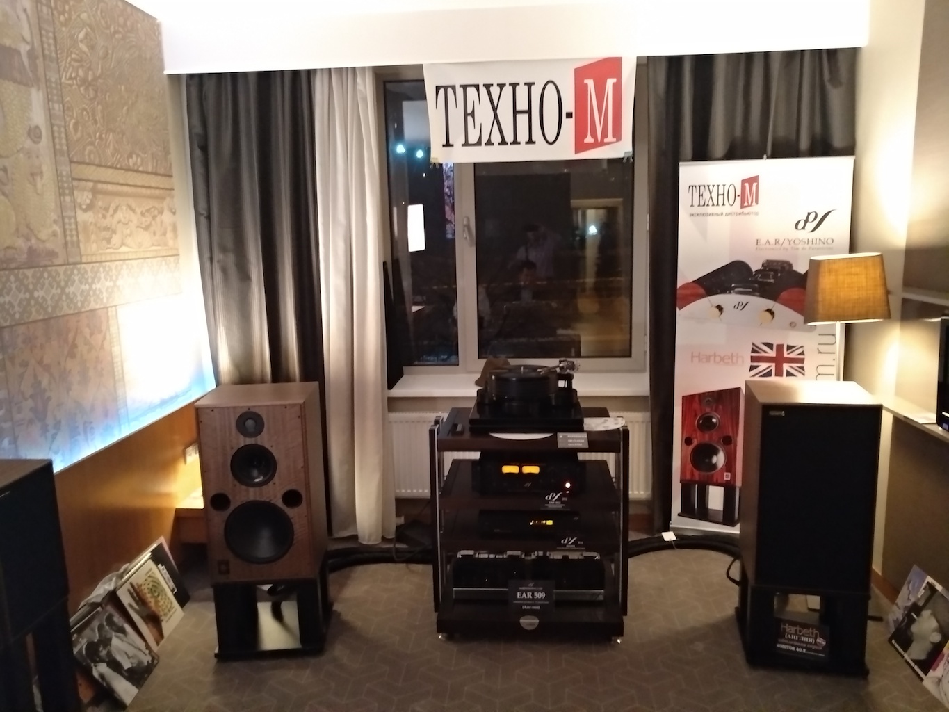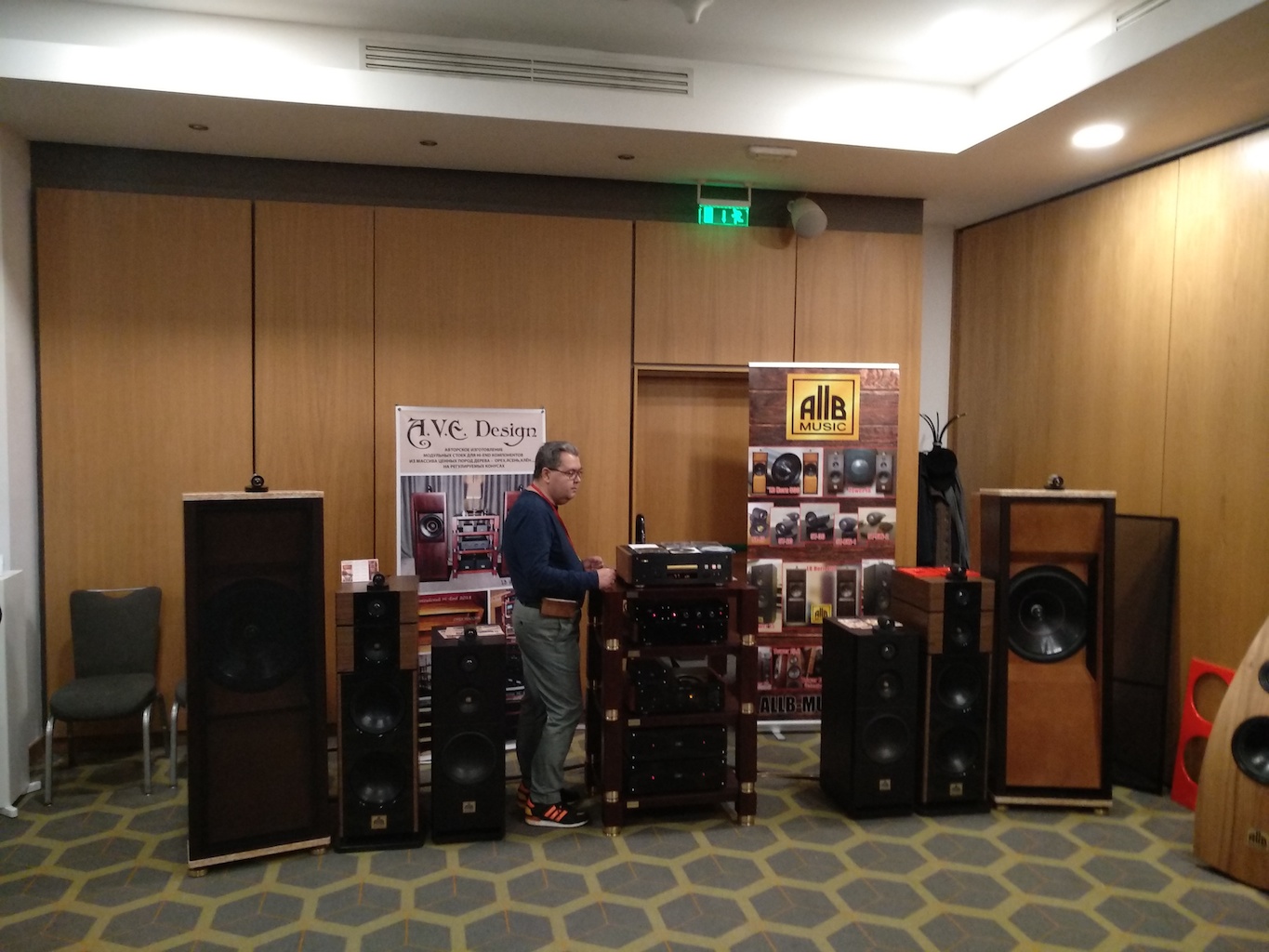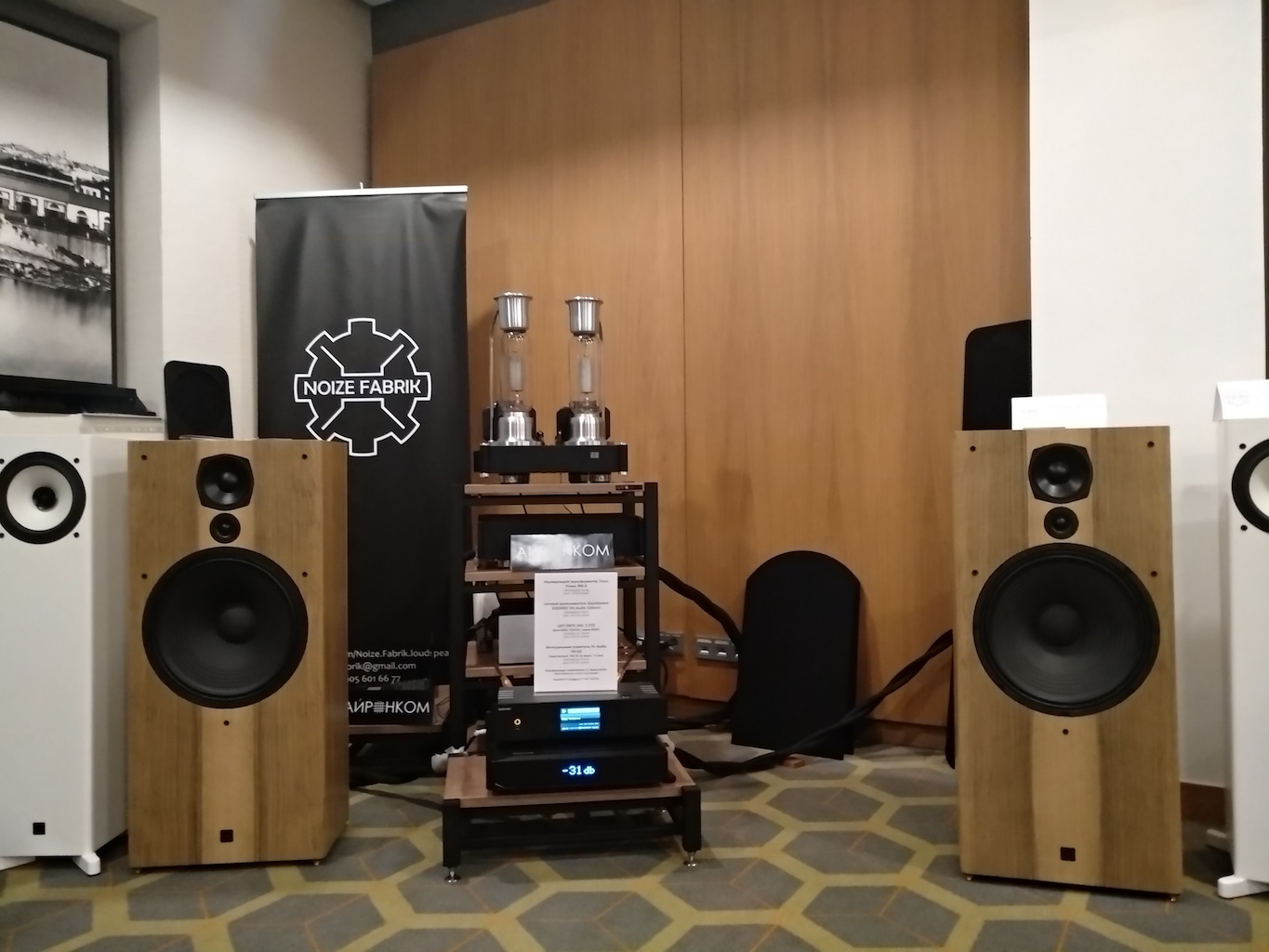 И еще одни (тоже не дешевые) АС с подходящим для меня звуком (но не ценой) - Sonus Victor на фото ниже, здоровые трехполосные полочники, к сожалению не влезли в кадр, сидел на первом ряду.