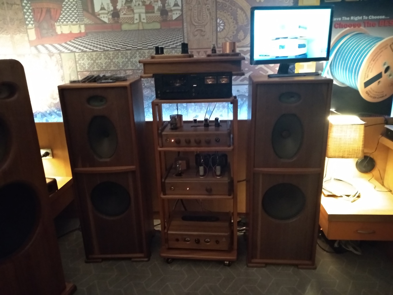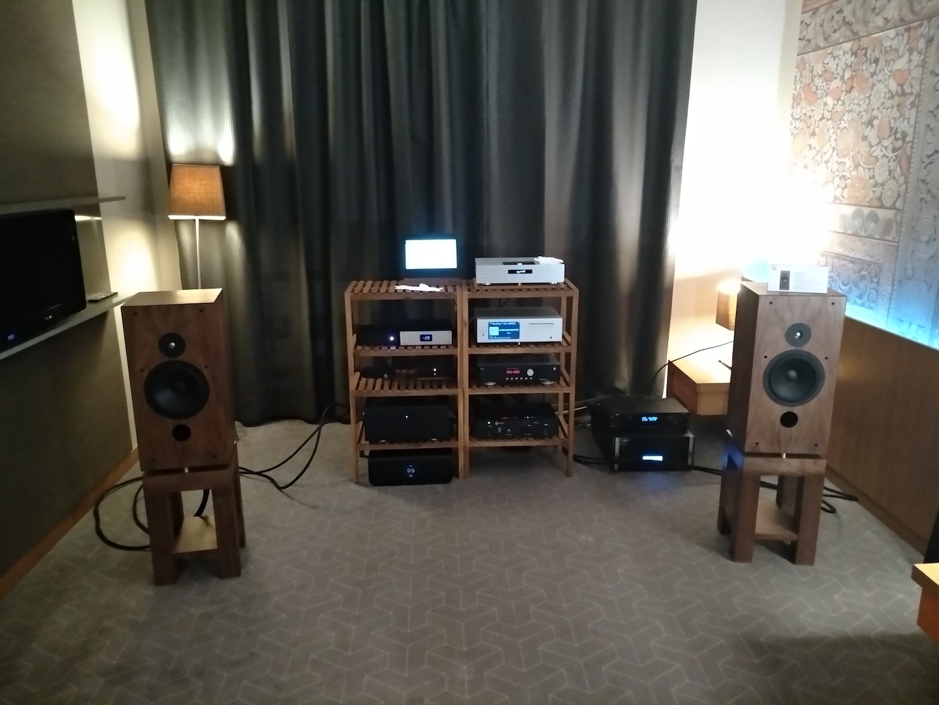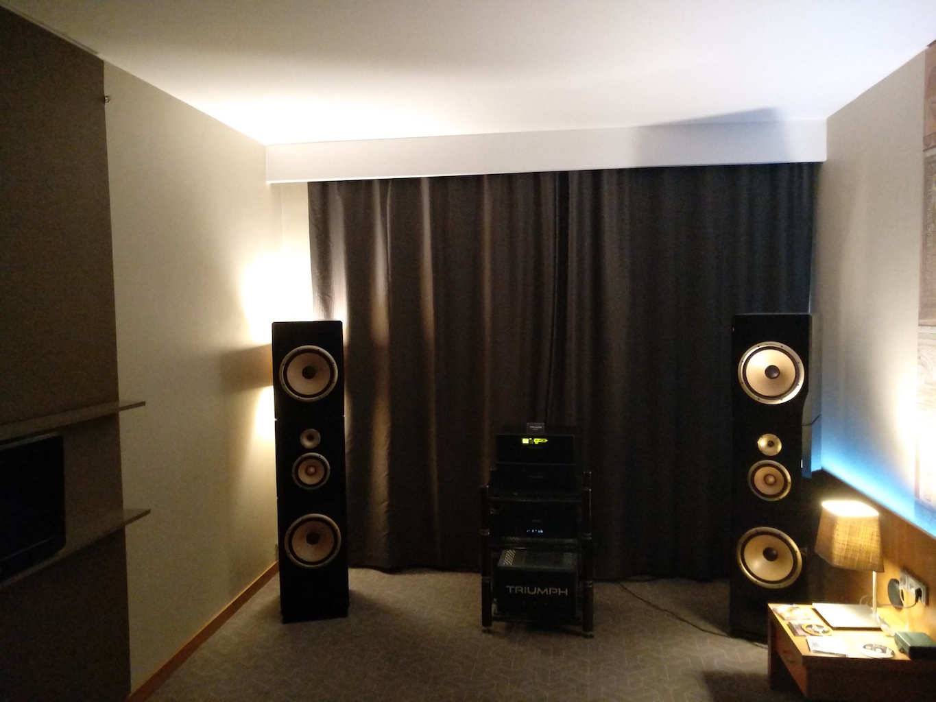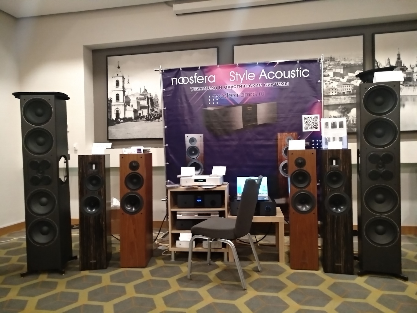 И еще одни (тоже не дешевые) АС с подходящим для меня звуком (но не ценой) - Sonus Victor на фото ниже, здоровые трехполосные полочники, к сожалению не влезли в кадр, сидел на первом ряду.