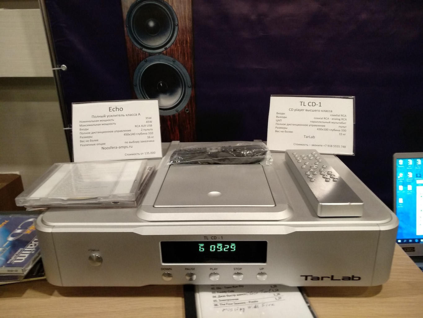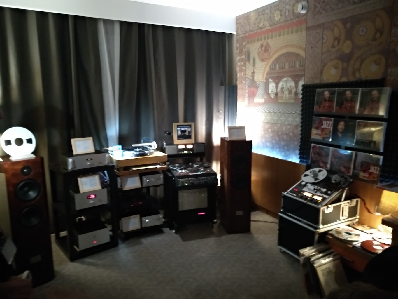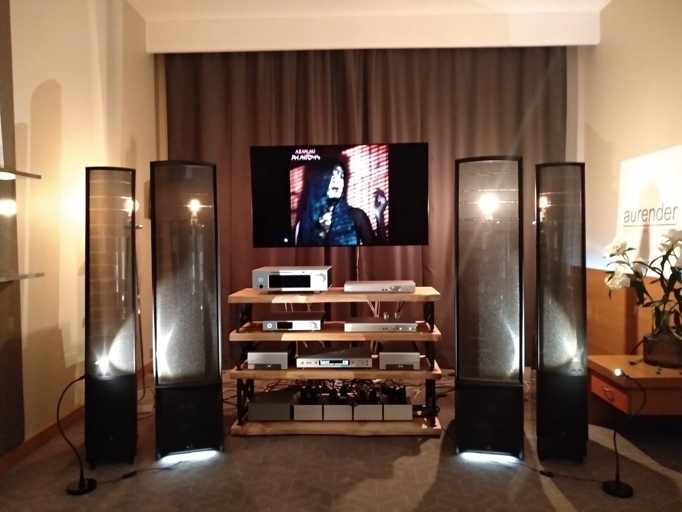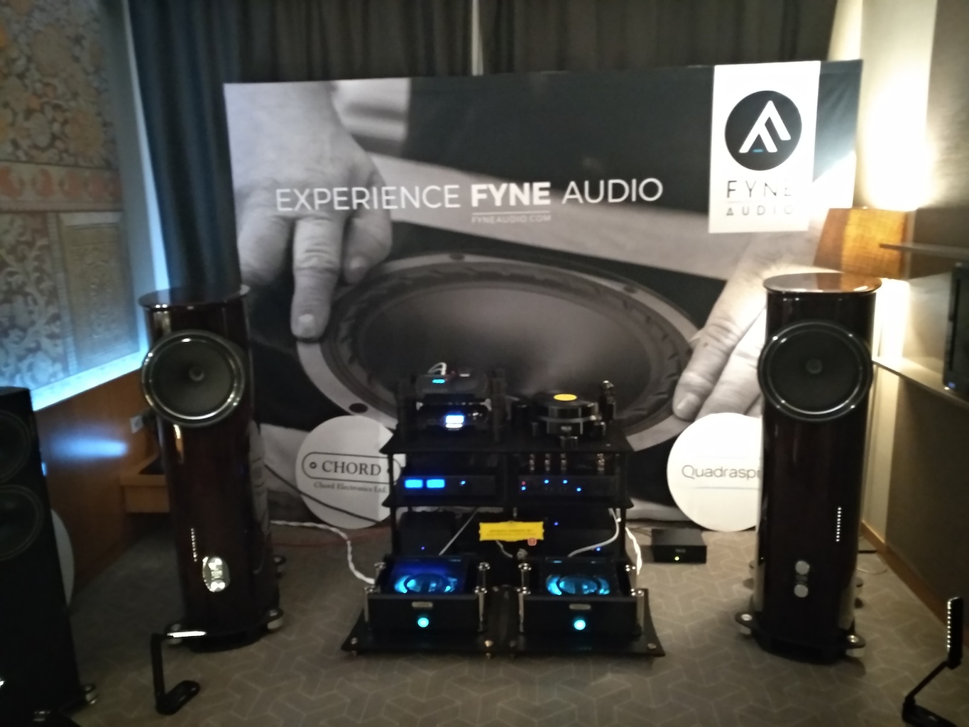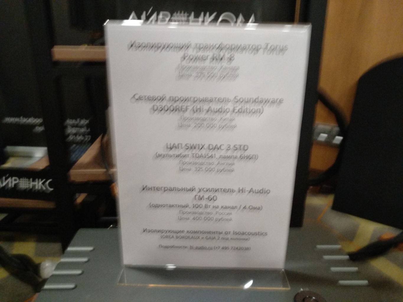 И еще одни (тоже не дешевые) АС с подходящим для меня звуком (но не ценой) - Sonus Victor на фото ниже, здоровые трехполосные полочники, к сожалению не влезли в кадр, сидел на первом ряду.