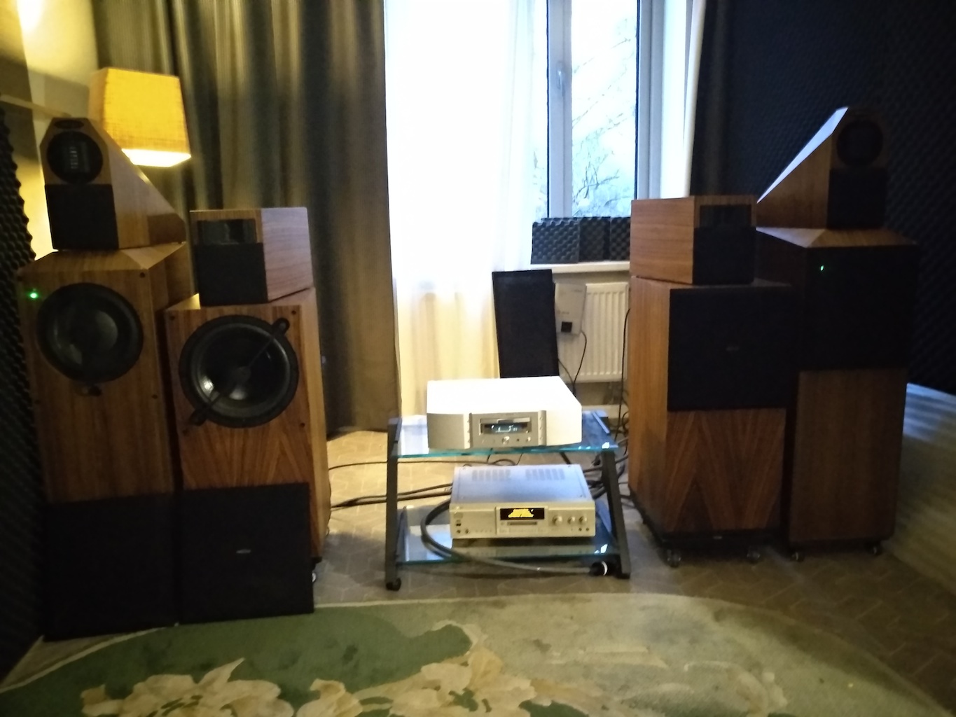 Как эти Кастеллум звучали. Пока что у меня двоякое впечатление о них. С одной стороны, у них просто умопомрачительная способность к реалистическому воспроизведению тихих звуков. Это характерно для всей акустики Буткарева. Очевидно в первою очередь из-за чувствительности и огромных 15" лопухов в НЧ на бумажном подвесе.. С другой стороны было слышно небольшое "подгуживание" в районе нижних СЧ, да и ИМХО не в одном месте. Хотя это ИМХО больше обусловлено неудачным расположением (см фото), да и сам автор жаловался о неудачном месте. Концепция этих АС близка к Транспульсам, акустическое оформление - акустическое сопротивление, как и у Магнат, но порт выведен в пол (у Магнат вперед) , высота шипов очень маленькая и заполнение порта более плотное, по словам александра, оформление все же ближе к ЗЯ. АС будут также демонстрироваться на РХЭ,, так что послушаем в тамошних условиях. Цена.... Но тут конечно проигрыш Магнатам аж в полтора раза