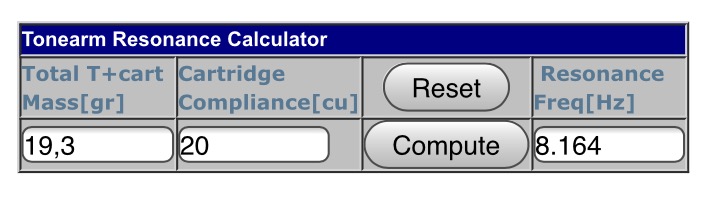 Вставьте сюда эфф.массу вашего тонарма и учитывая общую массу вашего картриджа( вместе с шеллом и проводами) при заданной подвижности(комплиансе) получите область работы системы.