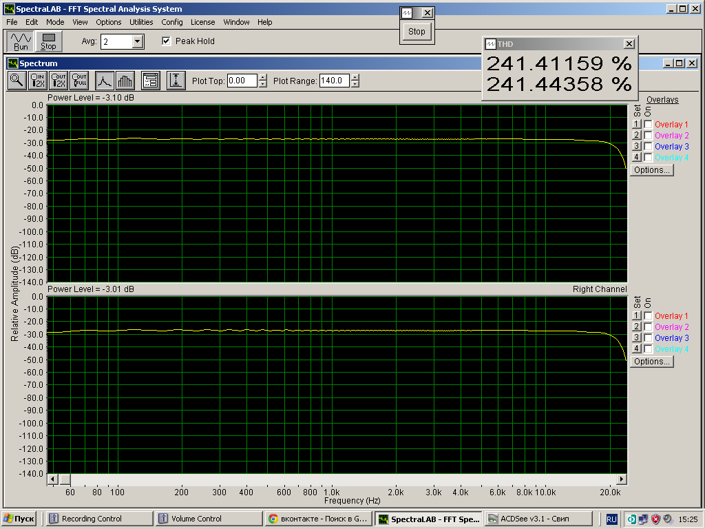 Народ, а вот объясните, в чем прикол мерить "через хвост" (FFT). Есть куча программ для измерения параметров АС, которые делают все честно, т.е. свип и автоматический учет задержки (до нескольких секунд, вполне применимо для сквозного канала) между выходом гкч и входом карты. Т. е. фактически эти программы состоят из двух модулей - гкч и "электронного самописца", стартующего по появлению сигнала на входе (т.е автоматический учет задержки и задержка даже вычисляется). Время записи и свипа - одинаково. Мало того, некоторые из них (я пользуюсь FuzzMeasure) позволяют записать свип, а потом проиграть его и "самописец" нормально все отработает.