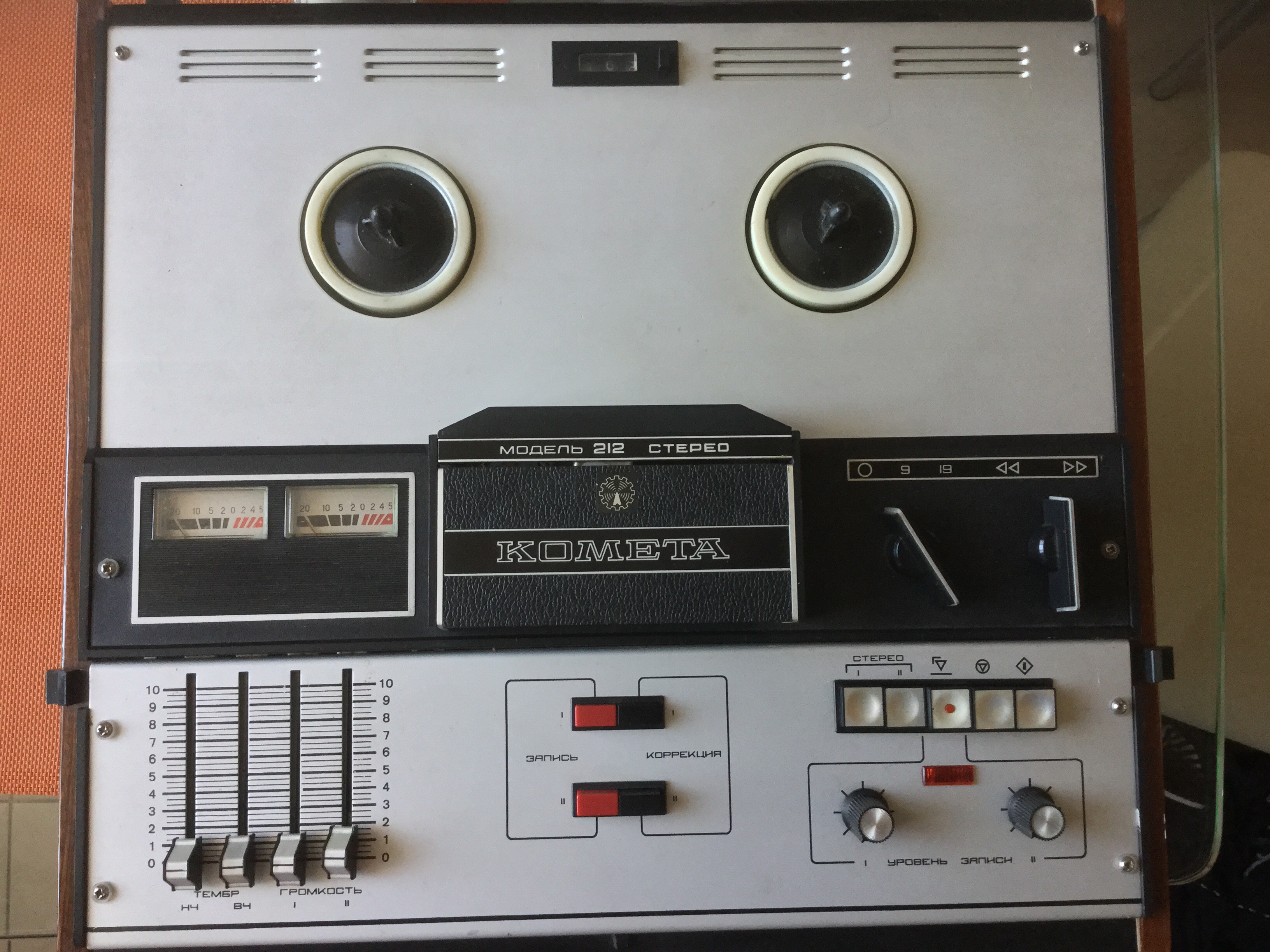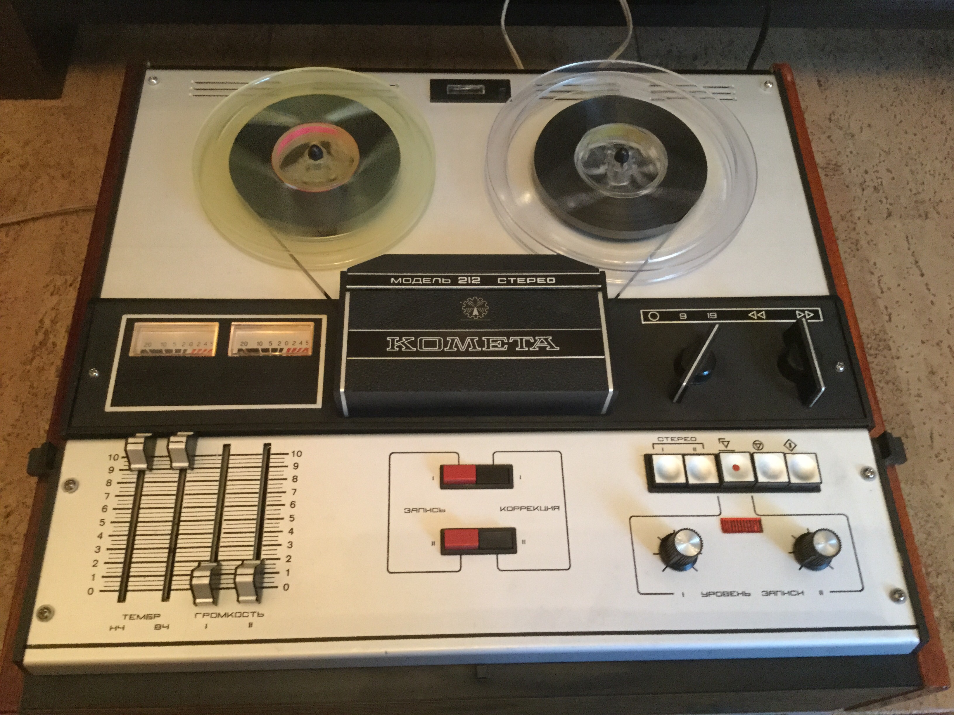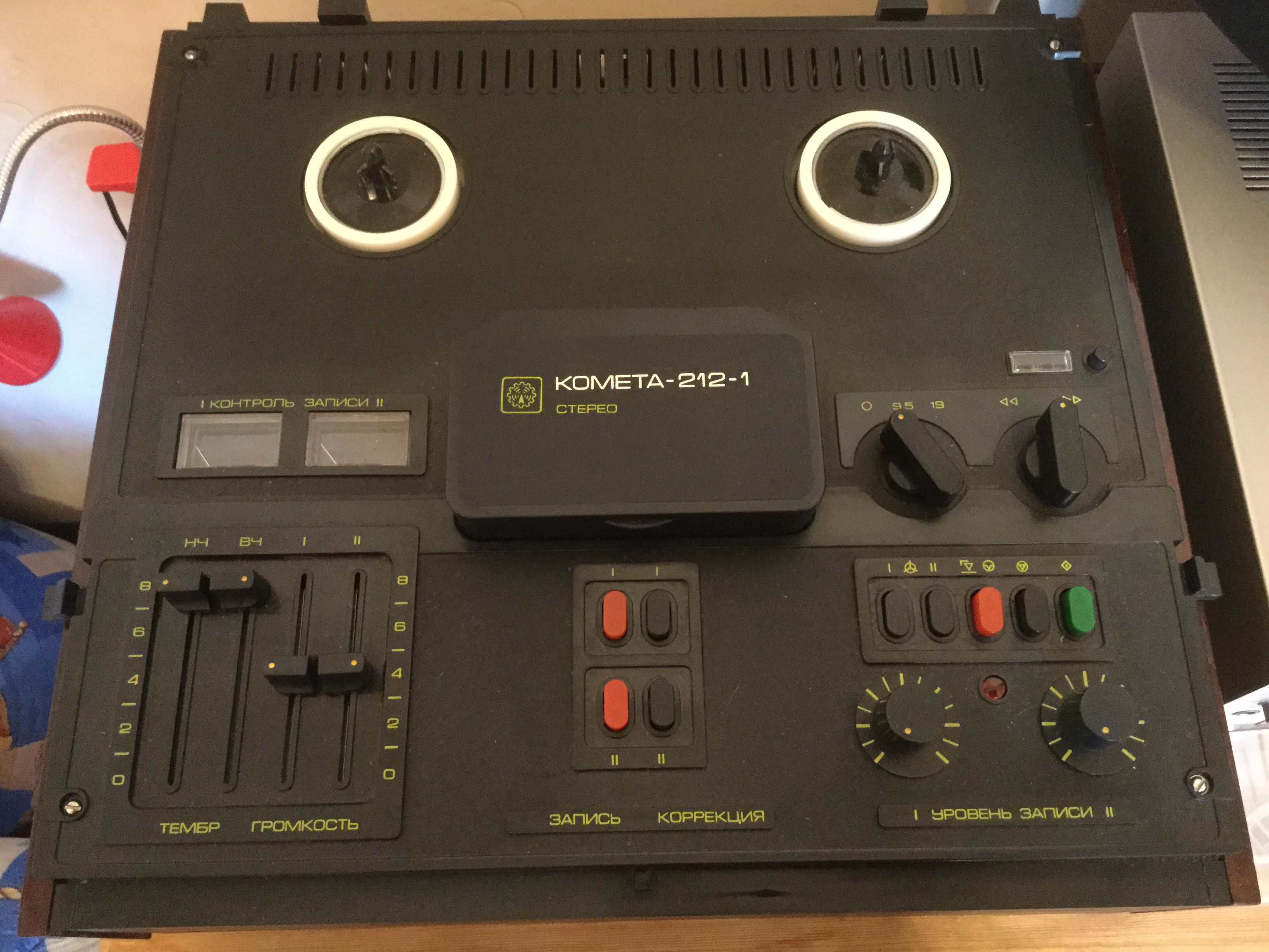 Работает, старушка. Веутри, правда, что-то тарахтит.. Сделаем.. Кто не знает, изначально 212-я Комета была оассчитана на работу с катушками размером 15 см. В целом, очень приличный магнитофон. Двухмоторный.. Позже была модификация 212-1 см на фото. На нее уже вставали 18-е катушки. ![]()