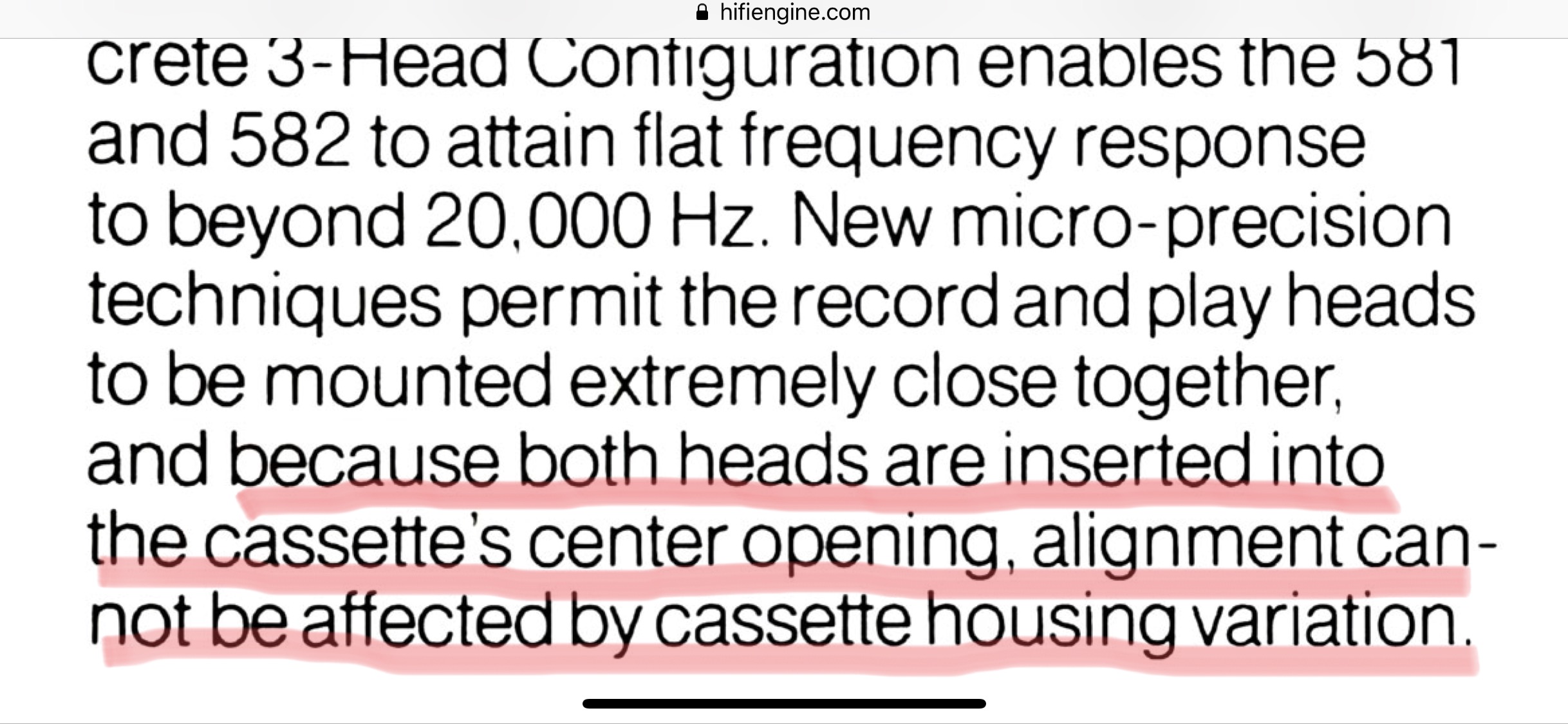 Партагас, Моя практика эксплуатации разных наков с раздельными дискретными головками выявила следующую любопытную особенность: превосходно по ВЧ воспроизводятся записи на правильно настроенных наках, даже те, которые сделаны на Накамичи с немного неточно настроенной ГВ по азимуту. Но, при условии полного и точного совпадения настроек между ГЗ и ГВ у последнего. Это актуально для наков с системой автоазитута головок записи под каждую кассету со своим, индивидуальным корпусом. Настройка между головками на каждой кассете производится настолько точная, что затем положительно влияет на воспроизведение на другом наке, даже с другим азимутом на головке воспроизведения! И такая запись на нём воспроизводится практически без потерь по ВЧ. В Накамичи 582 автоазимута ГЗ под каждую конкретную кассету нет. Поэтому, я думаю, здесь декларируется - точность и прецизионность исполнения имеющегося блока головок. Т.е, благодаря этой прецизионности, и также, работе обеих головок в одном, центральном окне кассеты, результат записи на данной 582-й модели всегда стабилен, независимо от корпусов кассет.