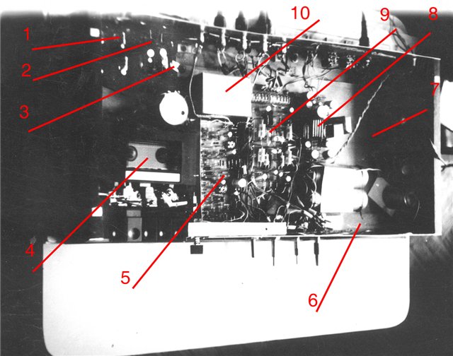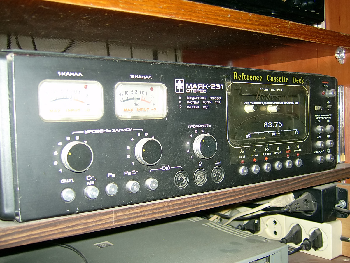 Реал-тайм видео о прохождение Убийцей разных краш-тестов (работа СДП на высокий уровнях, стабильность уровня при записи 18кГц при -10дБ, ПАМ на ВЧ при воспроизведении 3ЛИМа, детонация при воспроизведении тест ленты) и оцифровки музыкальных фрагментов есть в сети. А на фото выше - моя первая самодельная дека-доска.))))) 1987г. Мадьярская горизонталка-пианино из Мелодии, бошка 842 (отбраковка 810), ШП на россыпухе, калибратор 40Гц(вот так решил тогда) и 15кГц, СДП, светодиодный индикатор, бестрансформаторный ГСП 120кГц. встроенный контрольный УМ 2Вт. Кассета с её записью звучала на выставке СЕМ-94 на Красной Пресне. Между ней и Убийцей была еще одна дека - модернизированный Маяк-231М (фото ниже), 1993г. тоже сендаст 810, СДП, ШП, ГСП 120кГц, подсветка стрелок и кассеты, принудительное воздушное охлаждение ЛПМ))) - но это всё еще были аппараты без сквозного канала. |