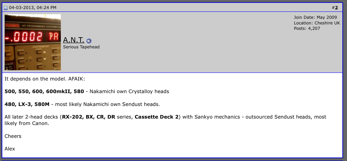 ответь на простой вопрос зачем накамичи, имея свое производство головок, которыми они так гордились, пихать в свои деки головки кэнон В LX-3 и 480 стояли головки собственного производства В RX-202, MR-2, BX, CR, DR были похожие на кэнон ГУ |