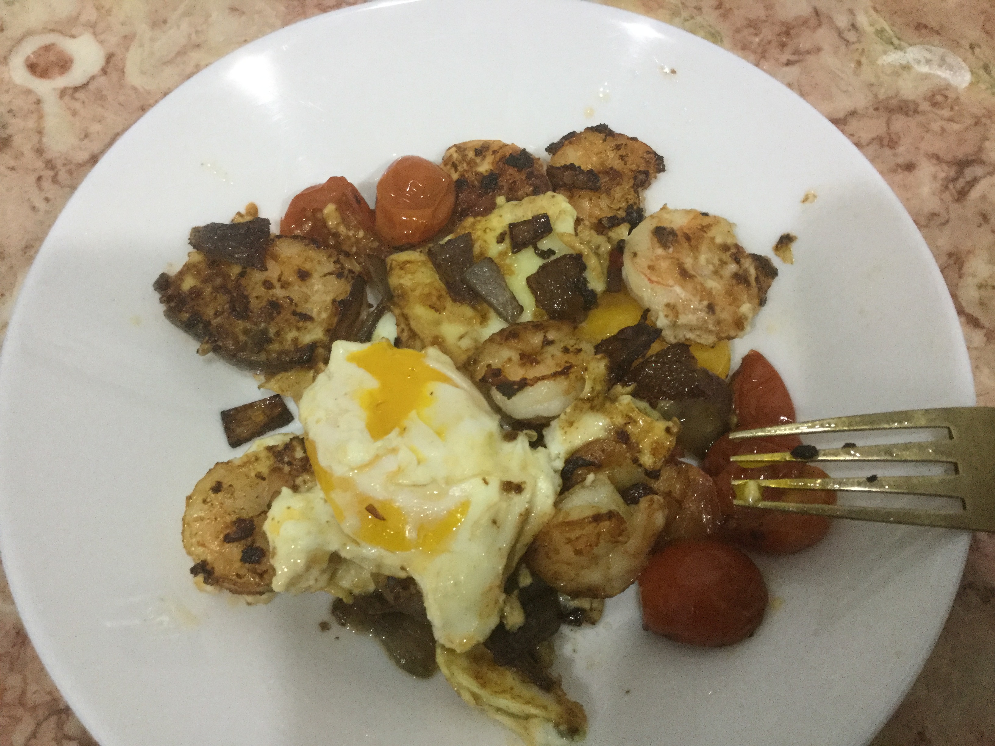 У меня на завтрак яичница с креветками, помидорами и луком.